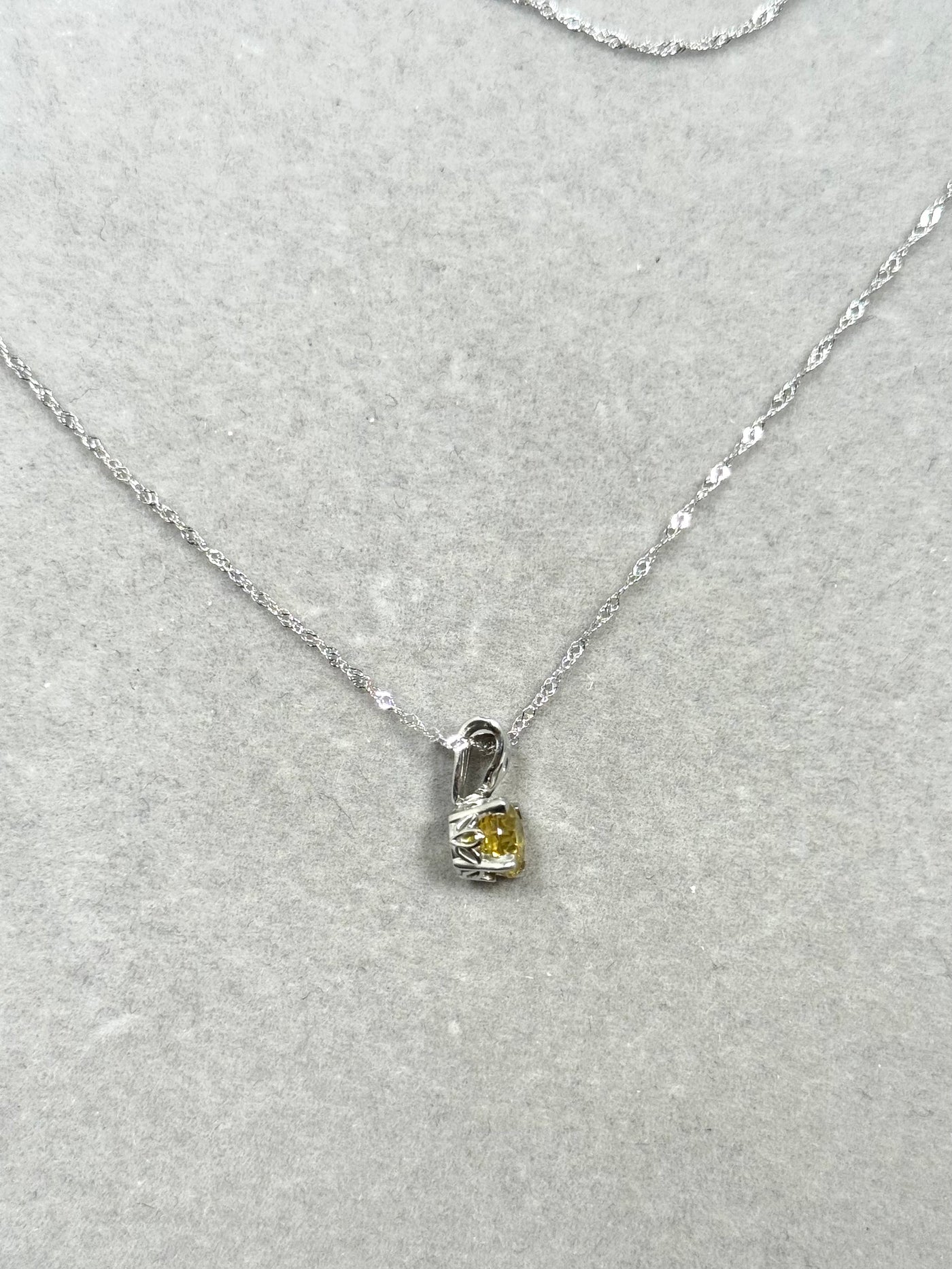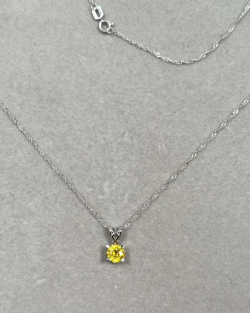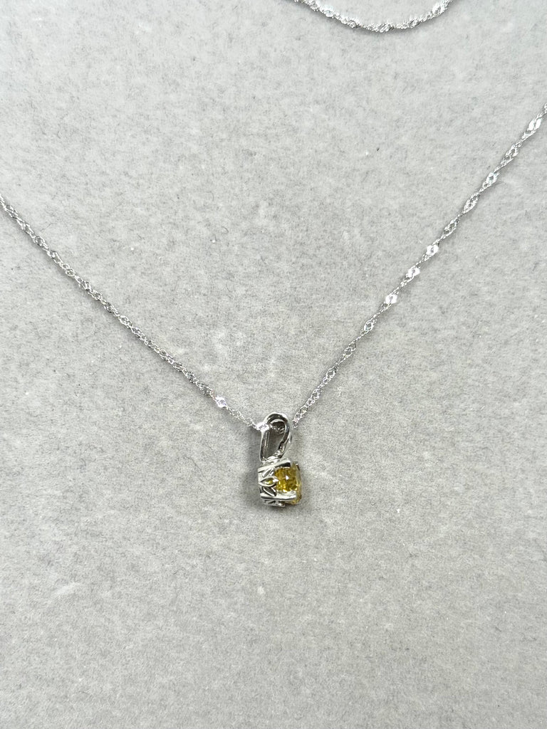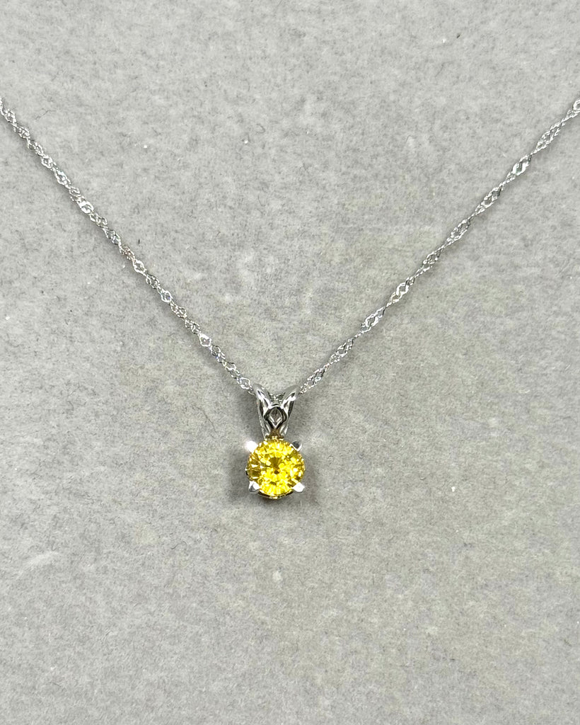 This entrancing Yellow Sapphire Scroll Solitaire Pendant features an AAA quality round Yellow Sapphire, expertly prong set in Platinum. Approximate Gemstone Weight: 0.96–1.25 Carats. The pendant is elegantly completed with an 18-inch 18K White Gold Singapore Chain, creating a luxurious balance of brilliance and sophistication.