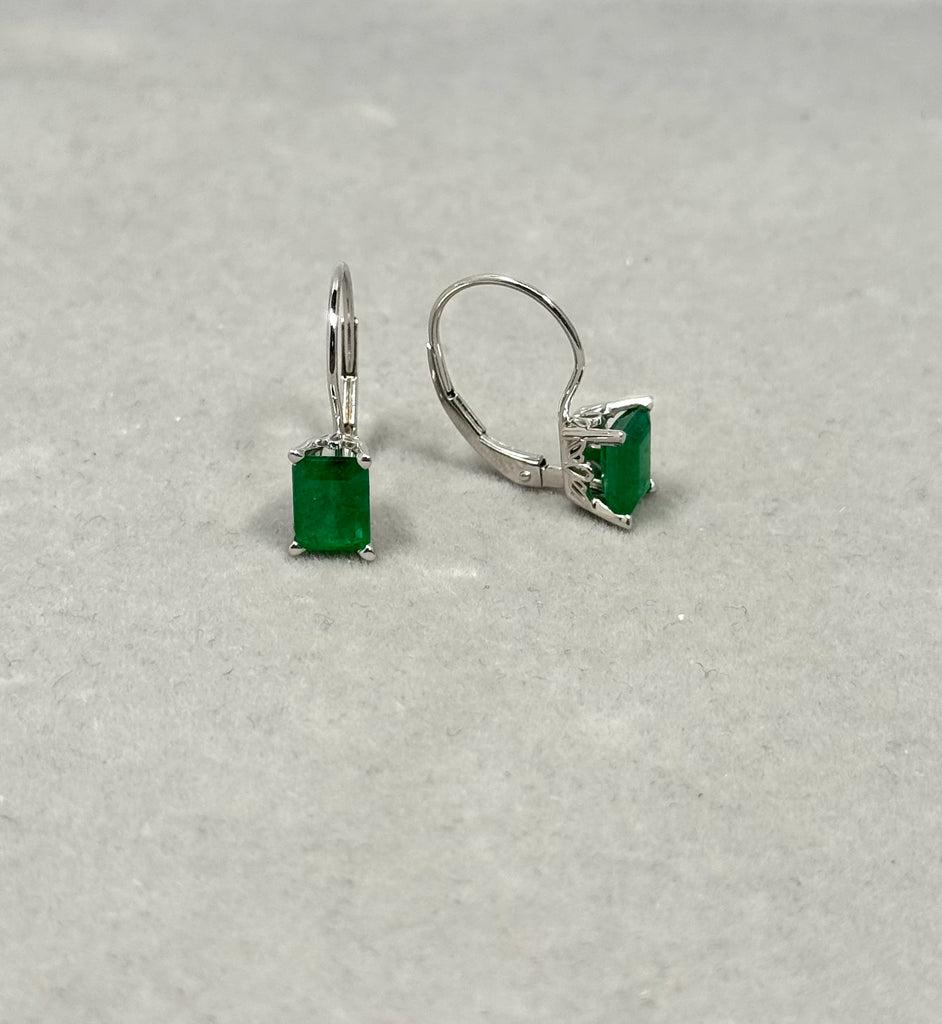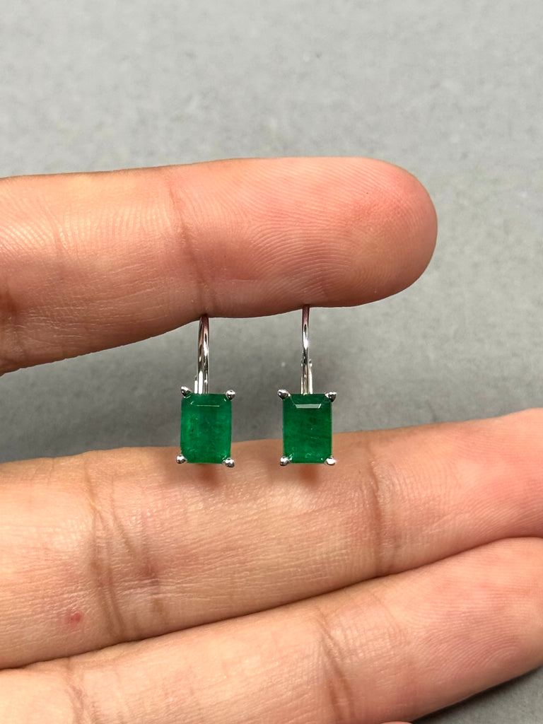 1.83–2.25 Cts of 7x5 mm AA Emerald Cut Natural Emerald Stud Earrings with Scroll Lever Backs in 14K White Gold