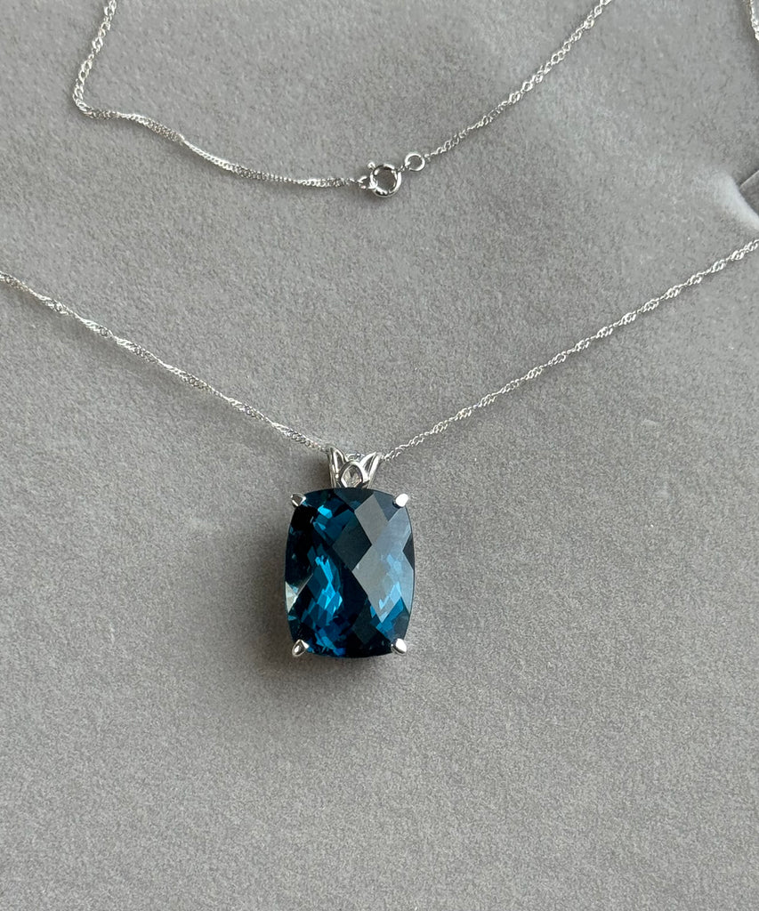 Command attention with the saturated elegance of London Blue. This statement pendant centers an AAA-grade elongated cushion checkerboard London Blue Topaz measuring approximately 20 x 15 mm and weighing about 23.27 carats. The checkerboard faceting delivers lively surface sparkle, while a refined four-prong scroll solitaire setting in 14K white gold keeps the silhouette timeless and balanced. Finished with an 18-inch 14K white gold Singapore chain for fluid shine and luxurious drape. An unforgettable December birthstone necklace—perfect for milestone gifting or as a signature centerpiece.