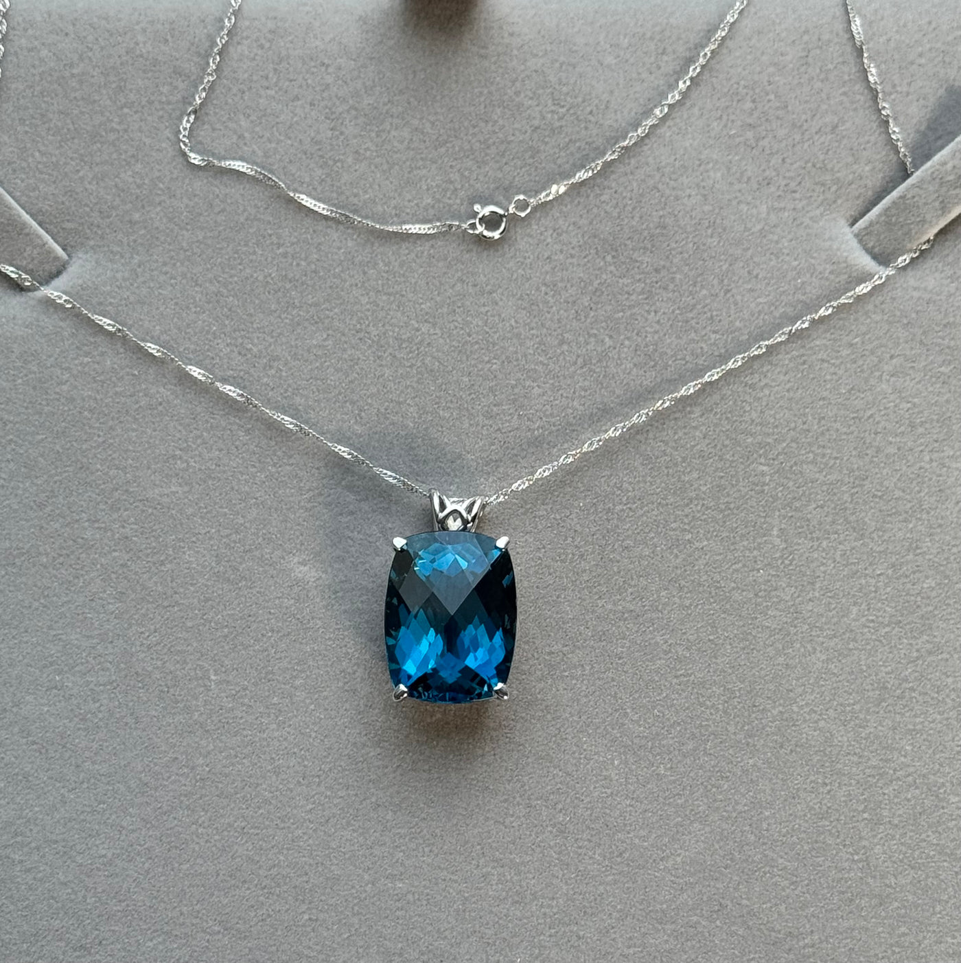 London Blue Topaz Pendant AAA Cushion Checkerboard 20x15 mm, 23.27 Ct, 14K White Gold Scroll Solitaire, 18" Singapore Chain