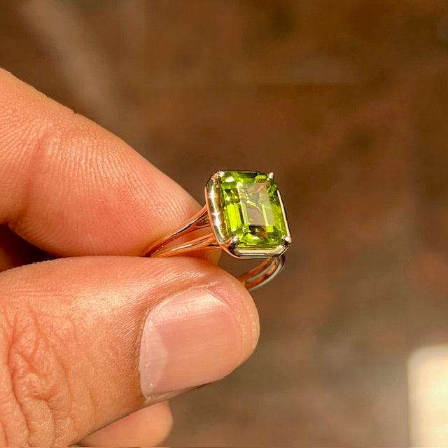3.52-3.56 Ct Emerald Cut Peridot Solitaire Ring | 10x8mm AAA Peridot in 14K Yellow Gold | Natural Green Gemstone Engagement Ring, Size 6