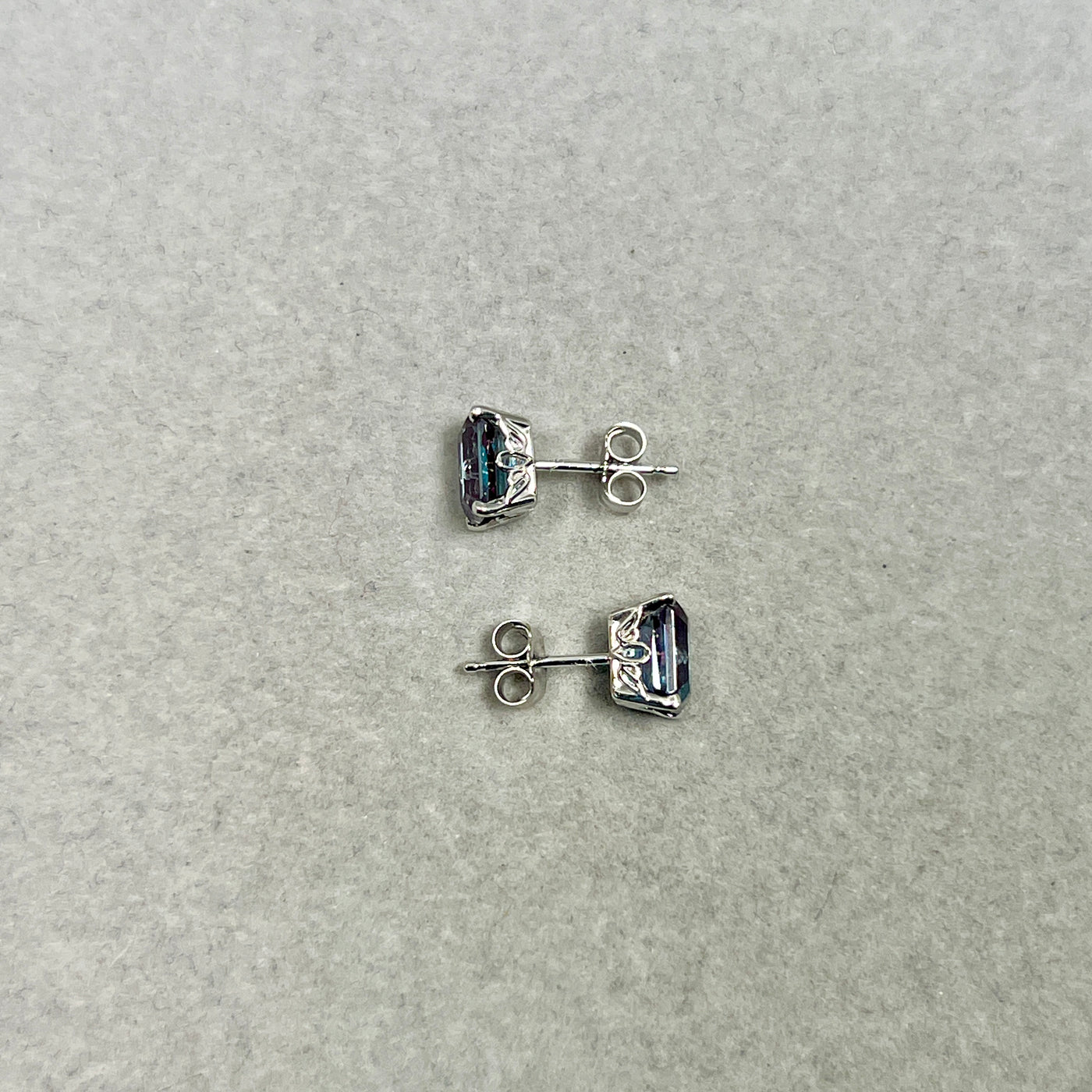 AAA Emerald Cut Russian Lab Created Alexandrite Scroll Stud Earrings 2.24–2.72 Cts 7x5 mm 14K White Gold