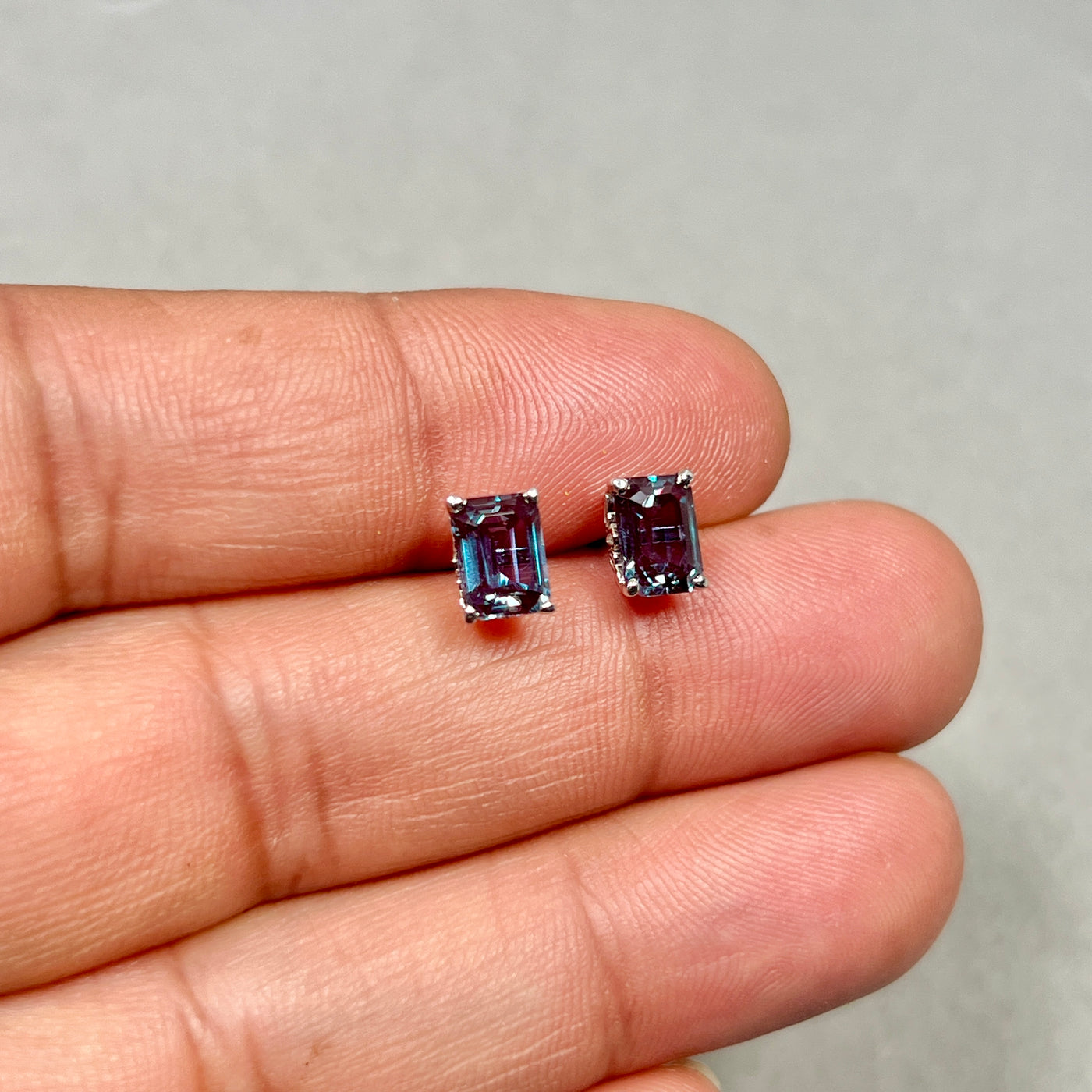 These elegant AAA Emerald Cut Russian Lab Created Alexandrite Scroll Stud Earrings feature dazzling 7x5 mm emerald-cut Alexandrite gemstones, each securely set in a refined four-prong scroll setting crafted from luminous 14K White Gold. With an approximate total gemstone weight of 2.24–2.72 carats, these earrings showcase Alexandrite’s remarkable 100% color-change effect, shifting beautifully from vivid green to rich purple under different lighting conditions. Designed to sweep her off her feet, these stylish stud earrings bring timeless sophistication and brilliance to any look.