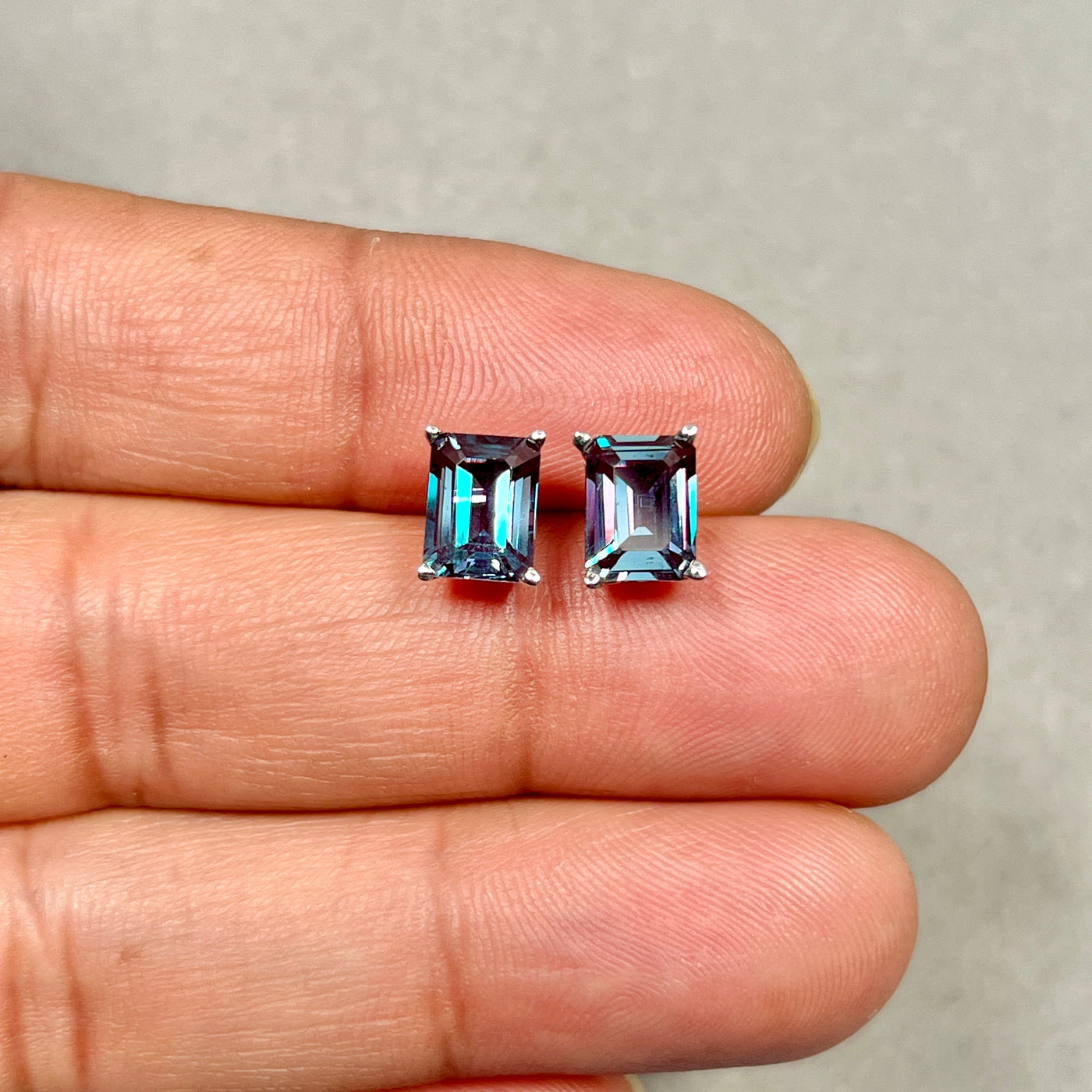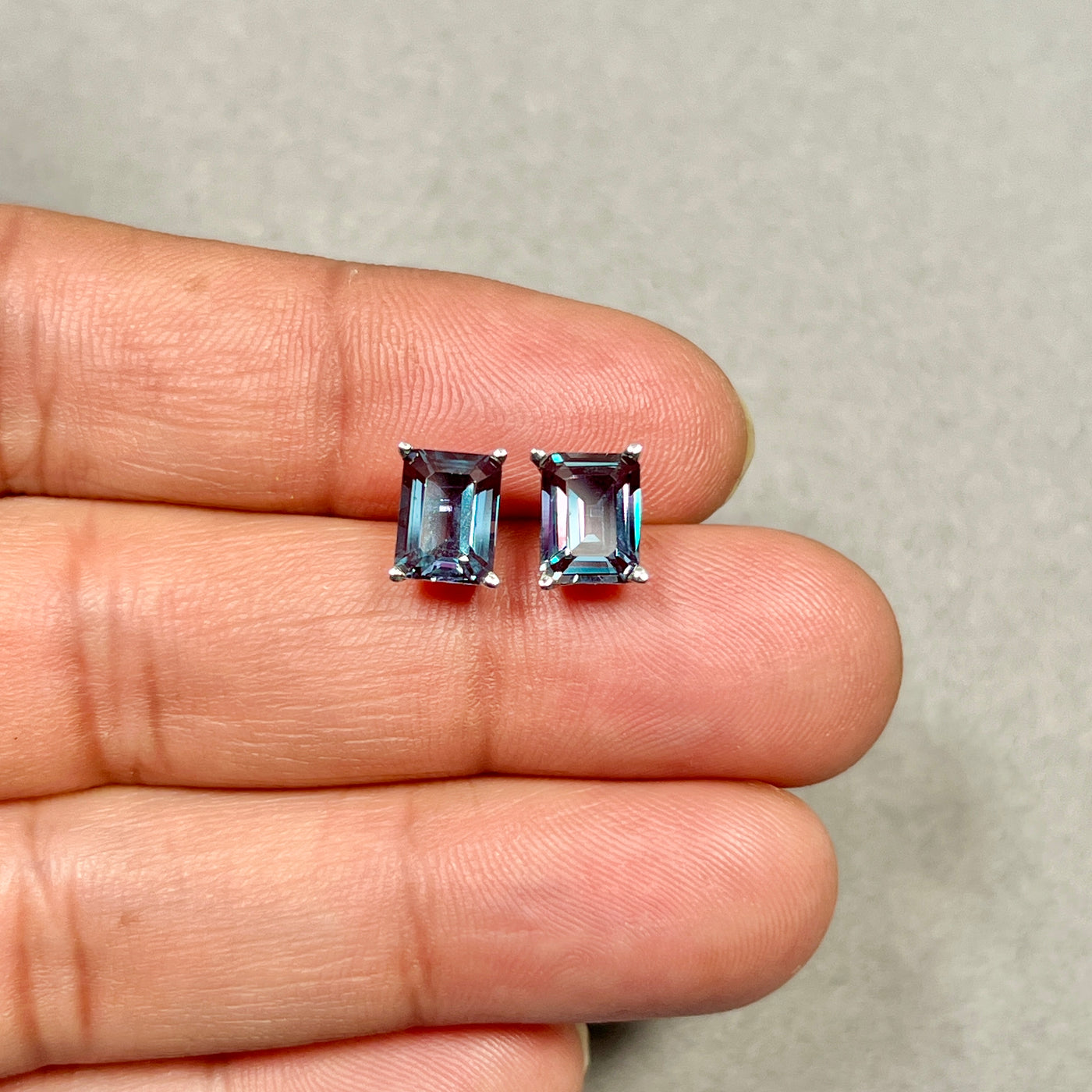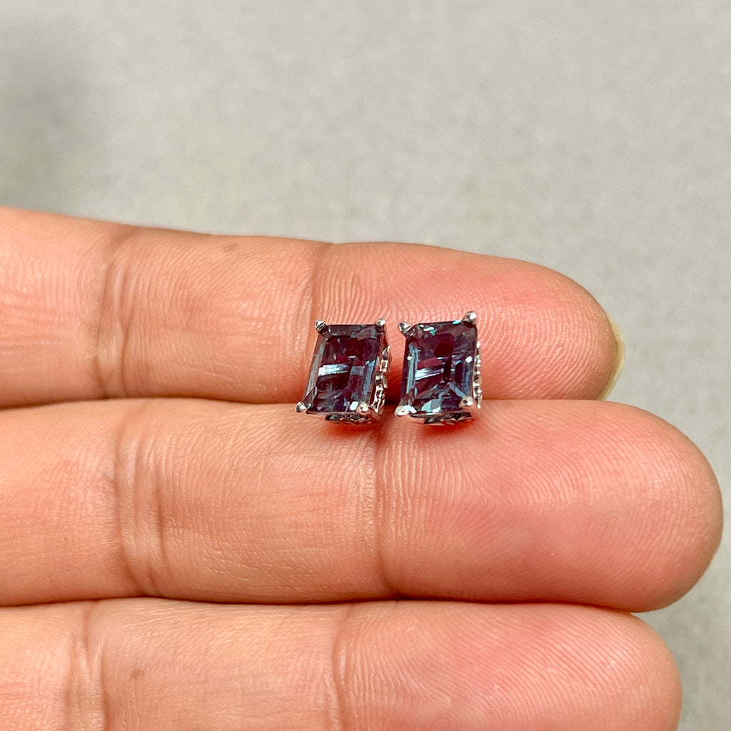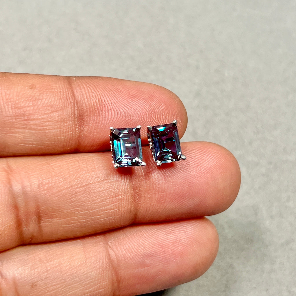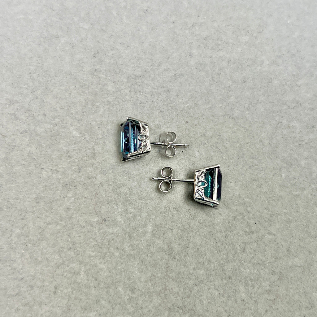 AAA Emerald Cut Russian Lab Created Alexandrite Scroll Stud Earrings 3.75–4.15 Cts 8x6 mm 14K White Gold