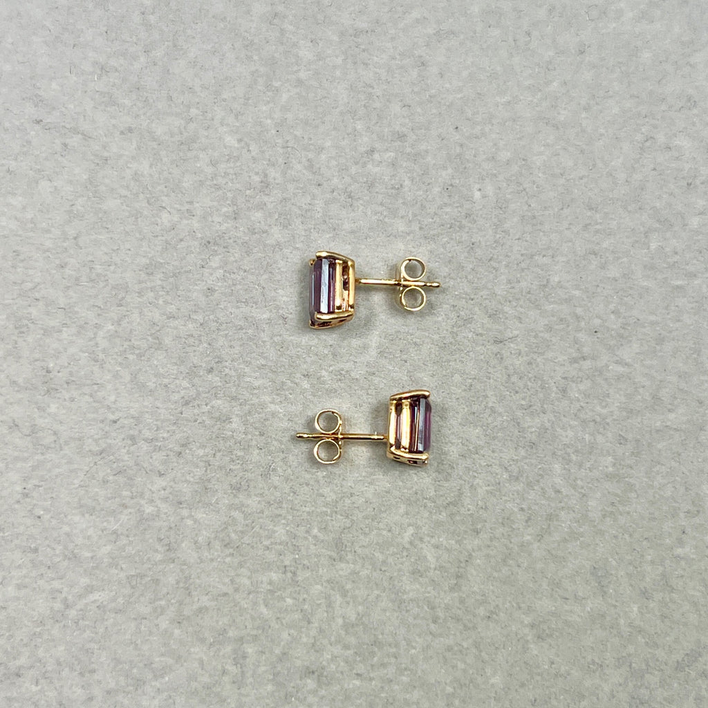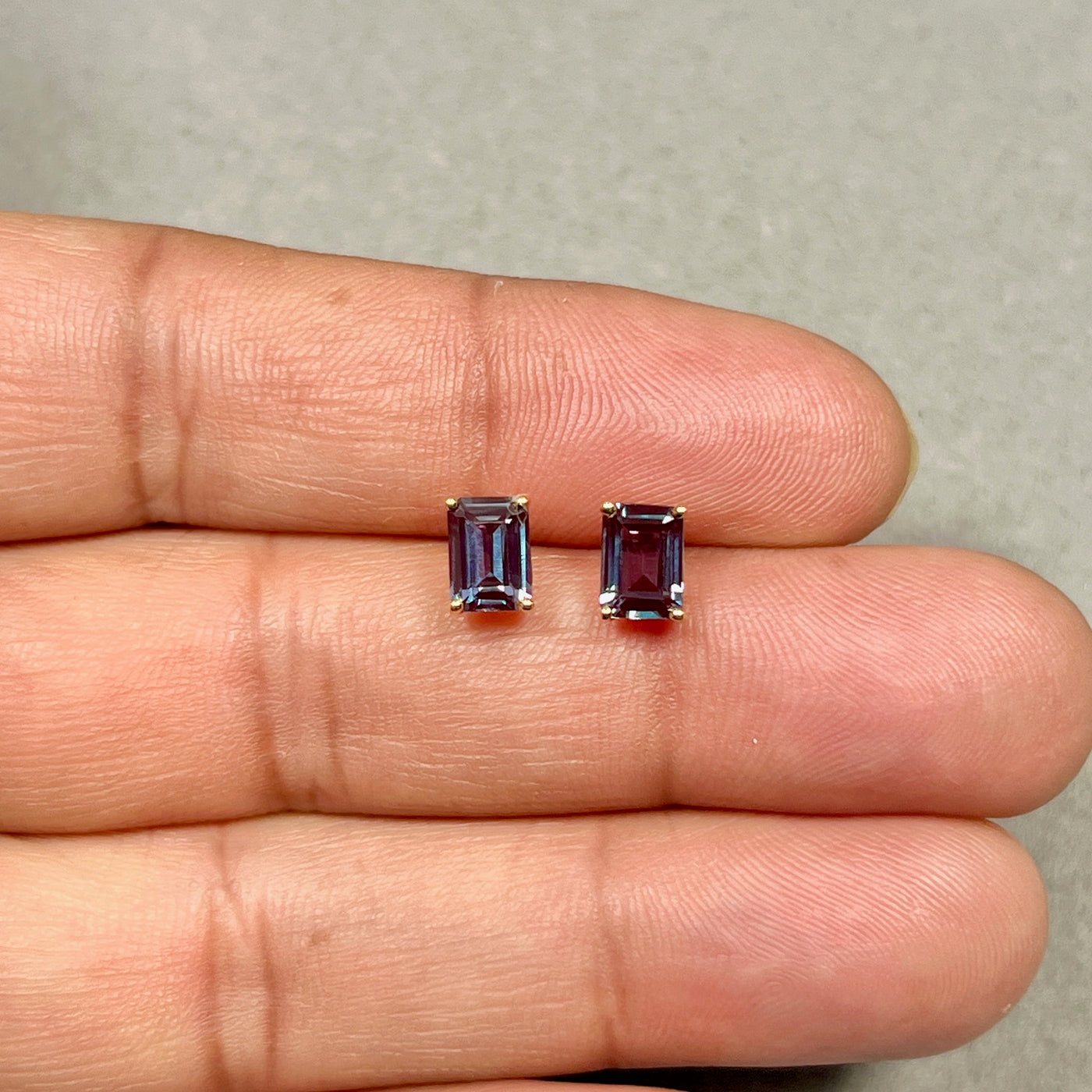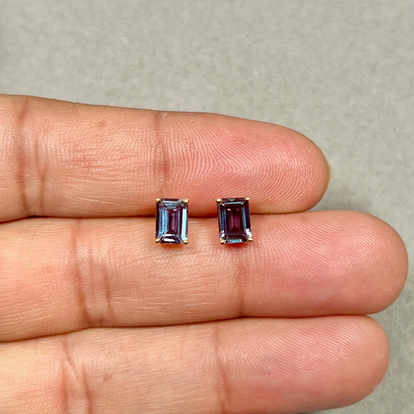 AAA Emerald Cut Russian Lab Created Alexandrite Stud Earrings 2.24–2.72 Cts 7x5 mm 14K Yellow Gold