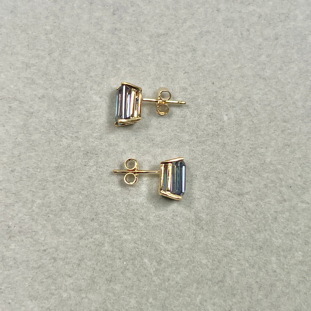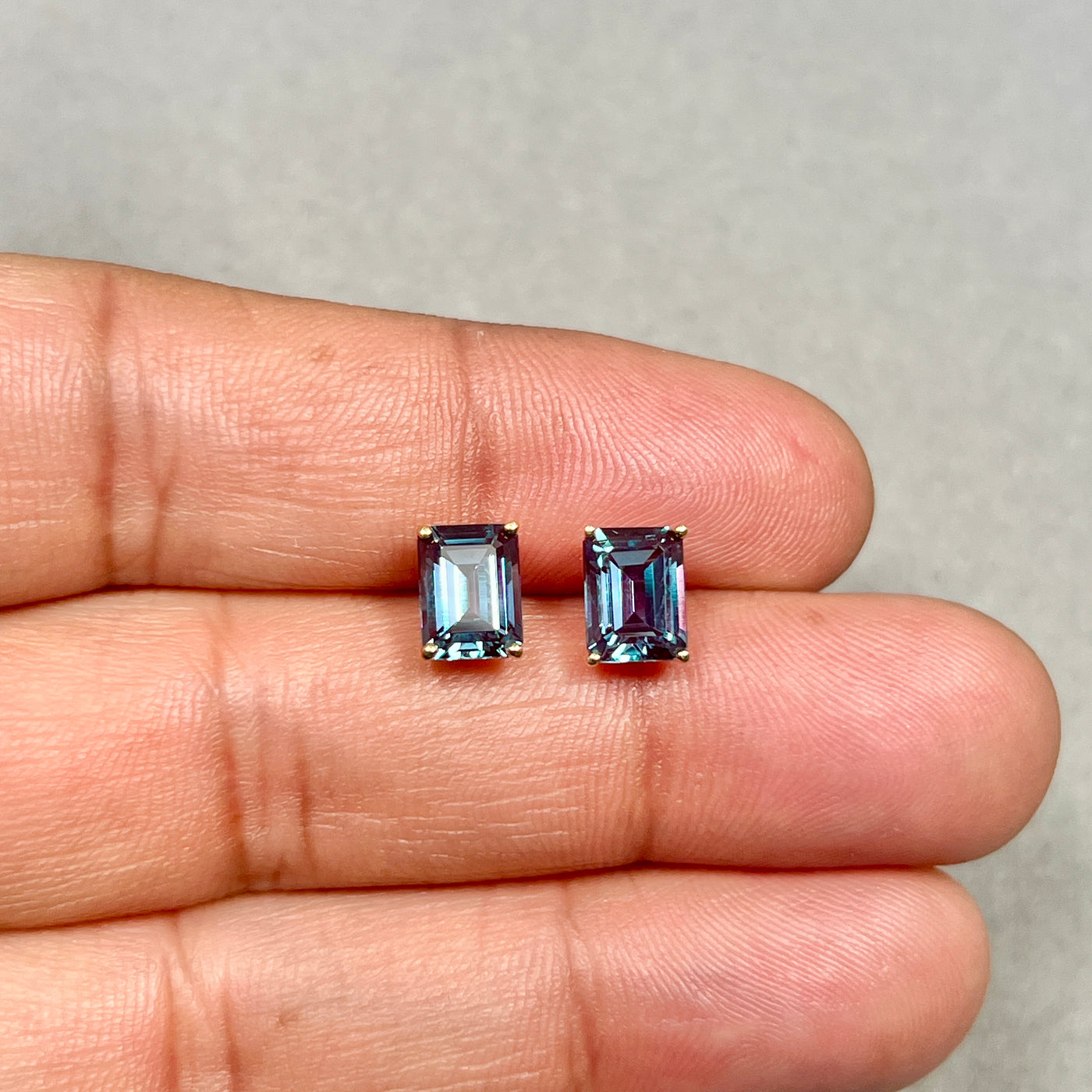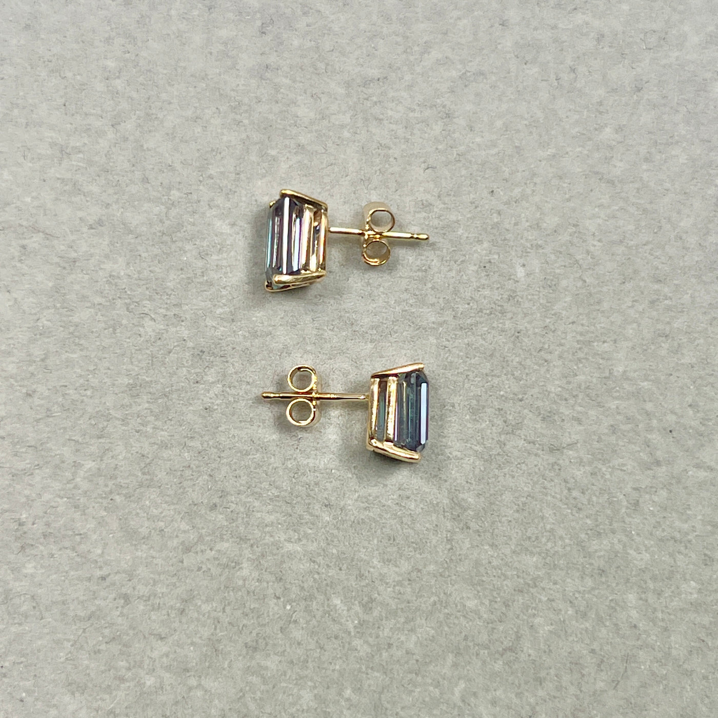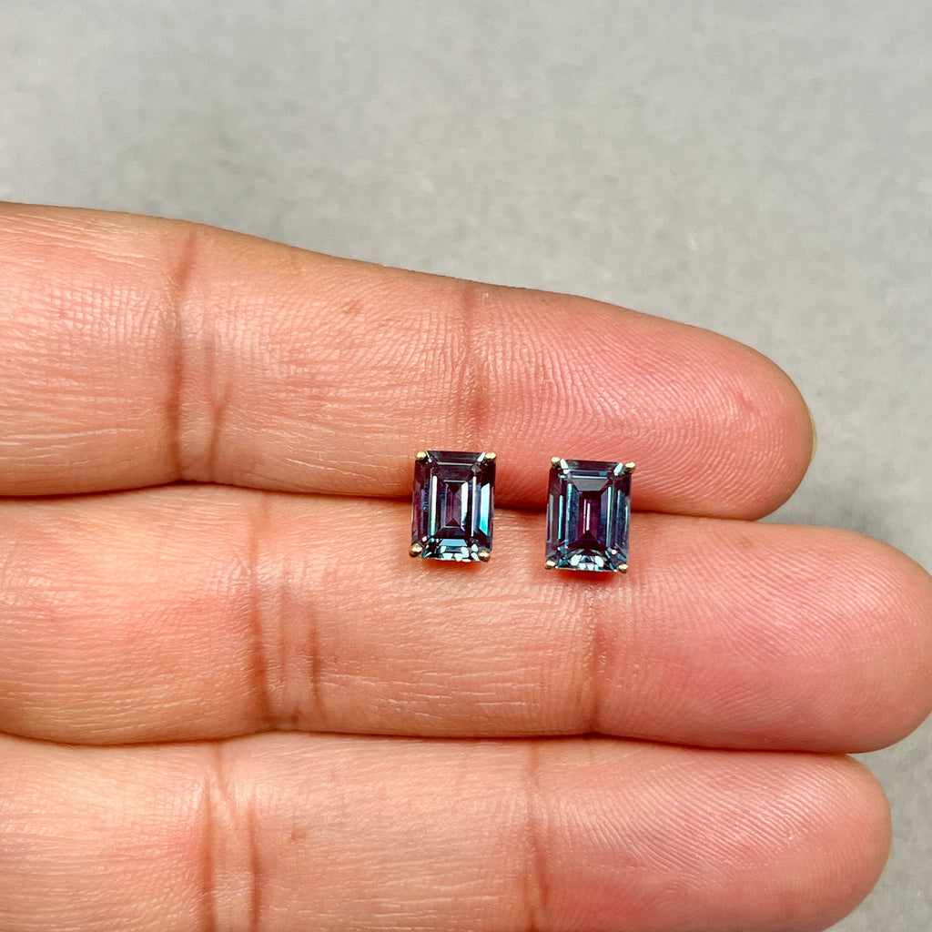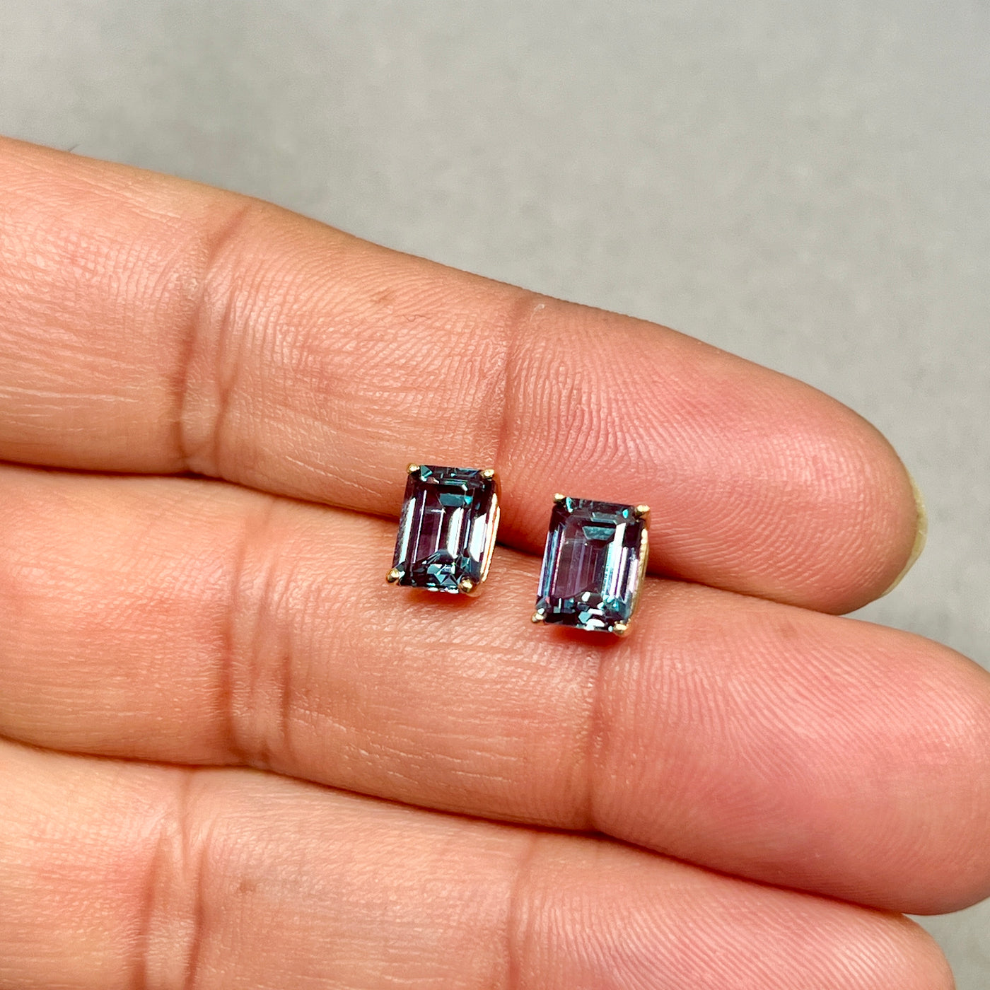 AAA Emerald Cut Russian Lab Created Alexandrite Stud Earrings 3.82–4.32 Cts 8x6 mm 14K Yellow Gold
