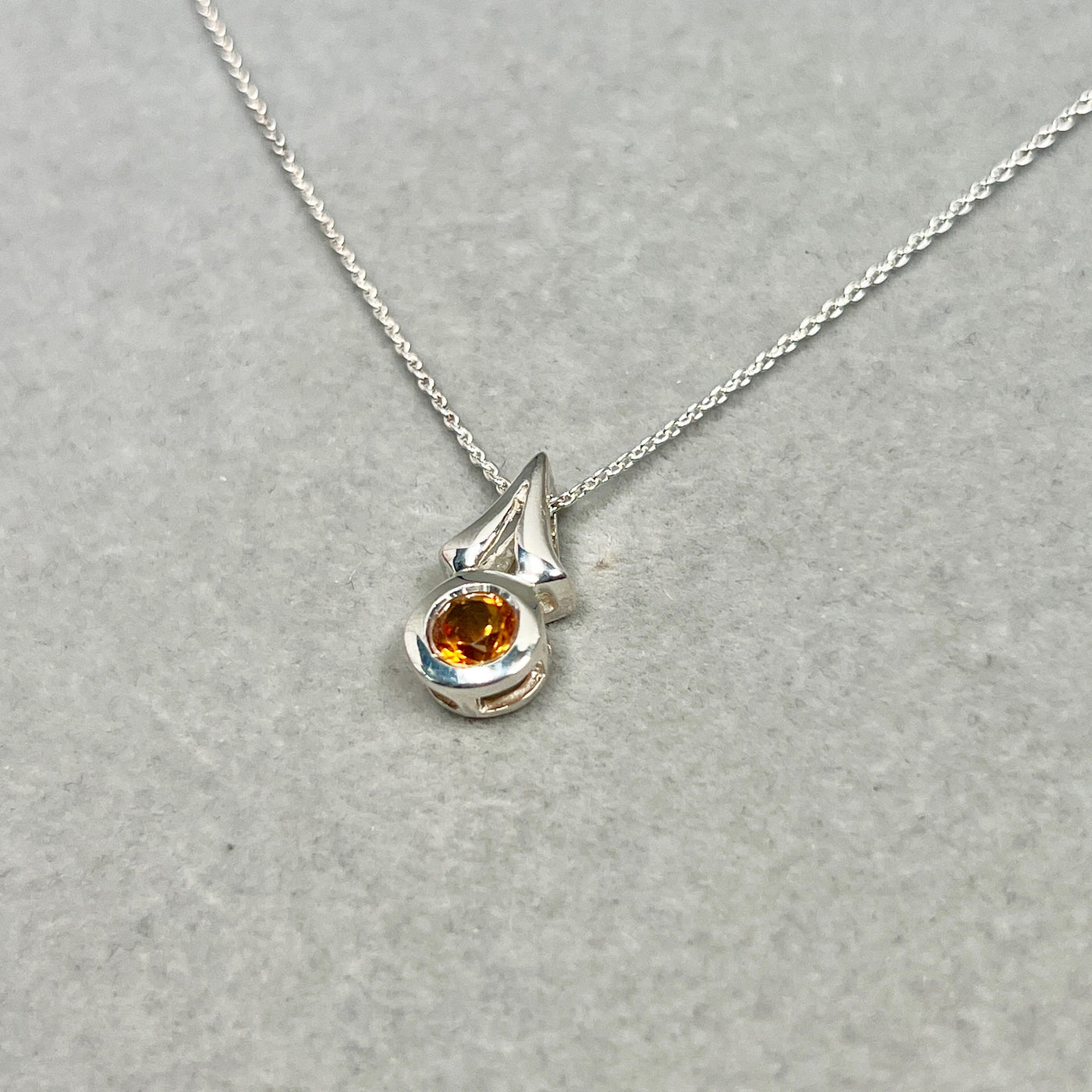 This graceful pendant features a 5 mm round citrine delicately suspended within a polished silver circle-drop design. The vibrant golden-yellow gemstone catches the light beautifully, symbolizing warmth, joy, and positivity. Crafted in sleek sterling silver and paired with an 18-inch cable chain, this pendant is both lightweight and versatile. Its fluid silhouette adds movement and sparkle, making it perfect for modern minimal styling.