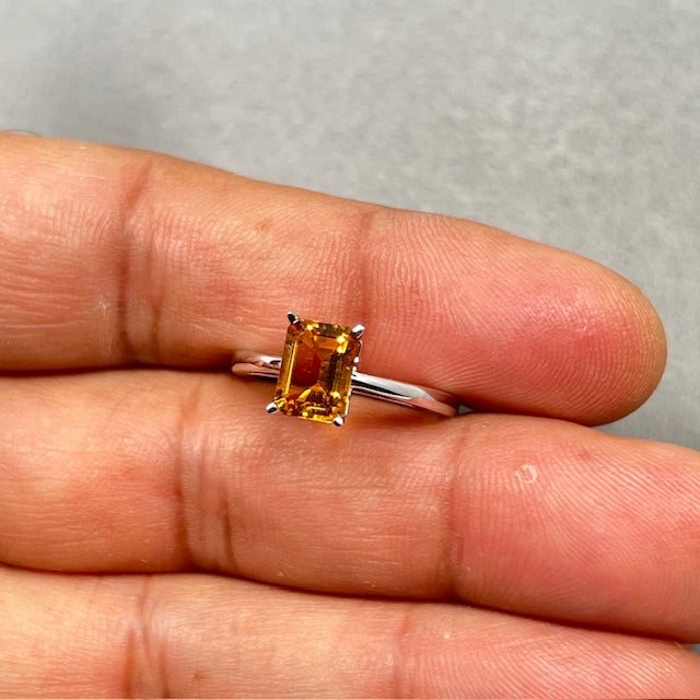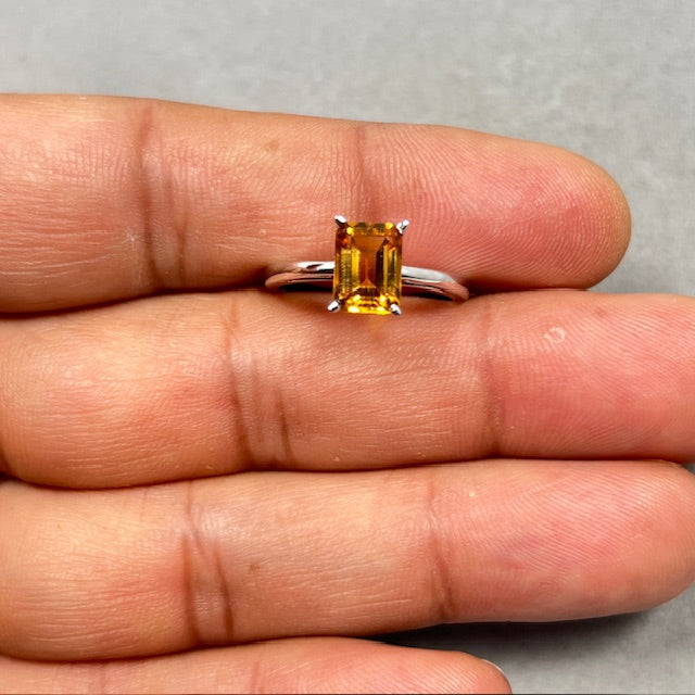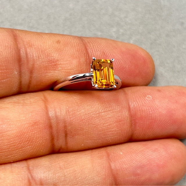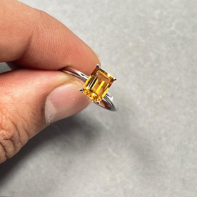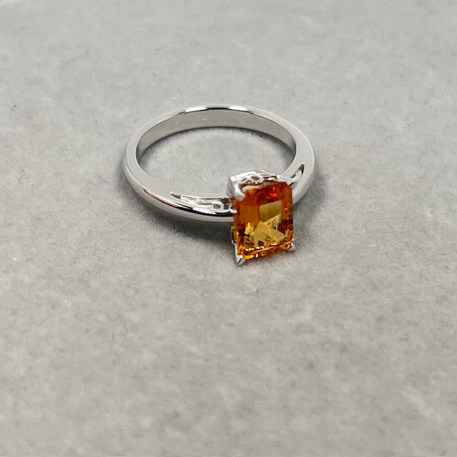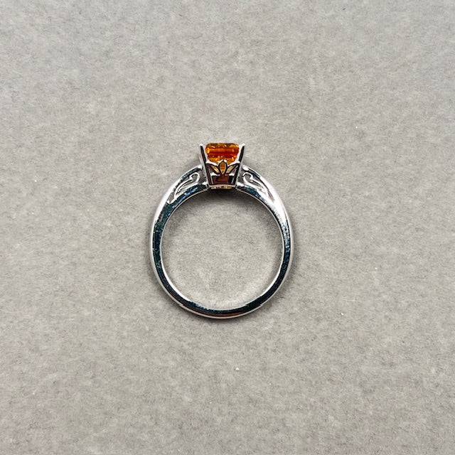 Emerald Cut Citrine Ring: 14K White Gold Scroll Solitaire, Size 7