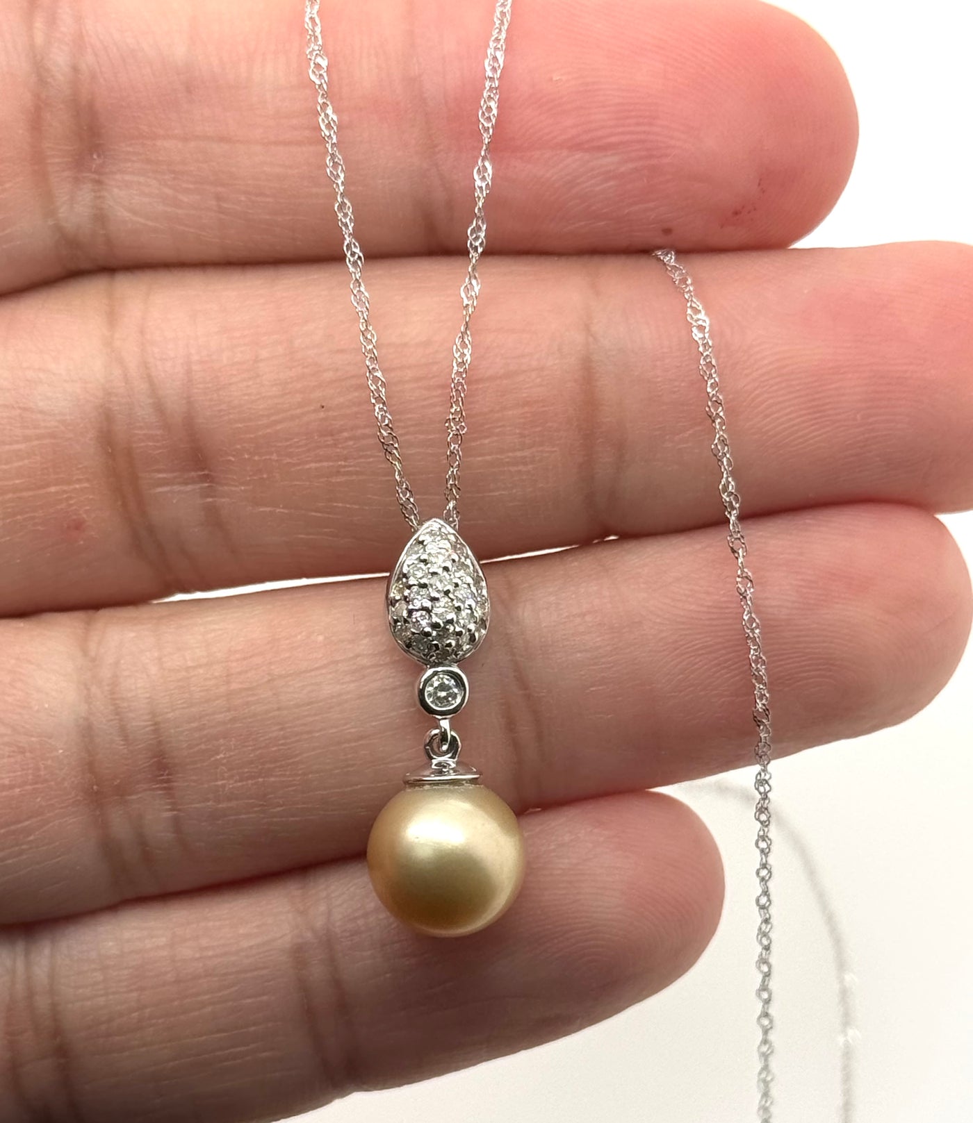 This exquisite pendant features a luminous 10 mm Golden South Sea cultured pearl, known for its rich color and exceptional luster. Accented with twenty-three sparkling diamonds, the design enhances brilliance while maintaining a graceful balance. Crafted in polished 14K white gold, the pendant offers a modern yet timeless aesthetic. Suspended from an 18-inch chain, it moves beautifully and adds a sophisticated glow to any neckline.