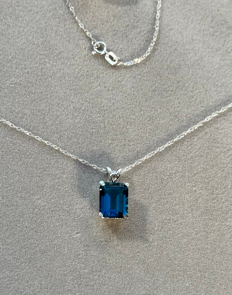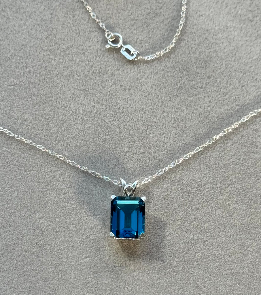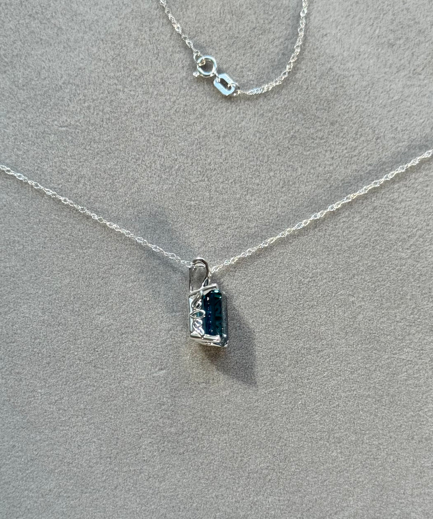 Elevate your jewelry collection with this 3.24 Carat London Blue Topaz Solitaire Pendant in 18K White Gold. Featuring an AAA quality 10x8mm emerald-cut London Blue Topaz, this pendant is prong-set in a refined scroll design that highlights the gemstone’s deep ocean-blue brilliance. Completed with an 18-inch 18K White Gold Singapore Chain, this timeless pendant is perfect for both everyday elegance and special occasions.