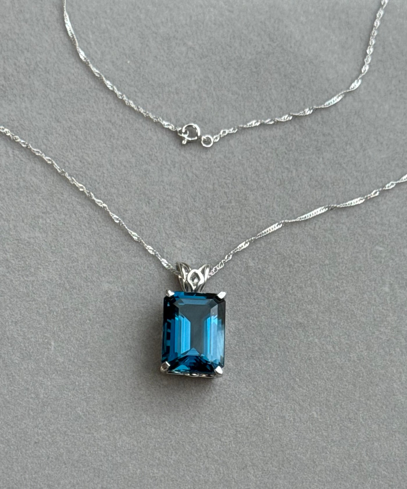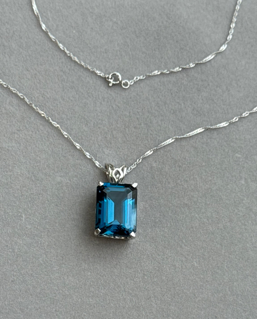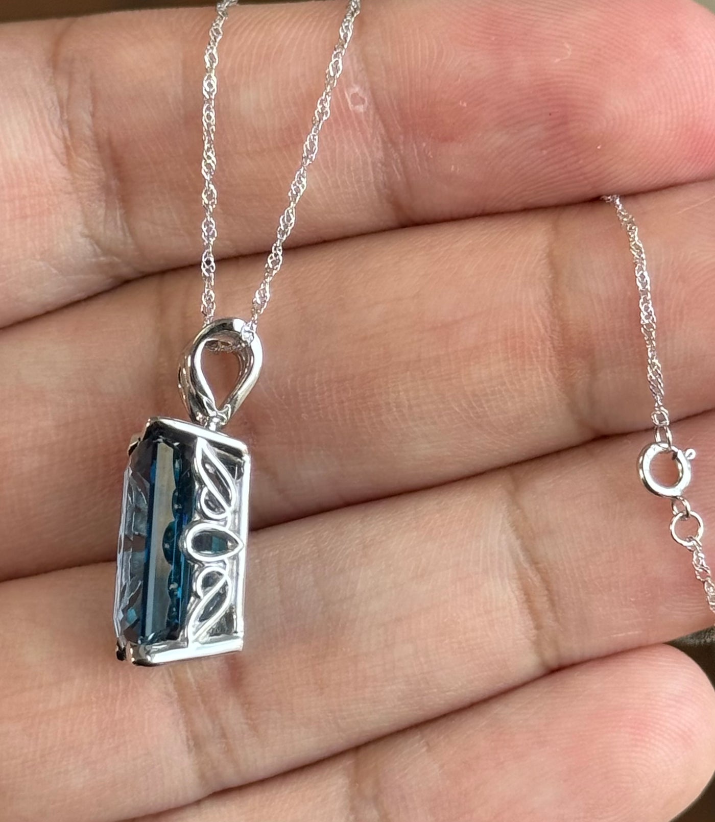 Make a statement with the deep, inky elegance of London Blue Topaz. This standout pendant showcases an AAA‑grade, emerald‑cut London Blue Topaz measuring approximately 17 x 13 mm (13.76 carats) in a refined four‑prong scroll solitaire setting of 14K white gold. The crisp step facets of the emerald cut highlight the stone’s saturated teal‑navy tones and mirror‑like flashes, while the included 18‑inch 14K white gold Singapore chain adds fluid sparkle and a luxurious finish. A striking birthstone necklace for December and a sophisticated centerpiece for any jewelry wardrobe.