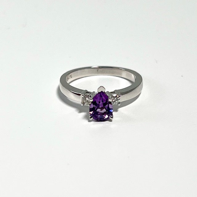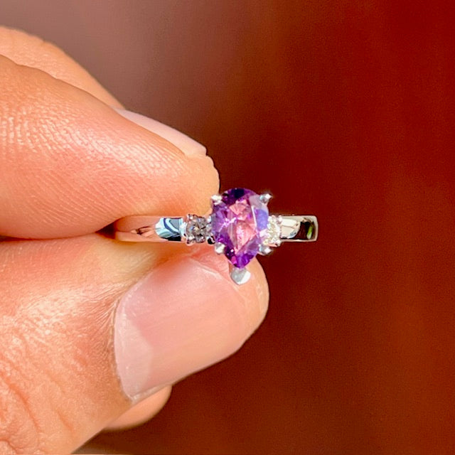 Pear Amethyst and Diamond Three Stone Ring in 14K White Gold, 0.55 Ct AAA Amethyst with 0.10 Ct Diamonds, Ring size 5.5