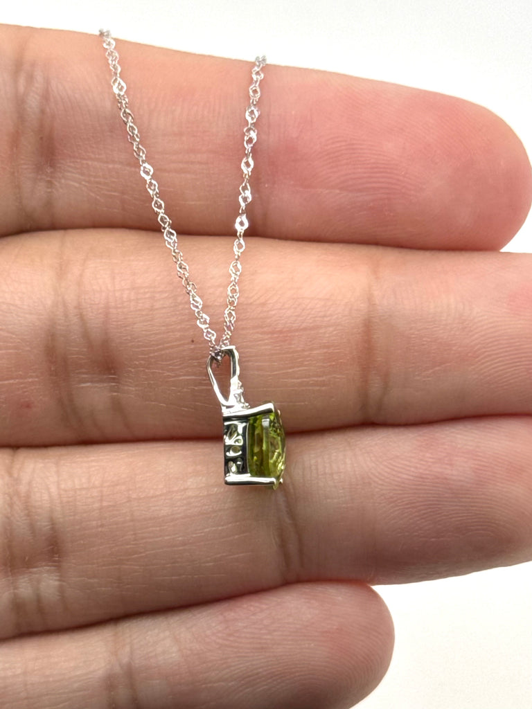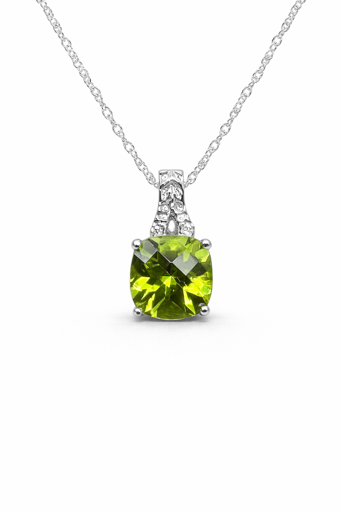 Peridot Diamond Pendant | 14K White Gold Antique Filigree — Cushion Cut August Birthstone Gift for Her