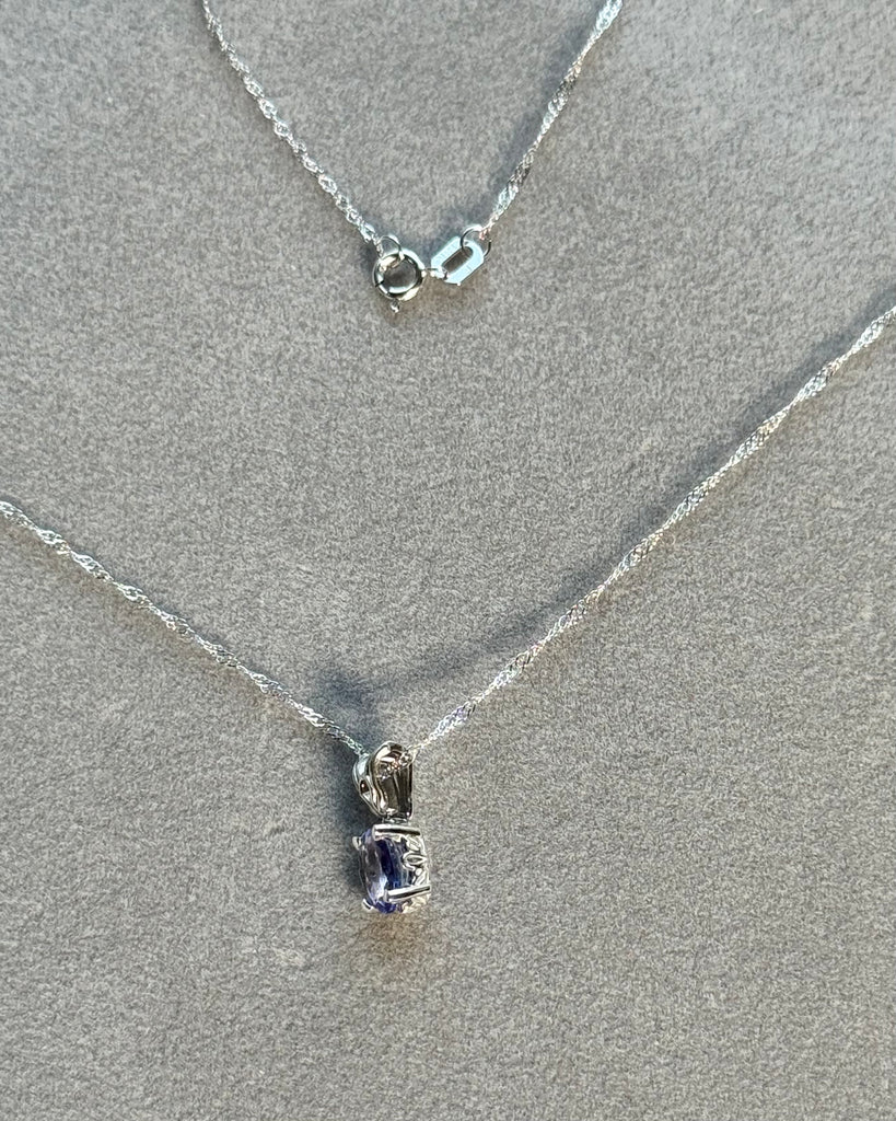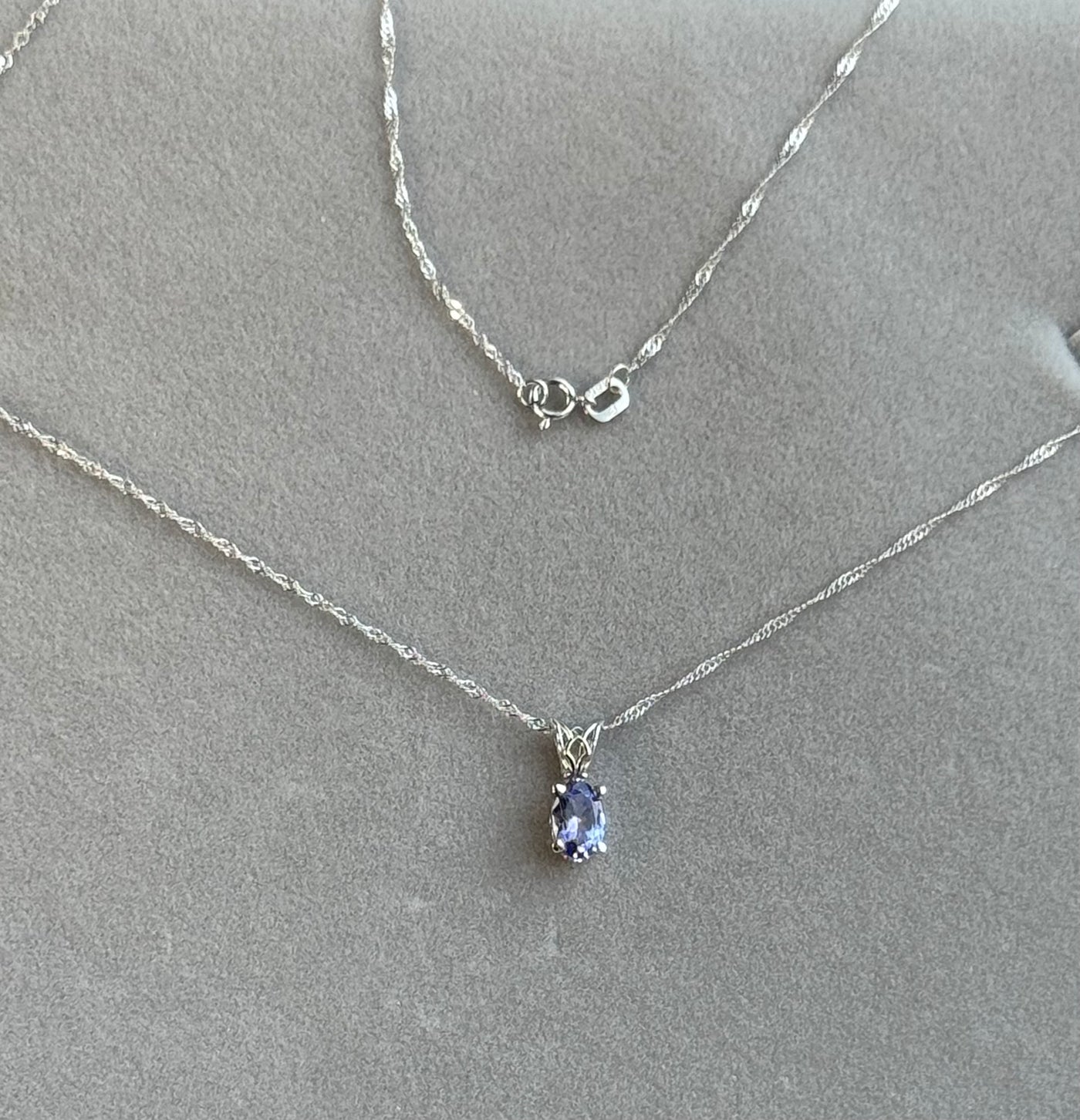 Elevate everyday style with the luminous violet‑blue of Tanzanite. This platinum scroll solitaire pendant showcases an AA‑grade oval Tanzanite (~6.5 x 4.5 mm; approx. 0.55–0.89 ct) in a clean prong setting that maximizes color and sparkle. Finished with an 18" 18K white gold Singapore chain, it delivers fluid movement, refined shine, and timeless elegance. Perfect as a December birthstone necklace, anniversary gift, or a personal signature piece, this Tanzanite pendant is designed for effortless wear and lasting beauty.
