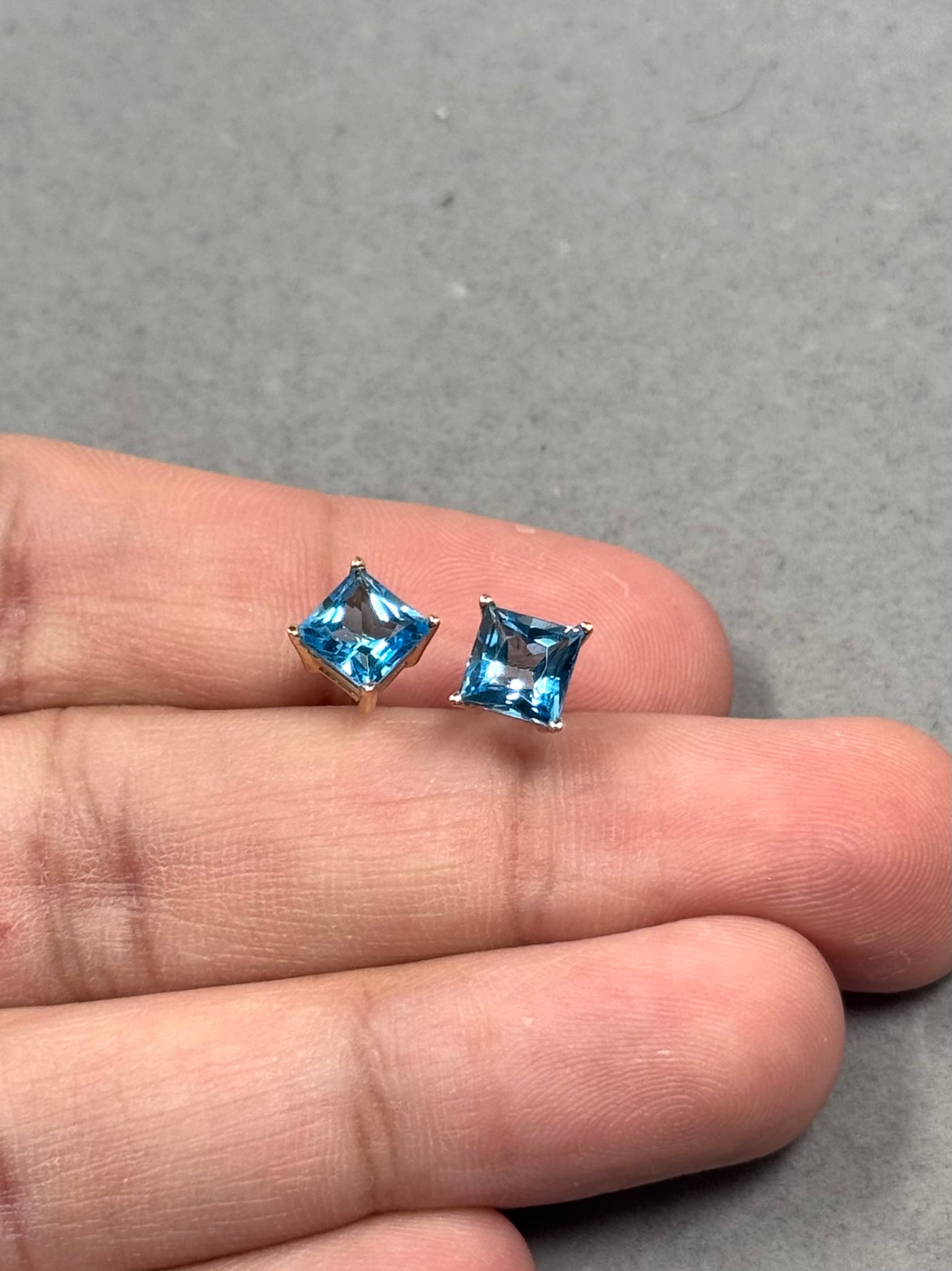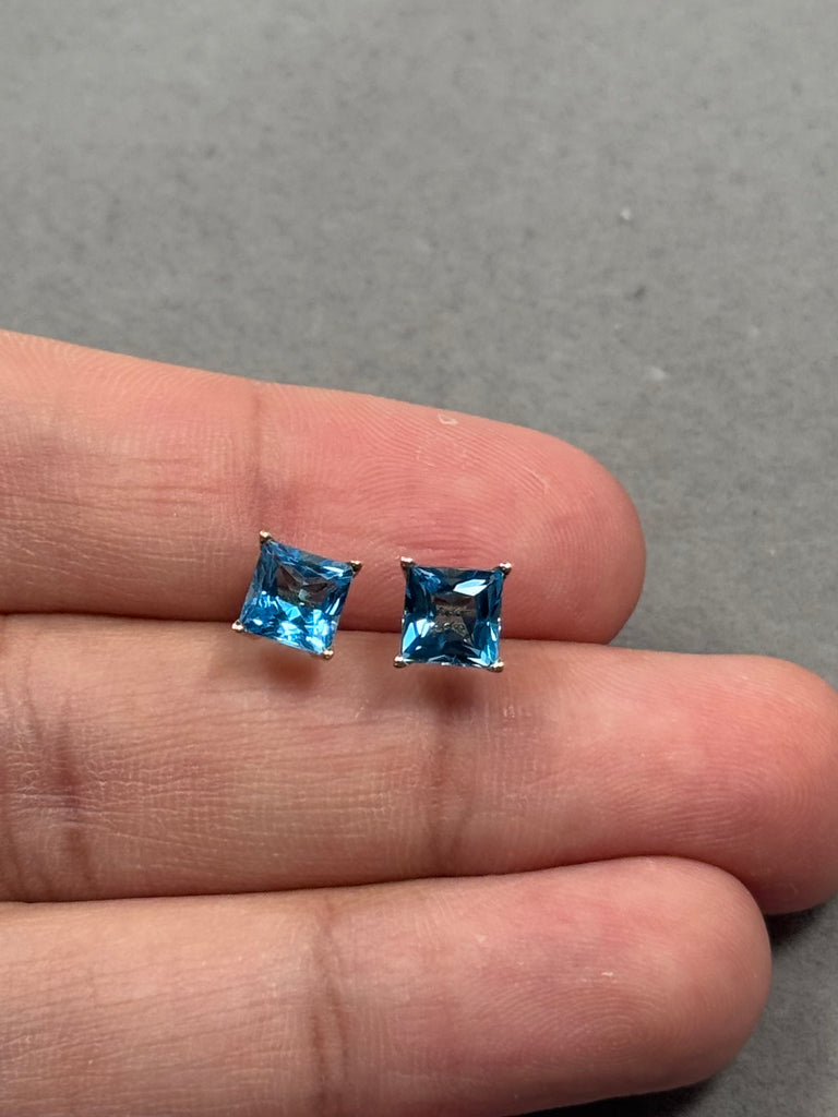 Add a timeless pop of color to your jewelry collection with these elegant Swiss Blue Topaz Stud Earrings crafted in solid 14K Yellow Gold. Each earring features a princess-cut AAA quality Swiss Blue Topaz, expertly secured in a classic four-prong setting for brilliance and durability.