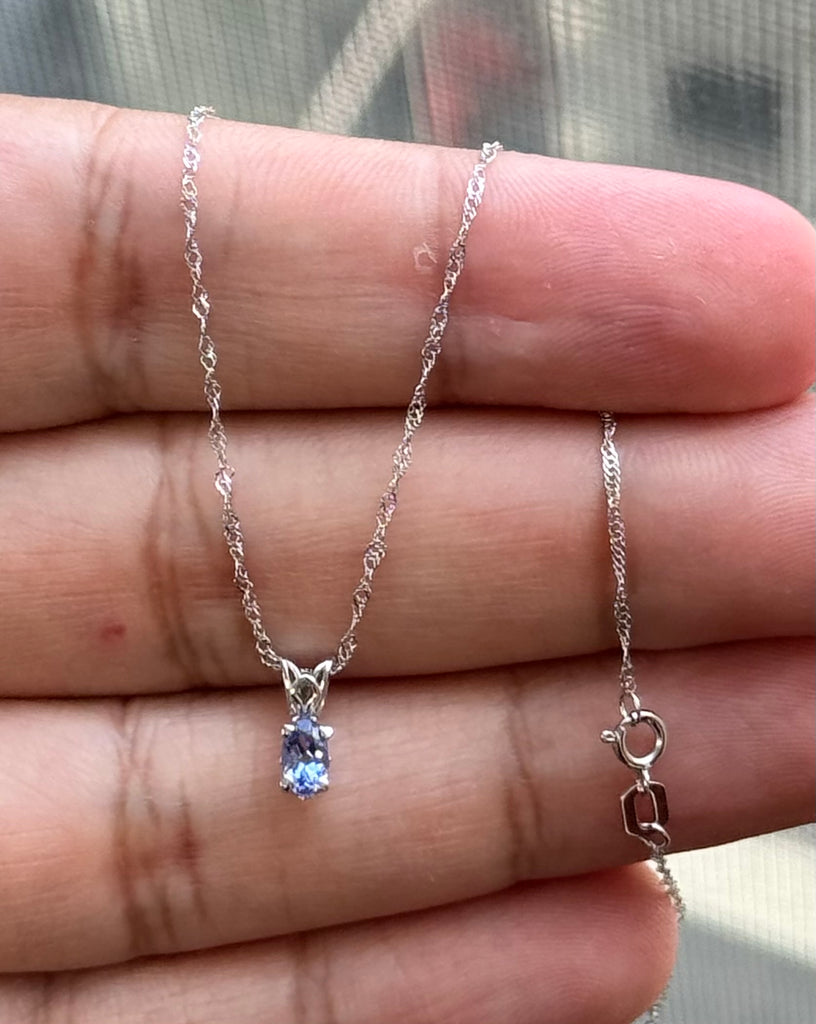 Elevate your elegance with this Tanzanite Oval Solitaire Pendant in Platinum. A luminous AA-quality 5x3 mm oval tanzanite (approx. 0.21–0.29 carat) is expertly prong set in a refined platinum scroll setting, showcasing the gem’s vivid violet-blue glow. Finished with an 18-inch 18K white gold Singapore chain for a luxurious, fluid drape, this necklace is a timeless statement—perfect for gifting or celebrating your own milestone.