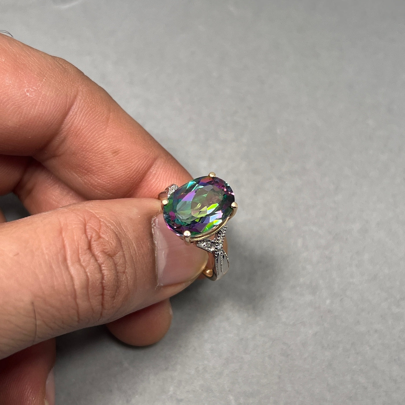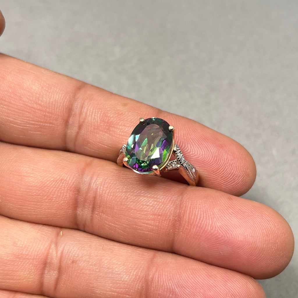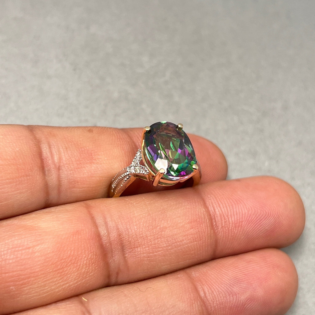 0.01 Ct Diamond & 6.24 Cts Mystic Fire Topaz Ring in 14K Yellow Gold | AAA Oval Topaz Solitaire Ring, Statement Jewelry Size 7.5