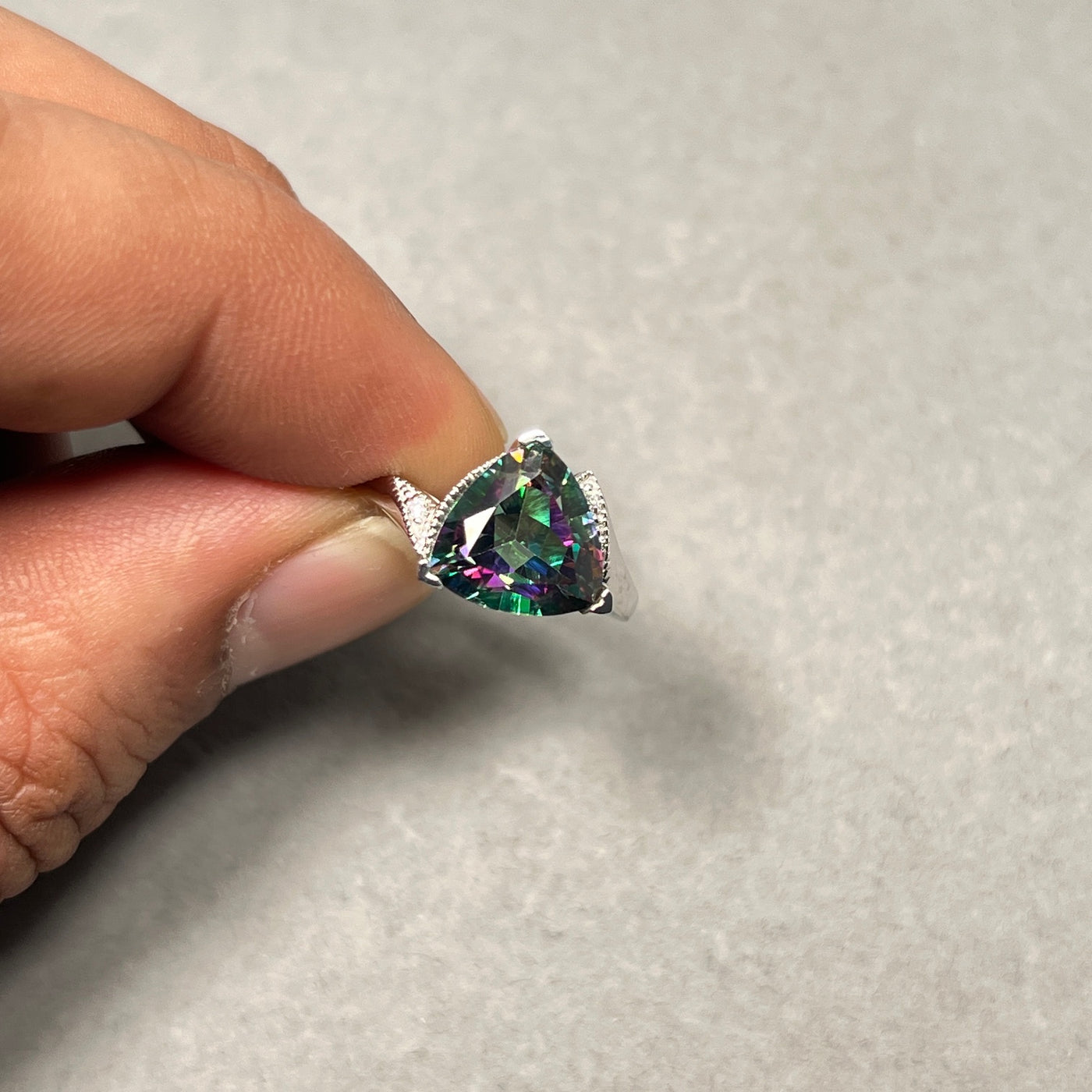 * **Gemstone:** AAA Trillion-Cut Mystic Fire Topaz