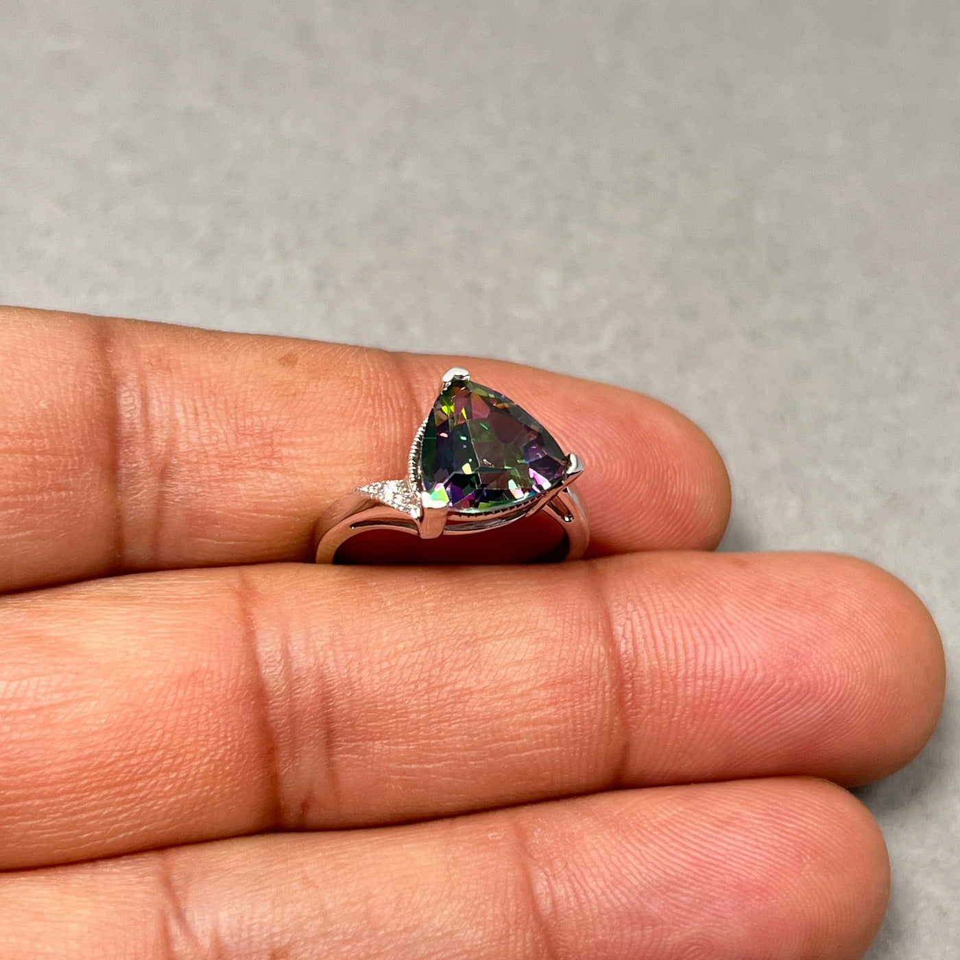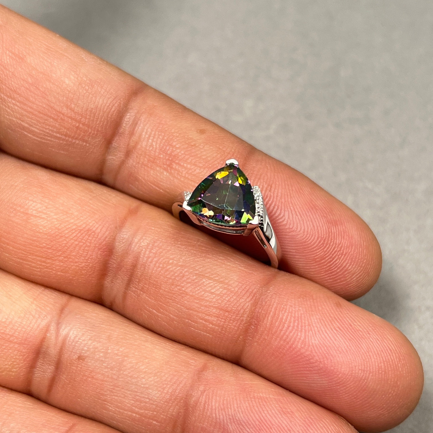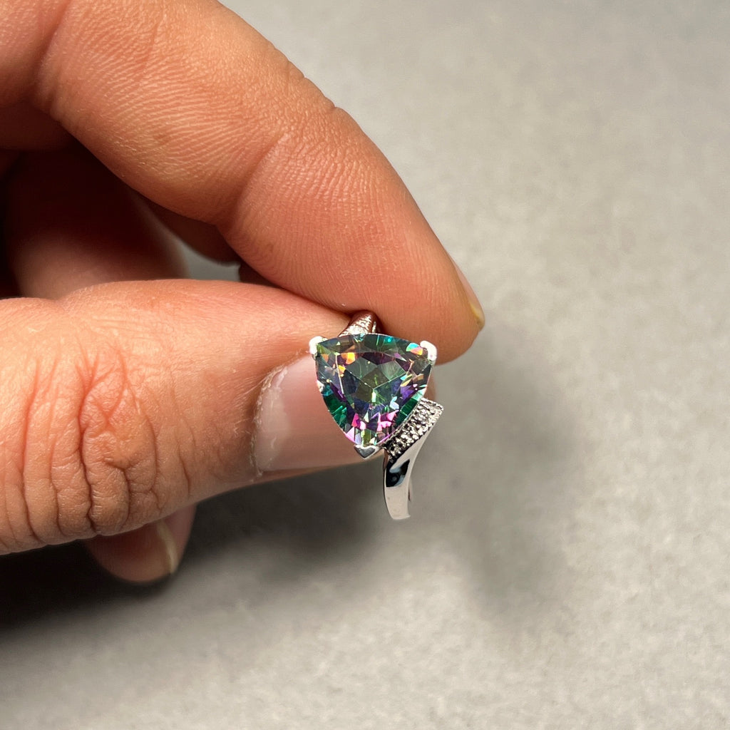 This gorgeous Mystic Fire Topaz Ring features an AAA quality trillion-cut Topaz, beautifully accented with sparkling Diamonds and expertly prong set in 14K White Gold. The Topaz weighs approximately 3.37–4.66 carats, complemented by 0.02 carats of Diamonds, creating a contemporary and stylish statement piece. Perfect for adding elegance and vibrancy to any outfit.