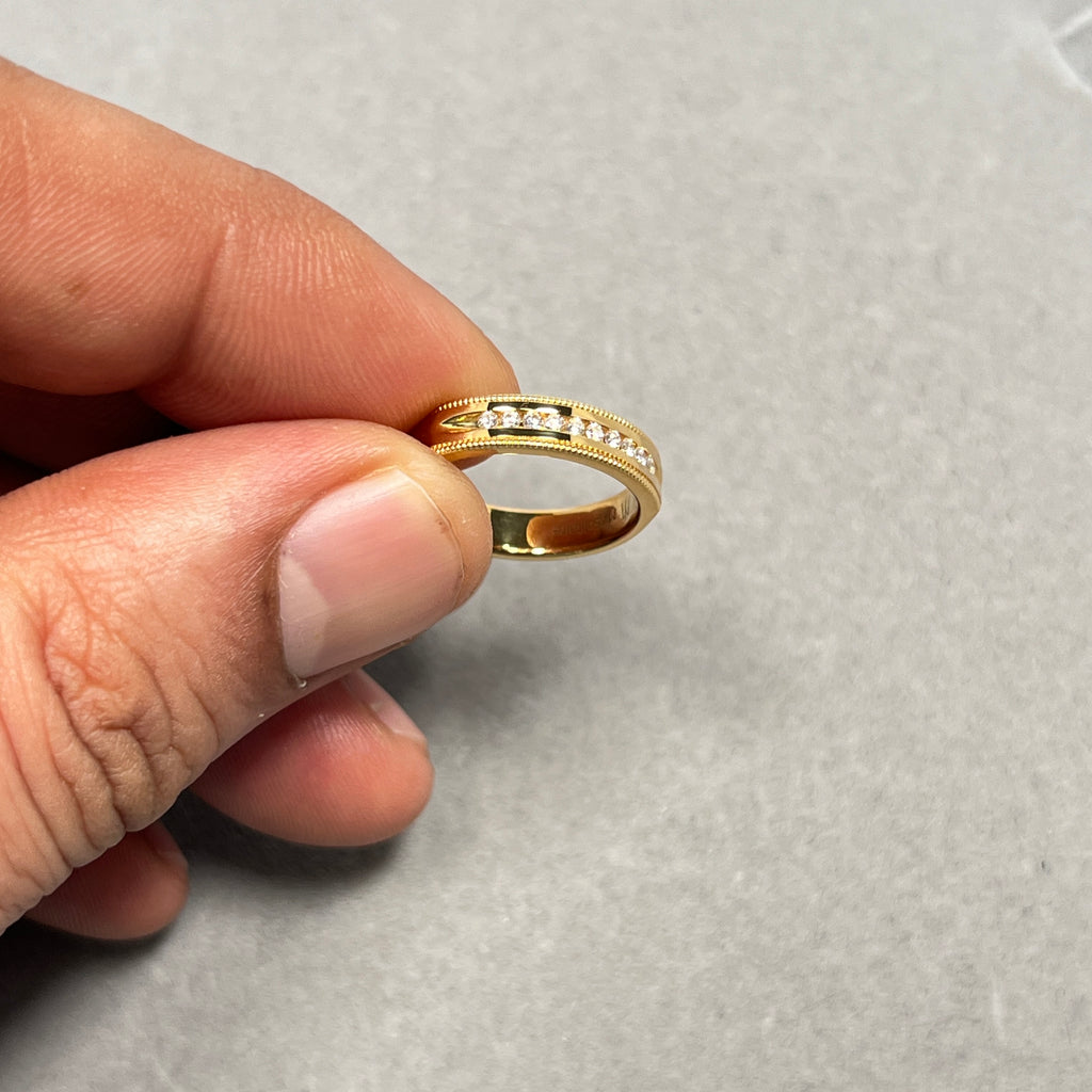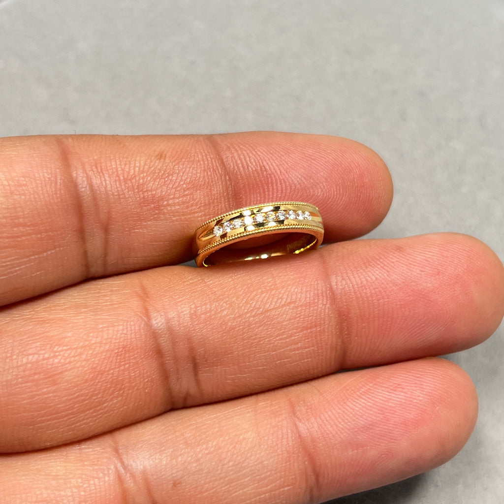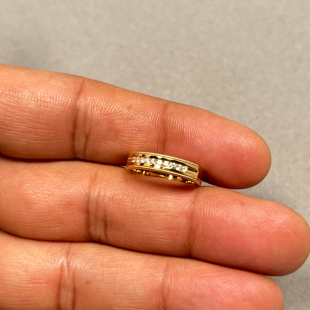 Celebrate timeless elegance with this Round Diamond Milgrain Wedding Band, beautifully crafted in 18K Yellow Gold. Featuring approximately ten natural round diamonds totaling 0.10 carats, each stone is channel set with intricate milgrain detailing along the edges for a vintage-inspired touch.