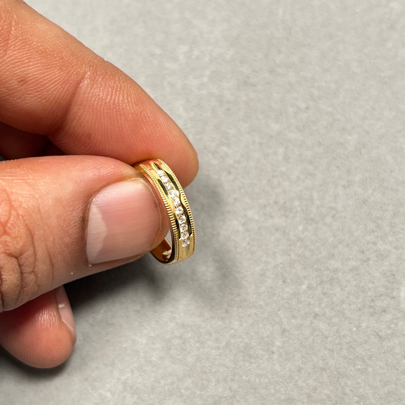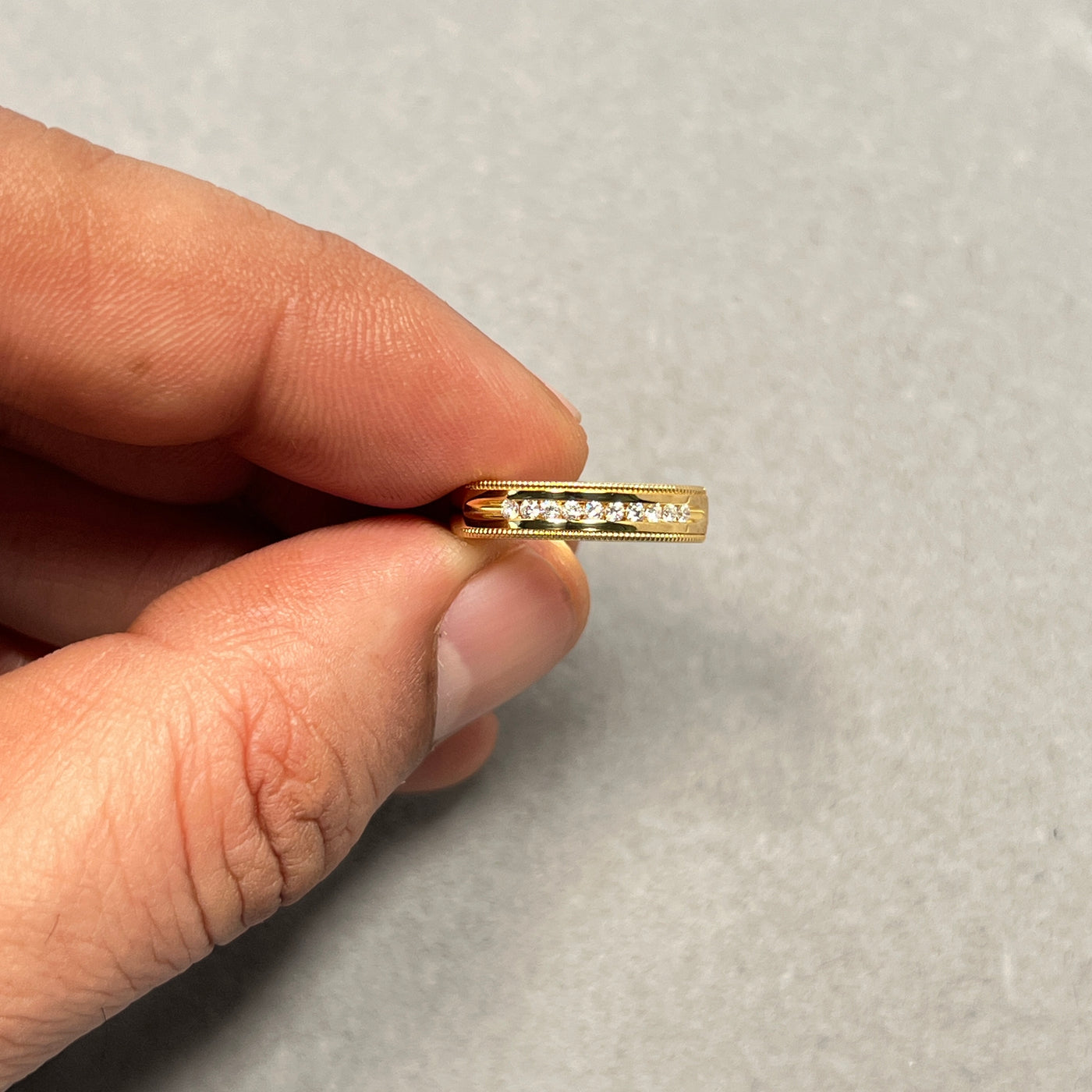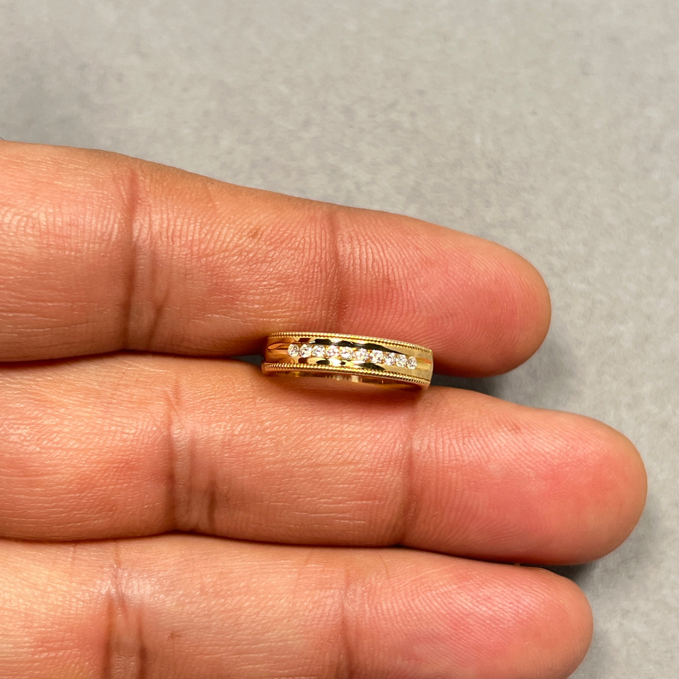 Celebrate timeless elegance with this Round Diamond Milgrain Wedding Band, beautifully crafted in 18K Yellow Gold. Featuring approximately ten natural round diamonds totaling 0.10 carats, each stone is channel set with intricate milgrain detailing along the edges for a vintage-inspired touch.
