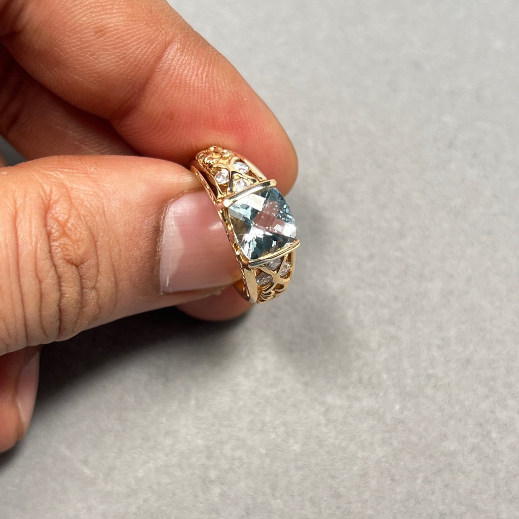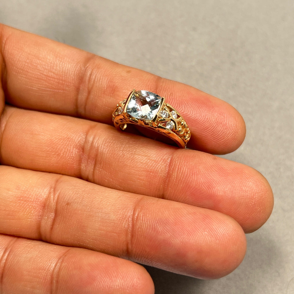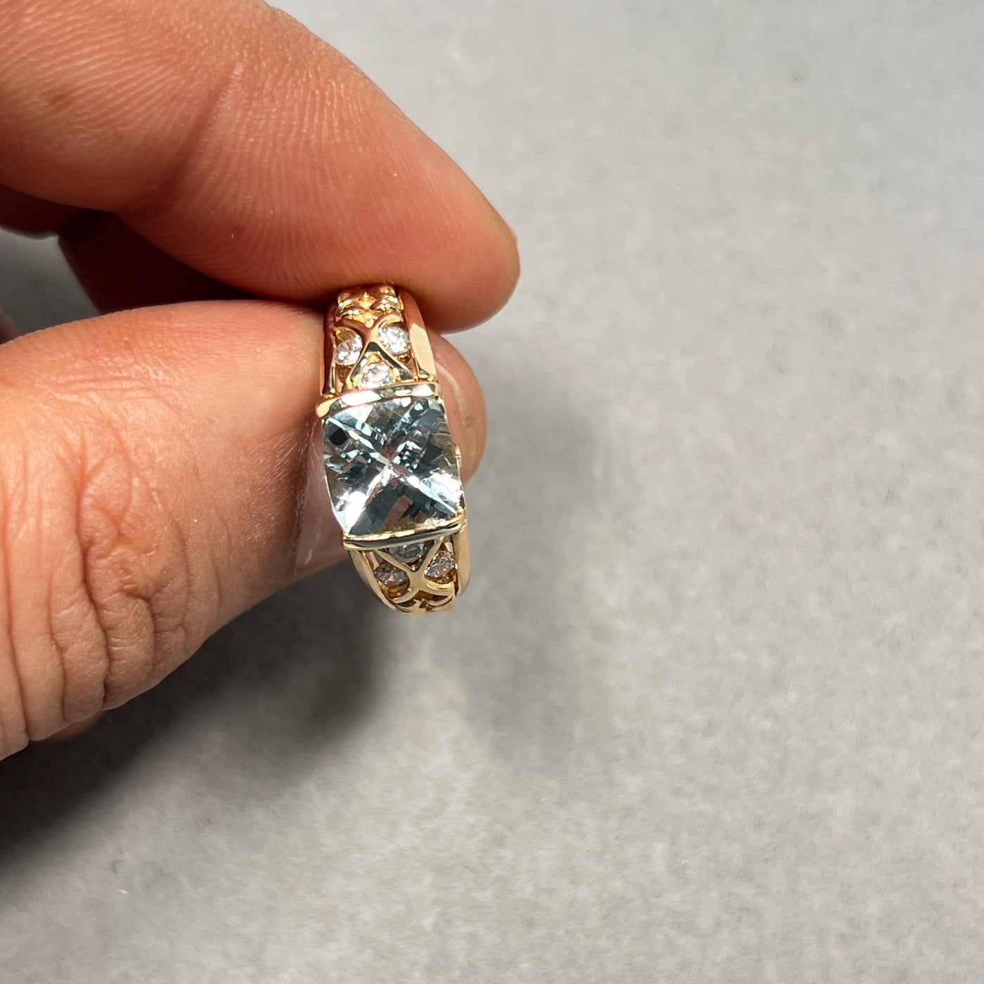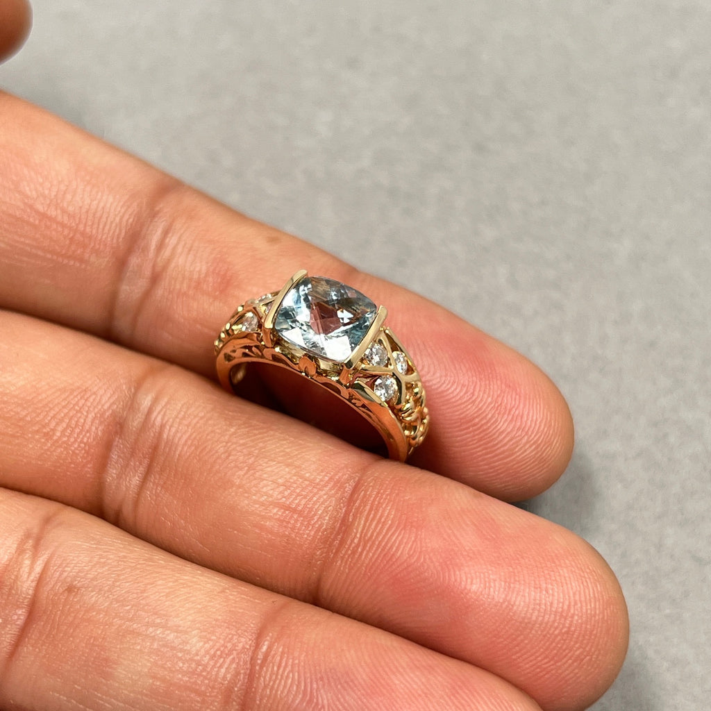 This spectacular Aquamarine and Diamond Ring showcases a stunning cushion checkerboard Aquamarine, beautifully complemented by six chic Diamonds bezel set in luxurious 14K Yellow Gold. The Aquamarine weighs approximately 1.58–2.02 carats, while the Diamonds total approximately 0.28 carats. A refined designer-style ring, it adds effortless elegance to any wardrobe.
