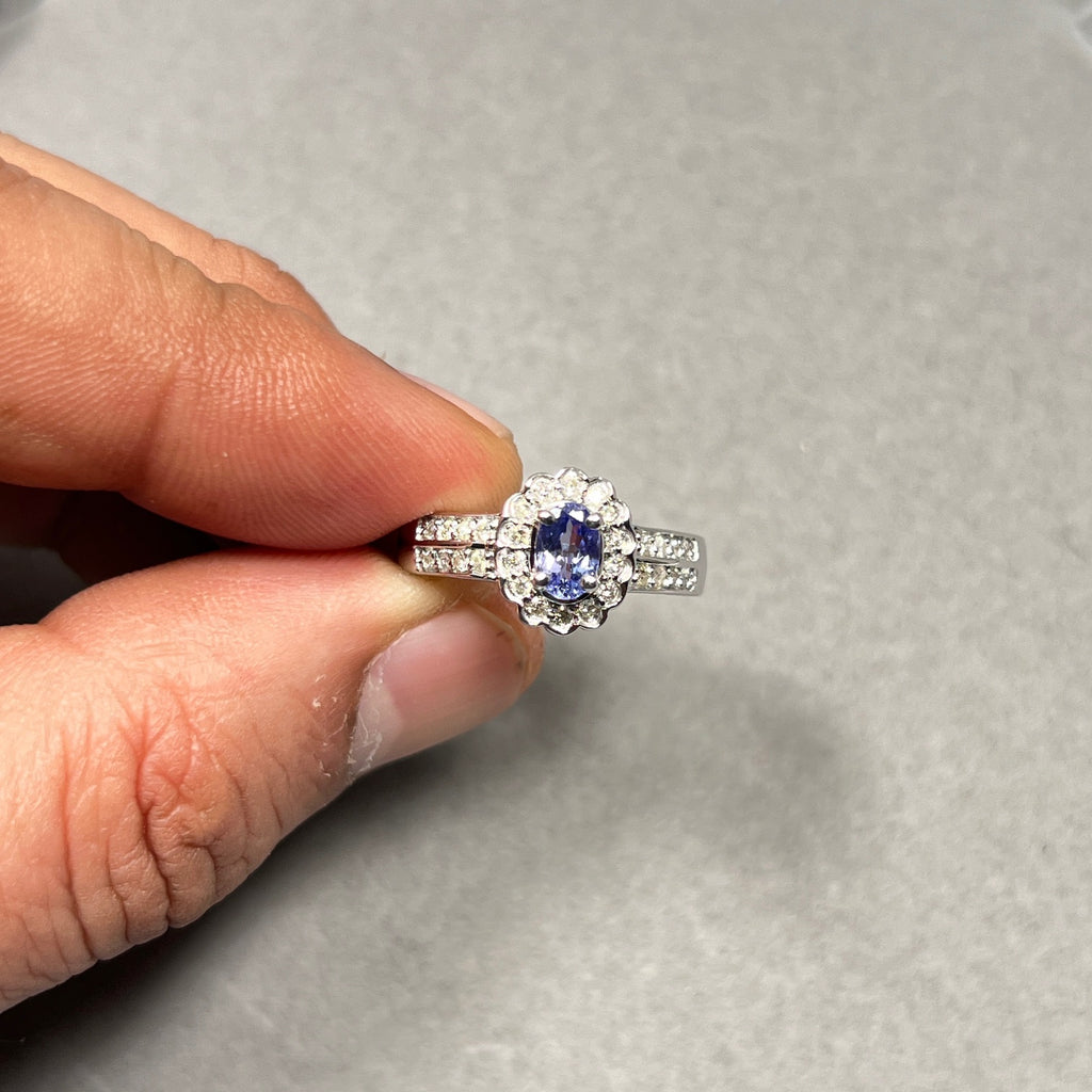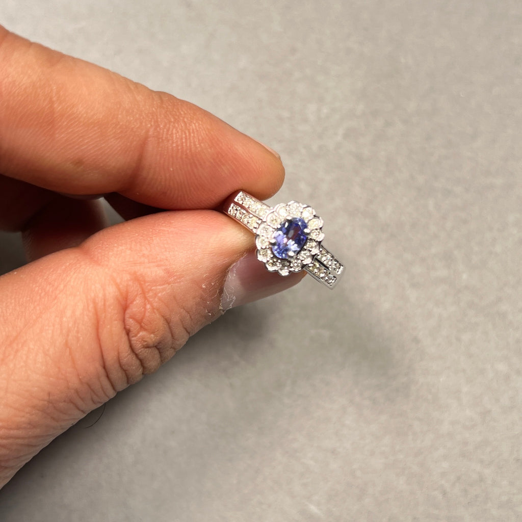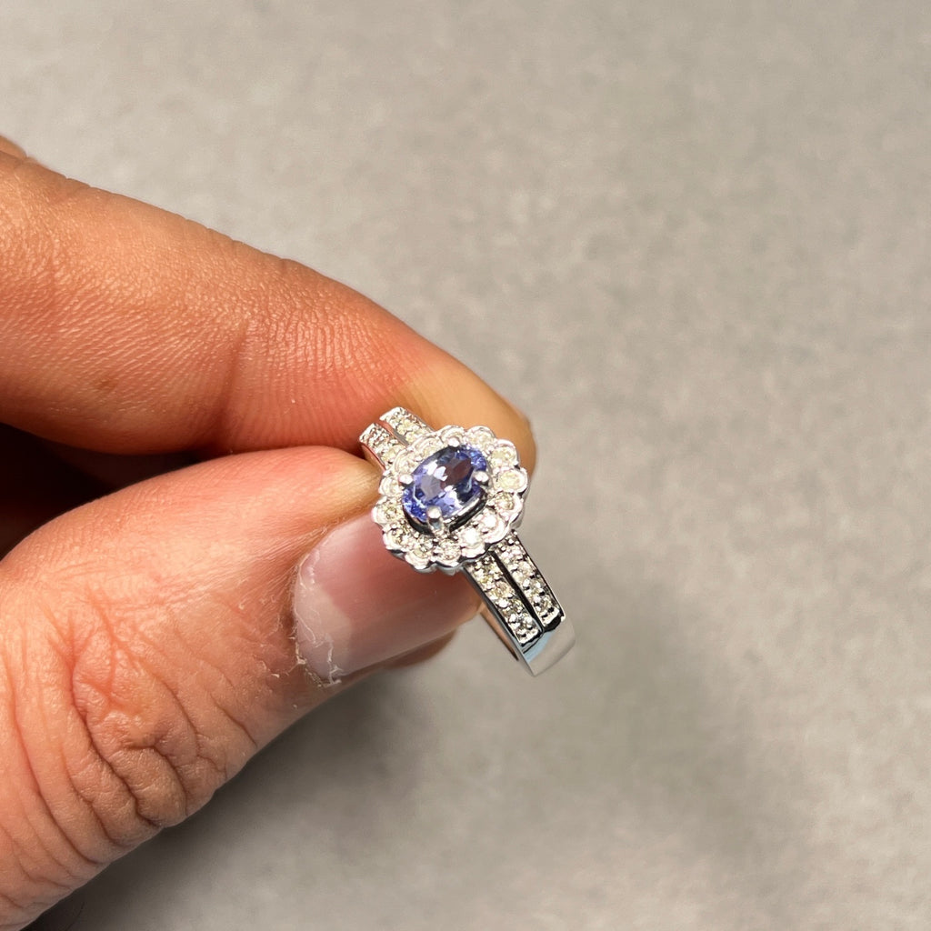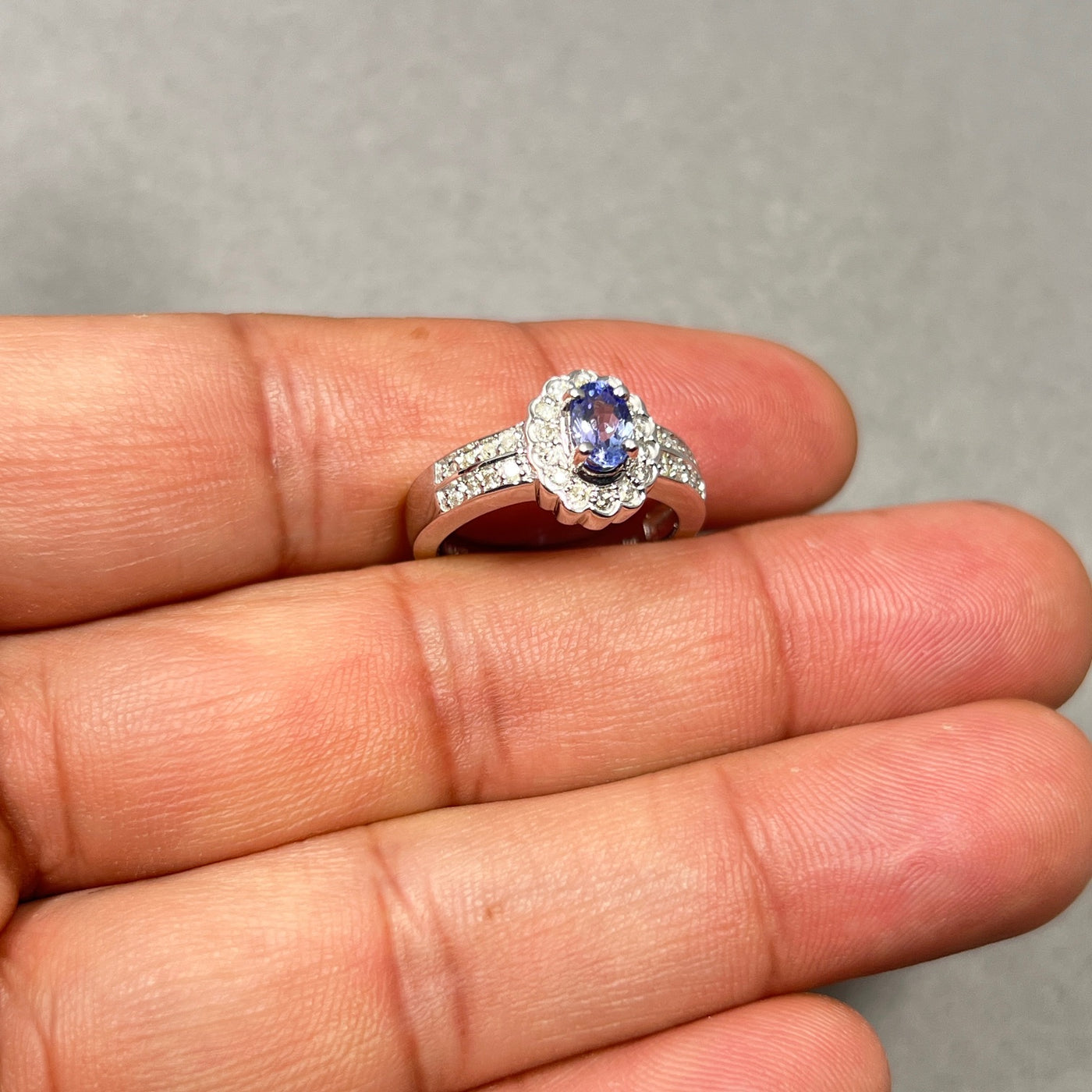 This Tanzanite and Diamond Ring in 14K White Gold features one oval natural tanzanite weighing approximately 0.42 ct, complemented by natural white diamonds totaling approximately 0.33 ct. All stones are prong-set in solid 14K white gold with rhodium finishing.