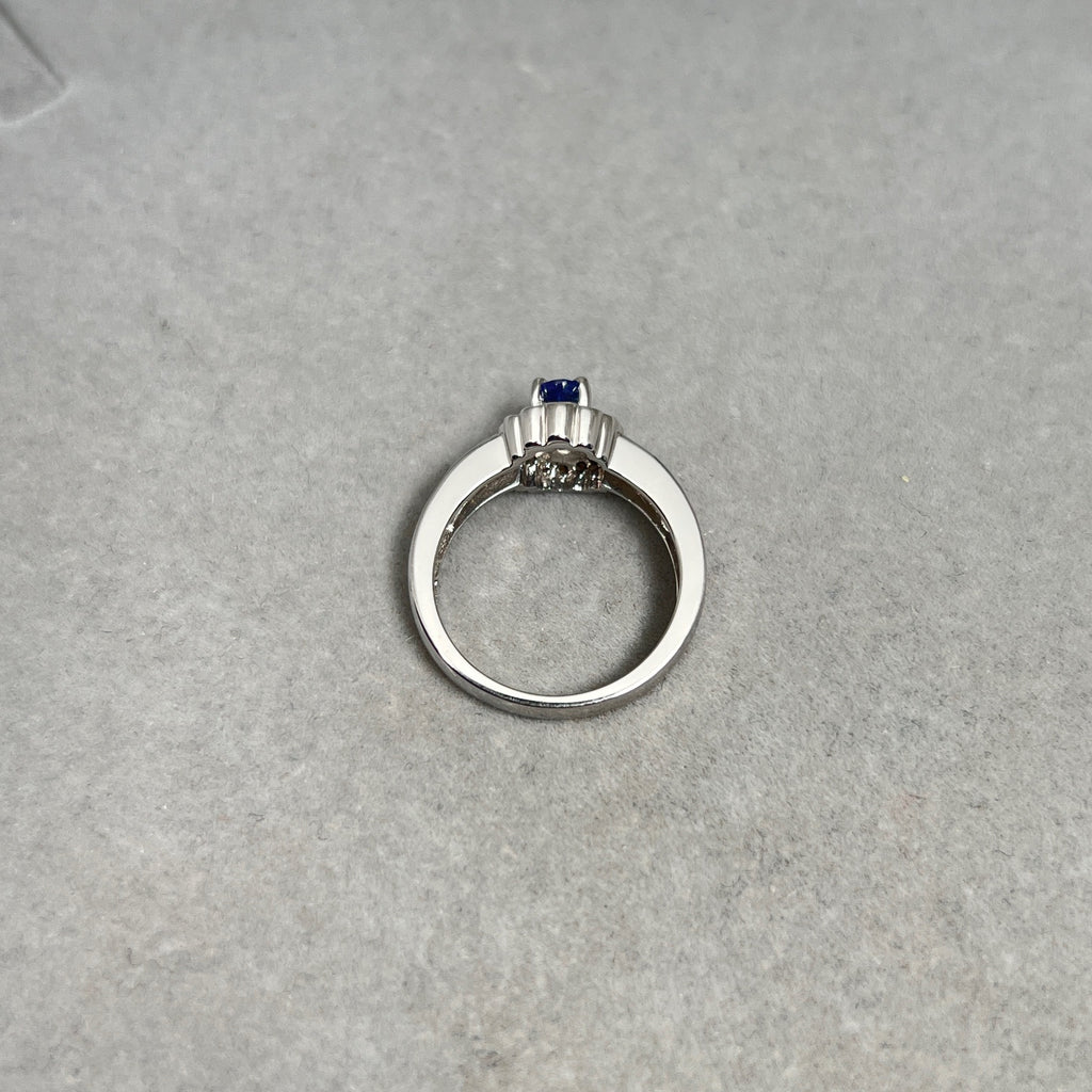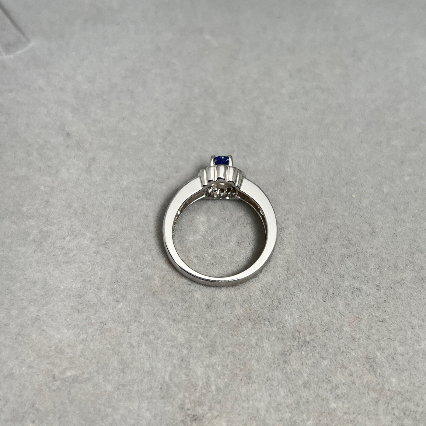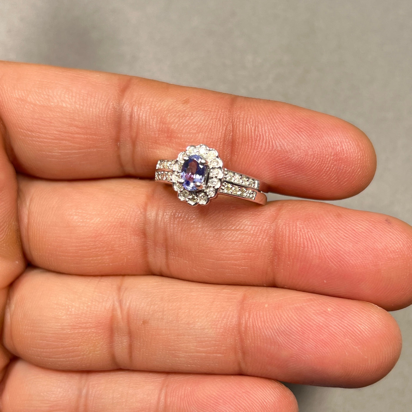 This Tanzanite and Diamond Ring in 14K White Gold features one oval natural tanzanite weighing approximately 0.42 ct, complemented by natural white diamonds totaling approximately 0.33 ct. All stones are prong-set in solid 14K white gold with rhodium finishing.