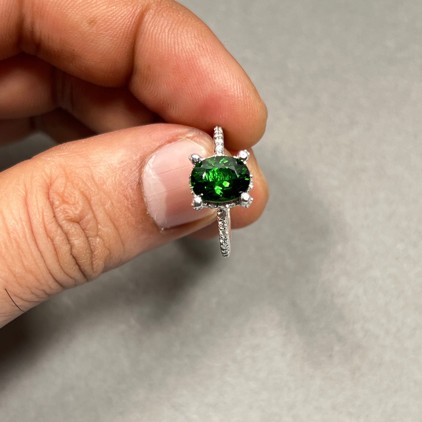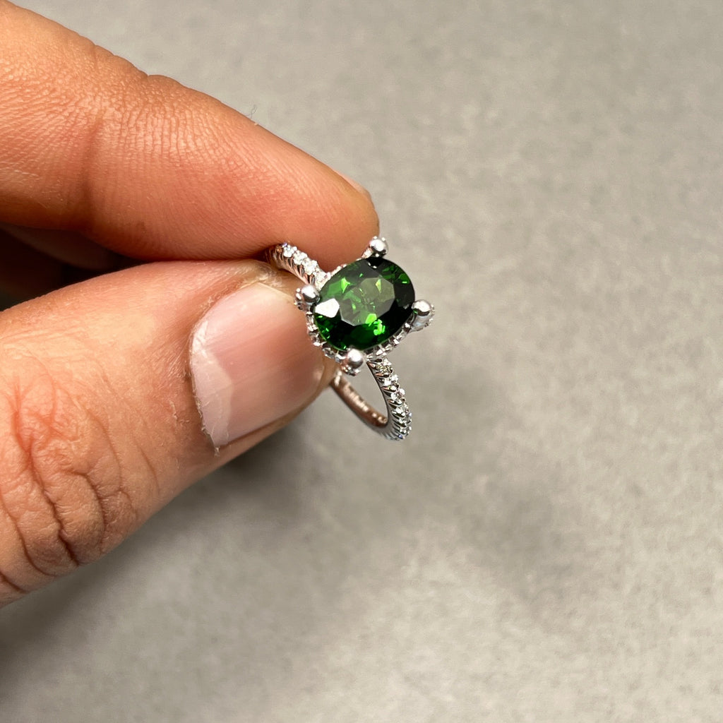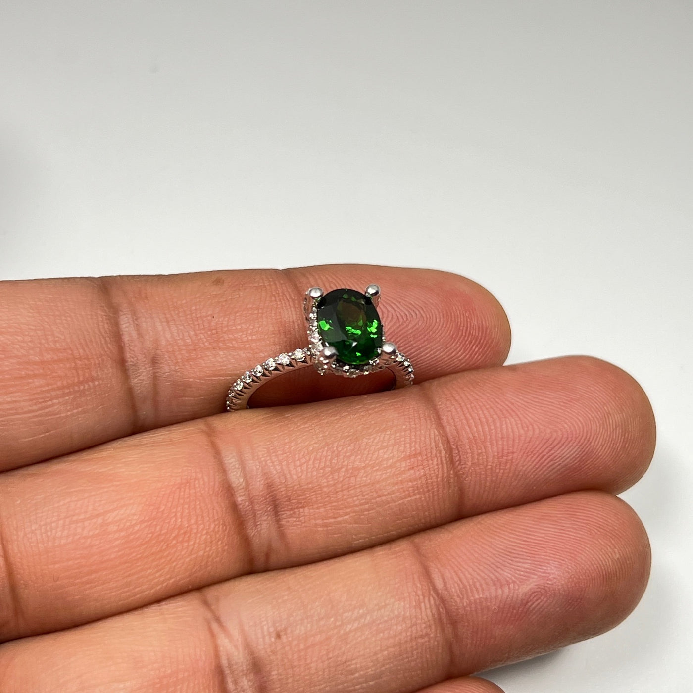 This stunning ring features a vibrant 1.86 Ct AAA Chrome Tourmaline, accented with sparkling diamonds totaling approximately 0.56 Ct, all set in luxurious 14K White Gold. The rich green hue of the chrome tourmaline is beautifully complemented by the brilliance of the diamonds, creating an exclusive and eye-catching piece. Perfect as an engagement ring, statement ring, or a treasured addition to any fine jewelry collection, this ring blends elegance, color, and quality craftsmanship.