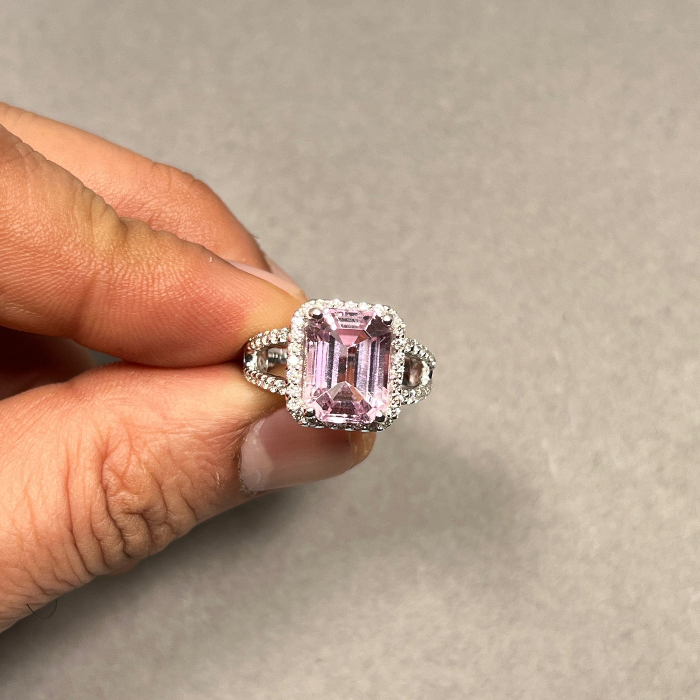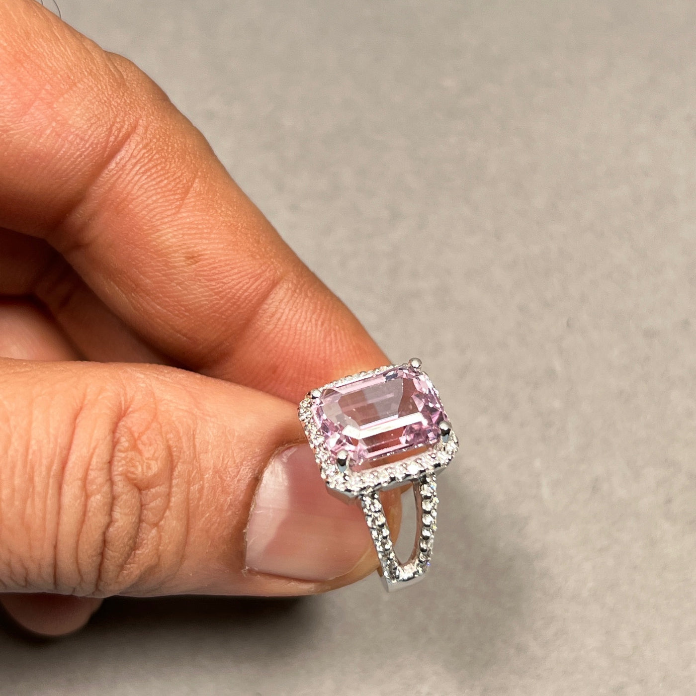 This exquisite ring features a striking 11x9 mm Emerald Cut Kunzite, complemented by sparkling diamonds totaling approximately 0.56 Ct, all set in luxurious 14K White Gold. With a total Kunzite weight of approximately 6.57 Ct, this ring exudes elegance and sophistication. Known for its calming energy and believed to enhance devotion, Kunzite makes this piece not only visually stunning but meaningful as well. Perfect as an engagement ring, statement piece, or a treasured addition to any jewelry collection.