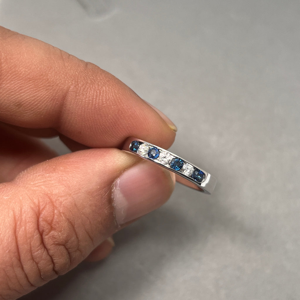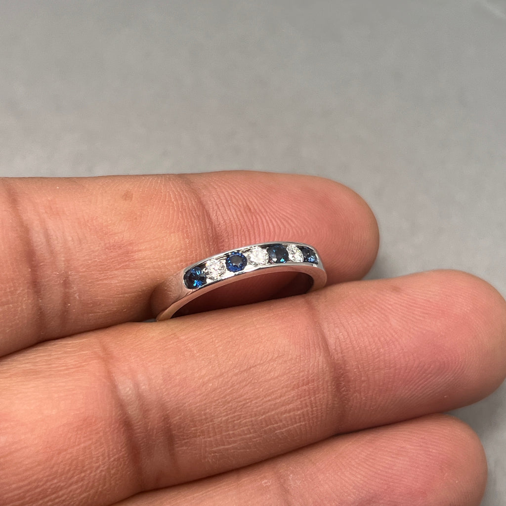 0.70 Ct Diamond & AAA Blue Sapphire Stackable Band in 14K White Gold | Channel-Set Gemstone Ring, Elegant Stackable Jewelry Size 8