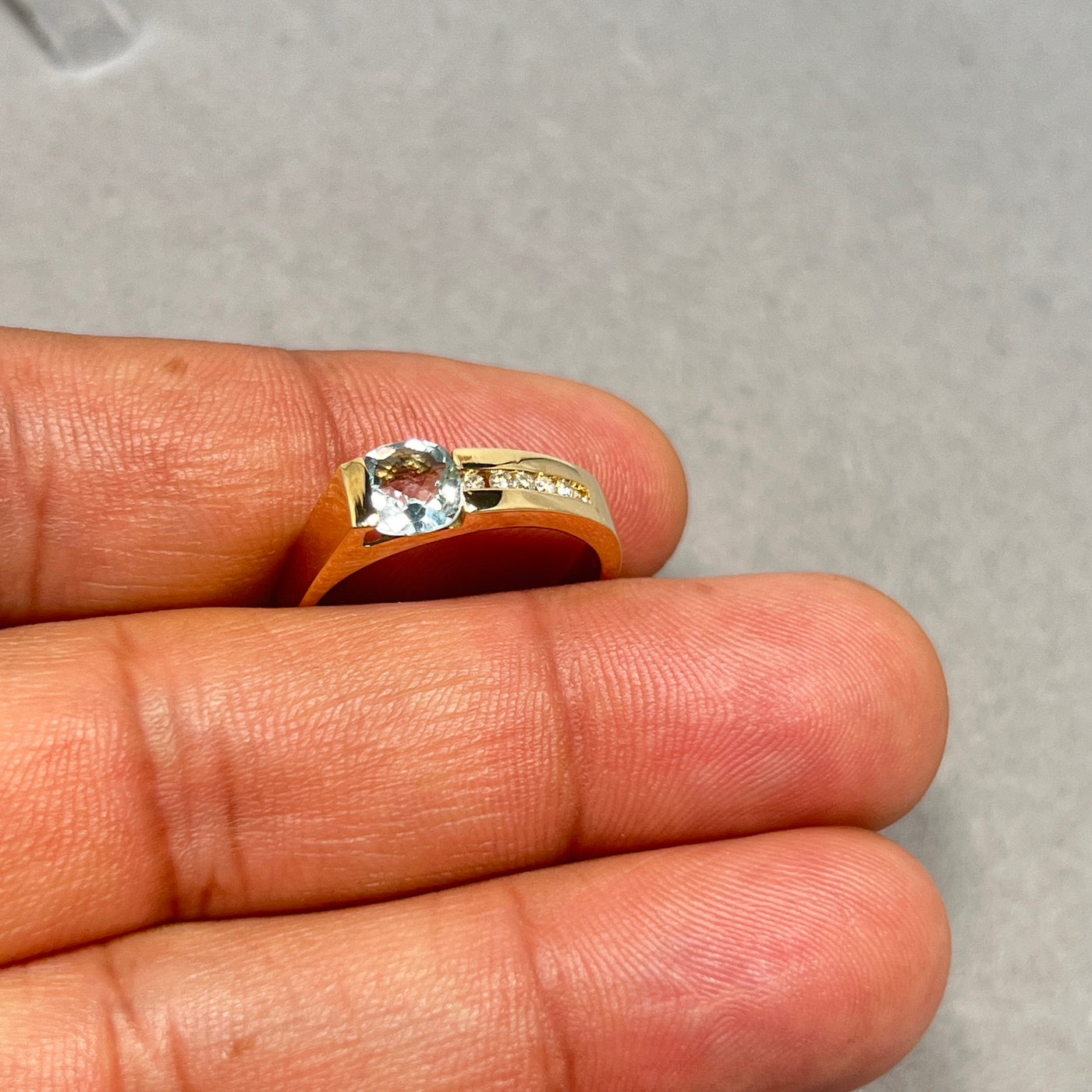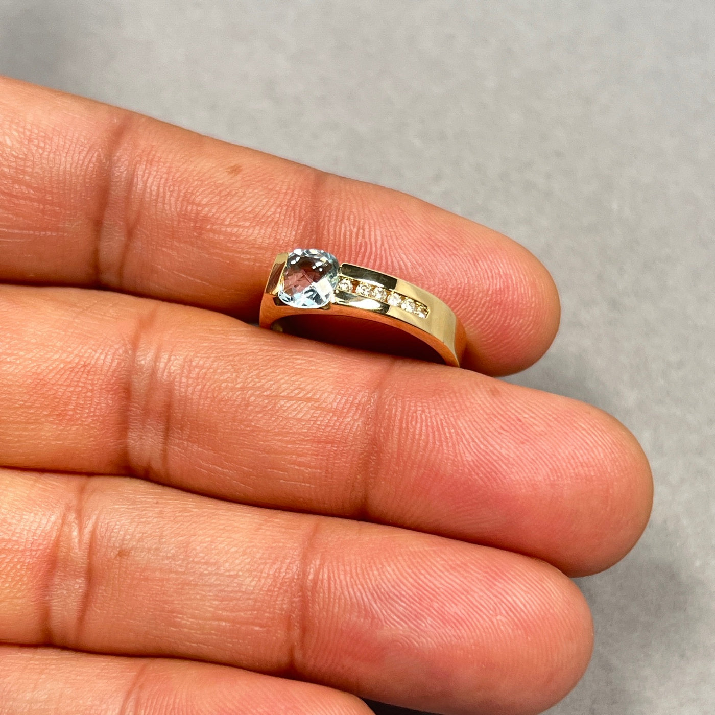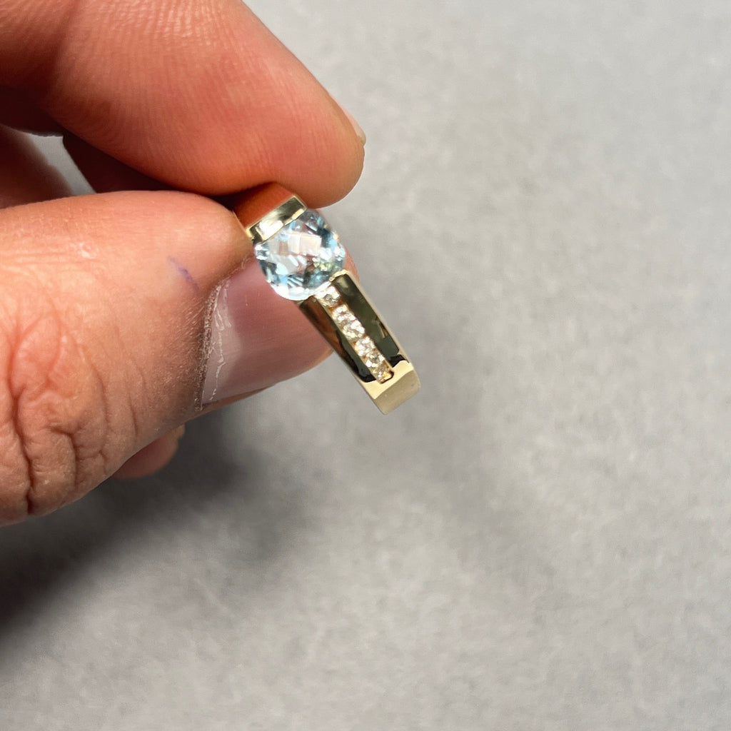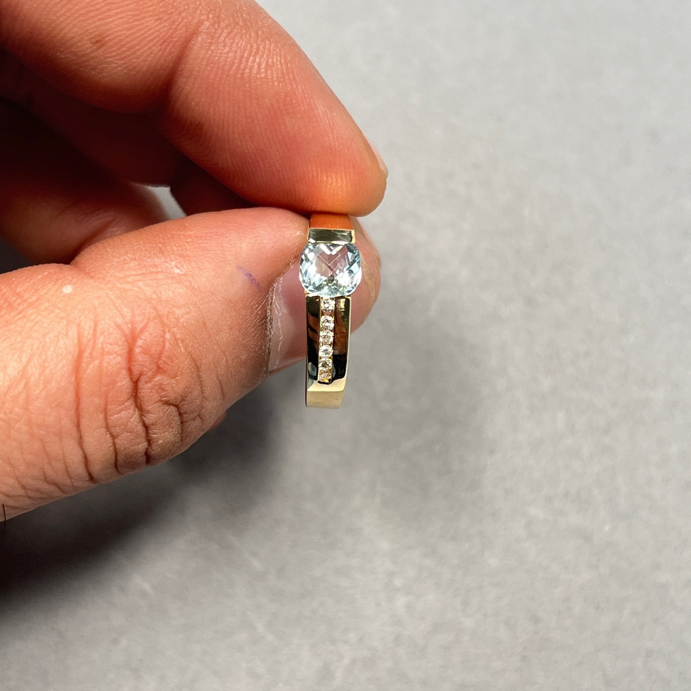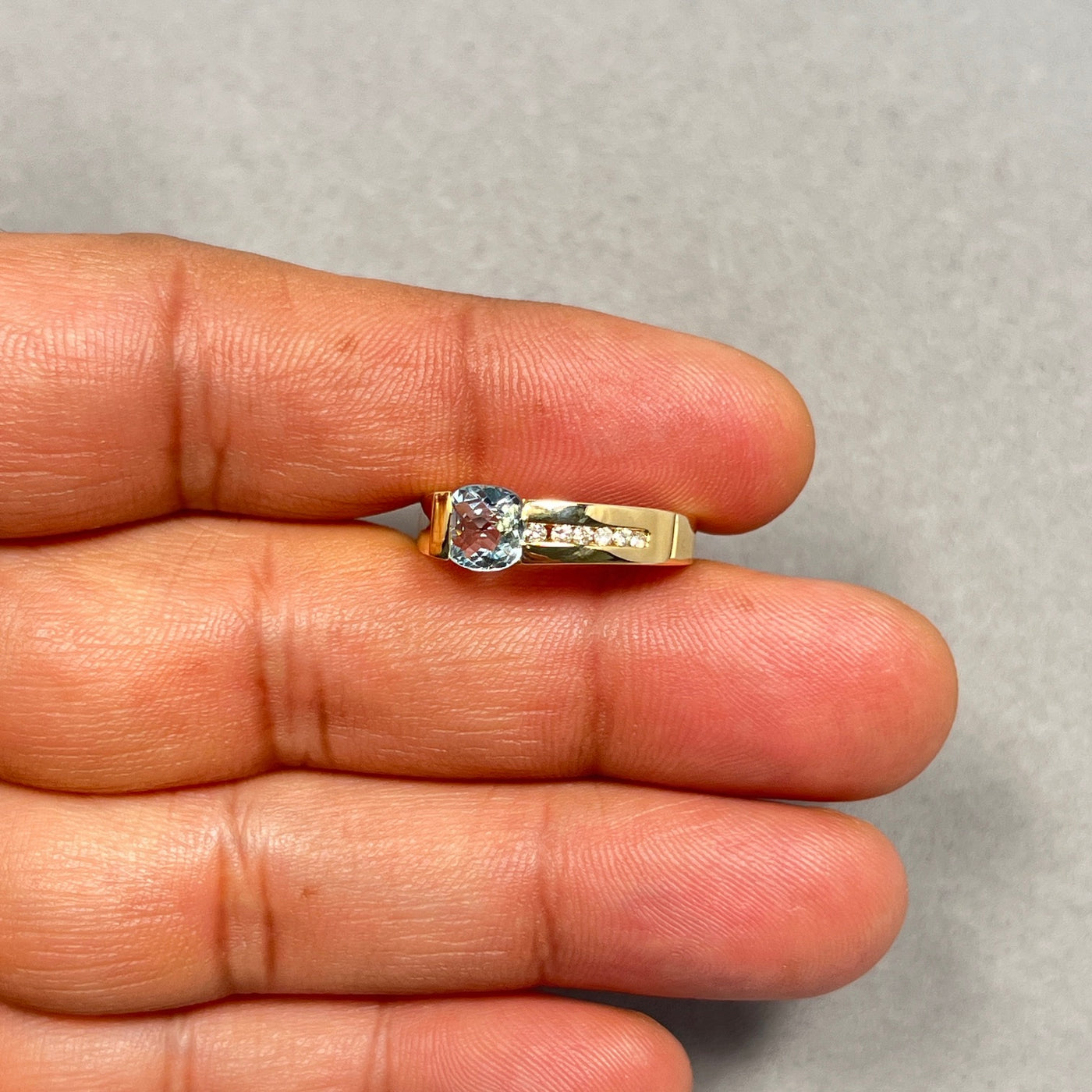 0.92 Ct Aquamarine & 0.09 Ct Diamond Ring | Cushion Checker Cut | 14K Yellow Gold Fine Jewelry | March Birthstone Gift