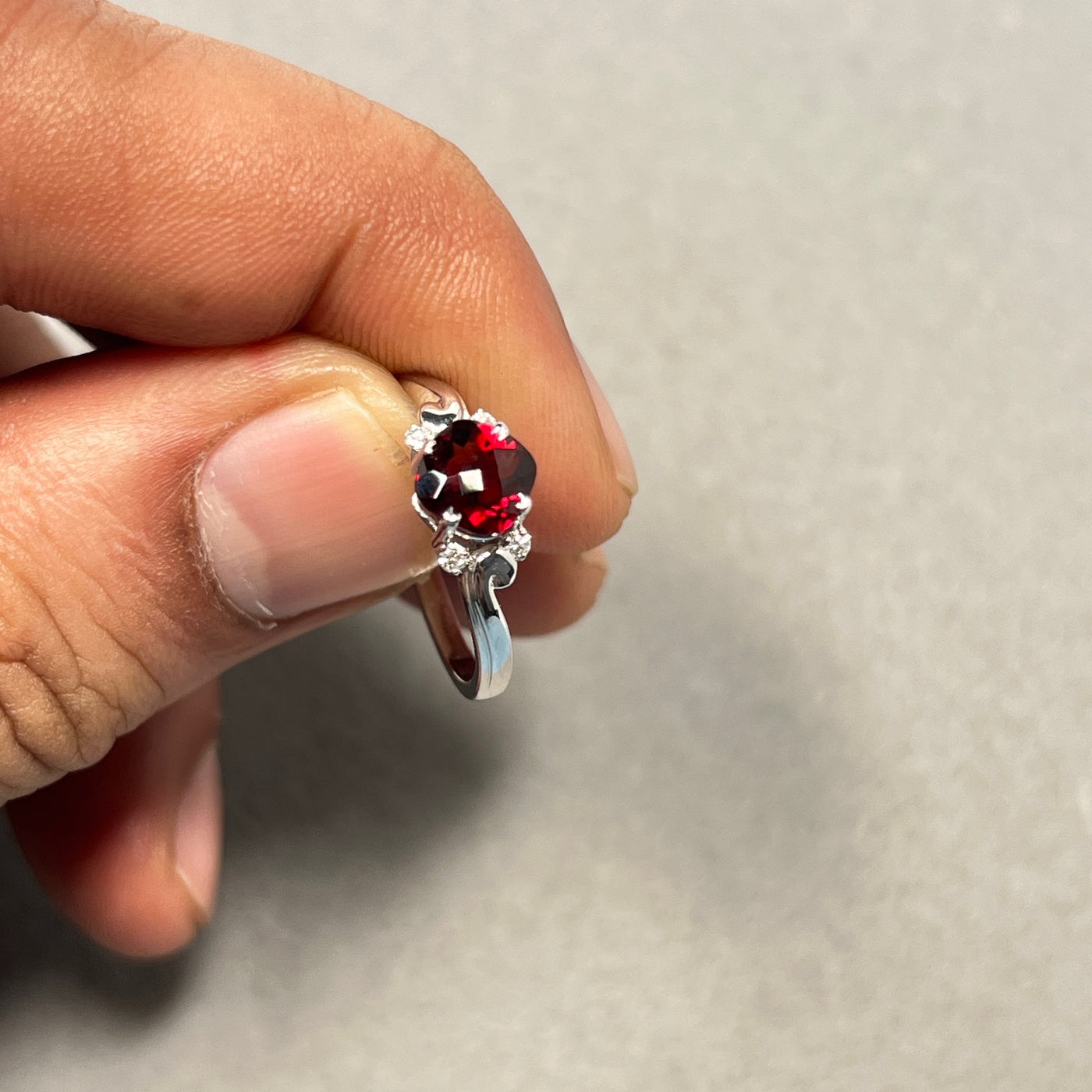 Celebrate love and timeless beauty with this enchanting 1.20 Ct AAA Garnet & 0.05 Ct Diamond Ring, beautifully crafted in solid 14K White Gold. The centerpiece features a radiant cushion checkerboard-cut garnet, admired for its deep red brilliance — a symbol of passion, energy, and devotion.