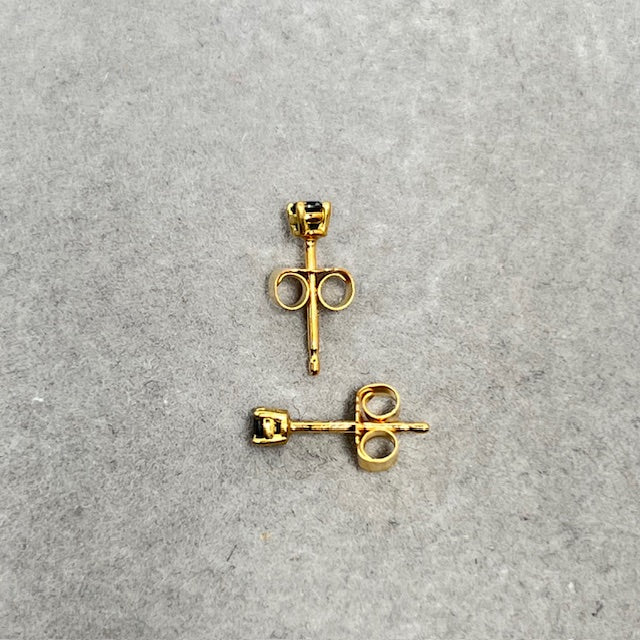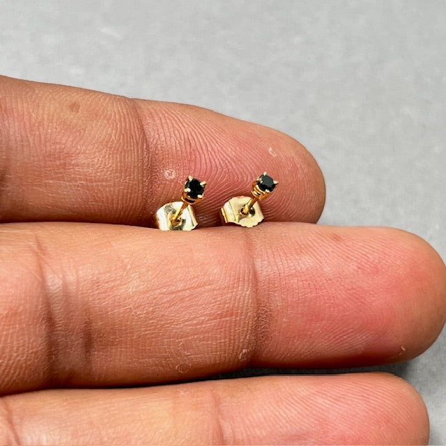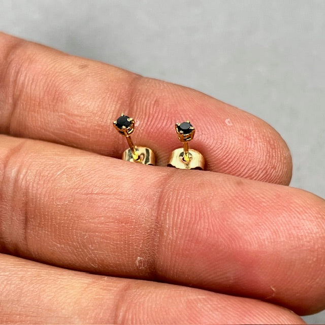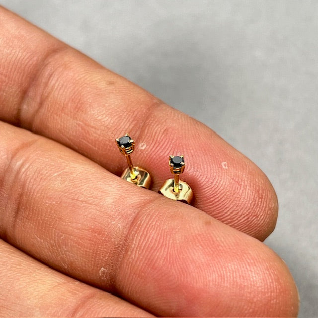 Elevate your everyday style with these exquisite AA Round Black Diamond Stud Earrings, elegantly set in 18K Yellow Gold. Each earring features a 2.50–3.00 mm round black diamond, totalling approximately 0.09–0.12 carats, securely held in a timeless four-prong setting. Perfectly balancing classic design with modern sophistication, these studs are ideal for both casual and formal occasions. Lightweight and comfortable, they come with push-back closures for a secure fit.