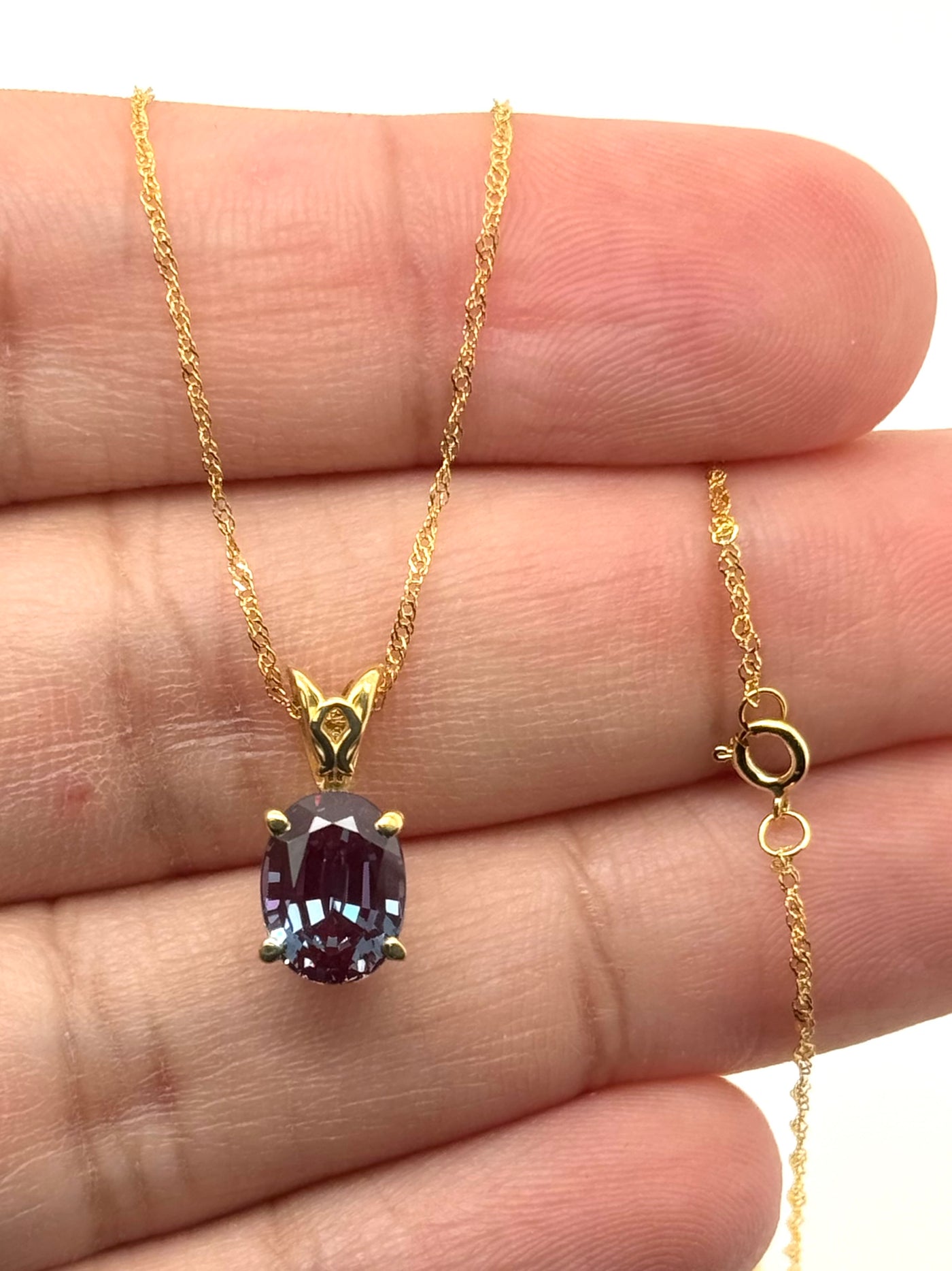 1.94–2.60 Ct AAA Oval Lab-Created Alexandrite Scroll Solitaire Pendant in 14K Yellow Gold