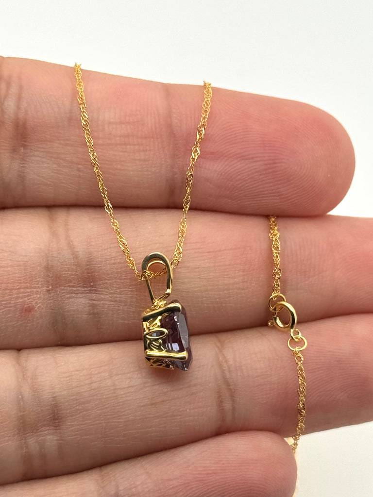 This stunning Lab-Created Alexandrite Scroll Solitaire Pendant features an AAA-quality 9x7 mm oval alexandrite expertly prong-set in a beautifully crafted 14K Yellow Gold scroll-style setting. With an approximate gemstone weight of 1.94–2.60 Carats, this pendant showcases a breathtaking 100% color-change effect—transitioning from vivid green to deep purple depending on the lighting. Completed with an elegant 18-inch 14K Yellow Gold Singapore Chain, this piece blends classic charm with luxurious simplicity.