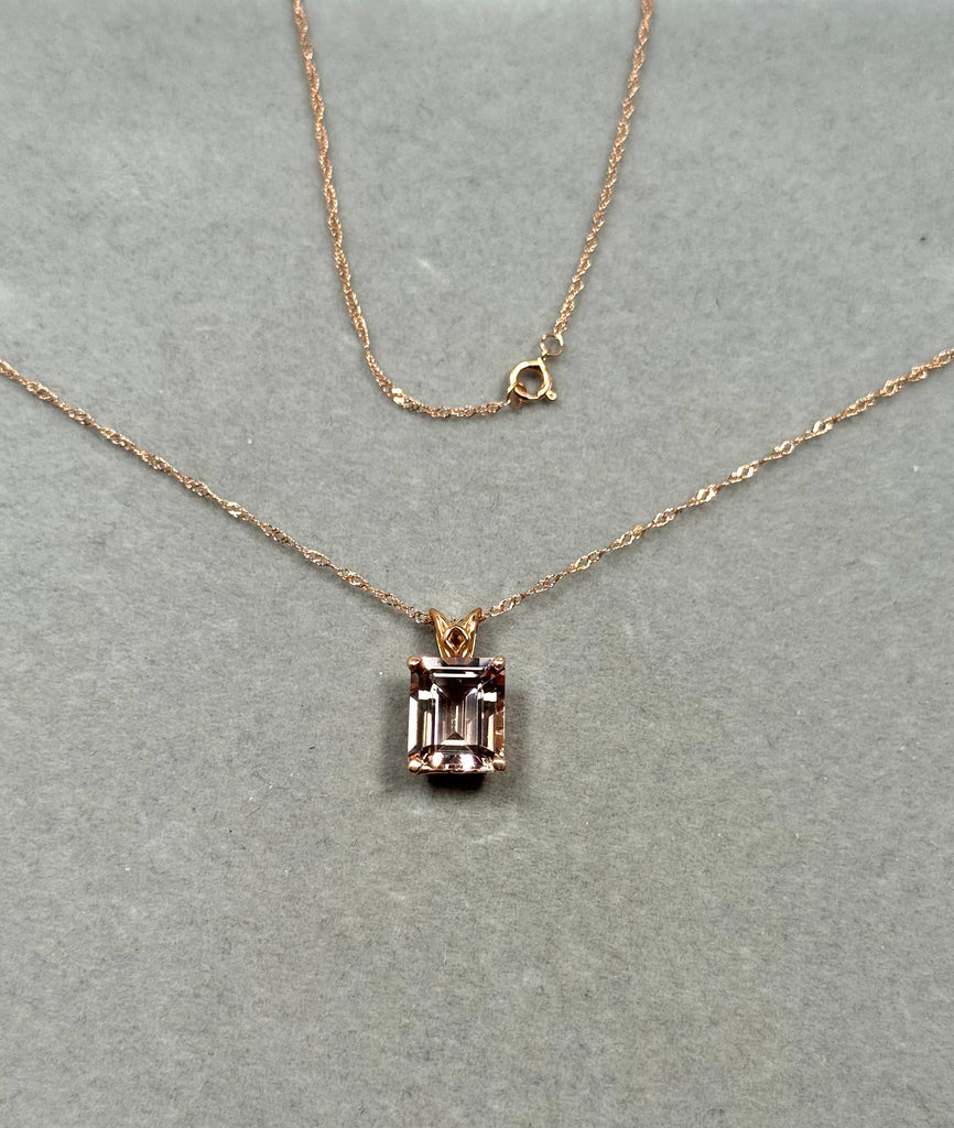 Elevate your elegance with this **14K Pink Gold Morganite Solitaire Scroll Pendant**, featuring a **AAA-quality emerald-cut Morganite** weighing approximately **2.65–3.23 carats**. The radiant peach-pink gemstone is expertly secured with **four prongs in 14K pink gold**, showcasing a timeless solitaire design accented with a graceful scroll motif. Finished with an **18-inch 14K Pink Gold Singapore chain**, this pendant is versatile enough for daily wear or special occasions.