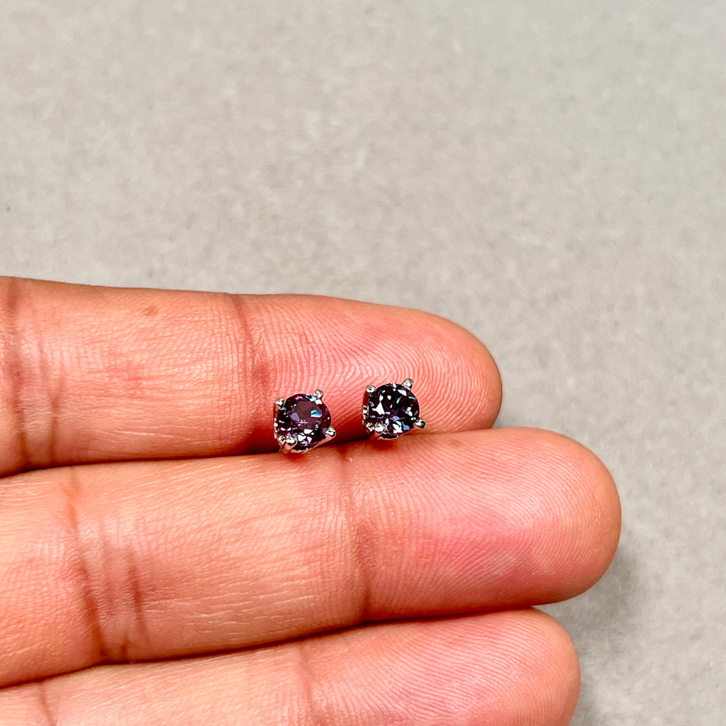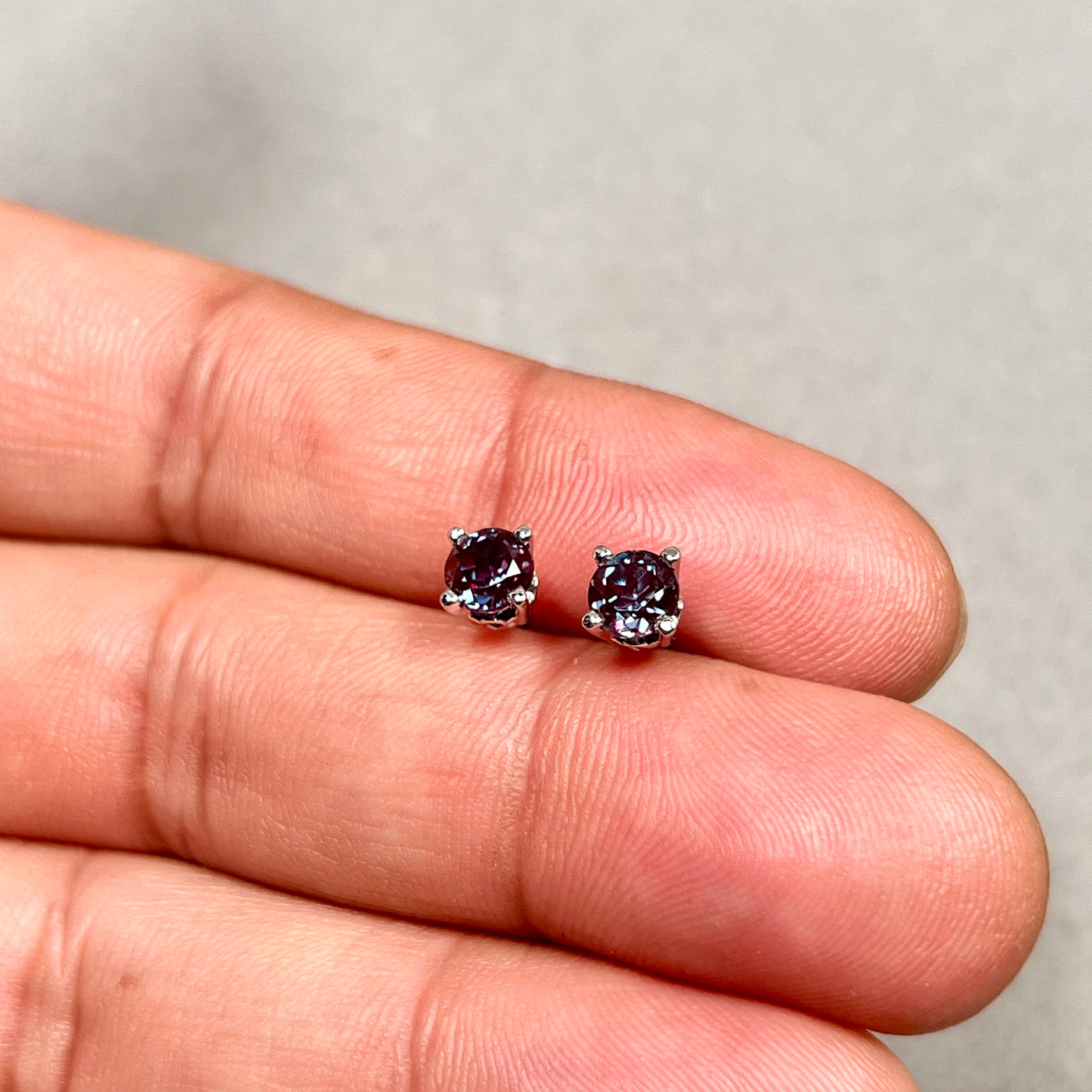 5mm Lab-Created Alexandrite Stud Earrings in 14K White Gold | Color-Change Round Scroll Solitaire Earrings | Fine Jewelry Gift