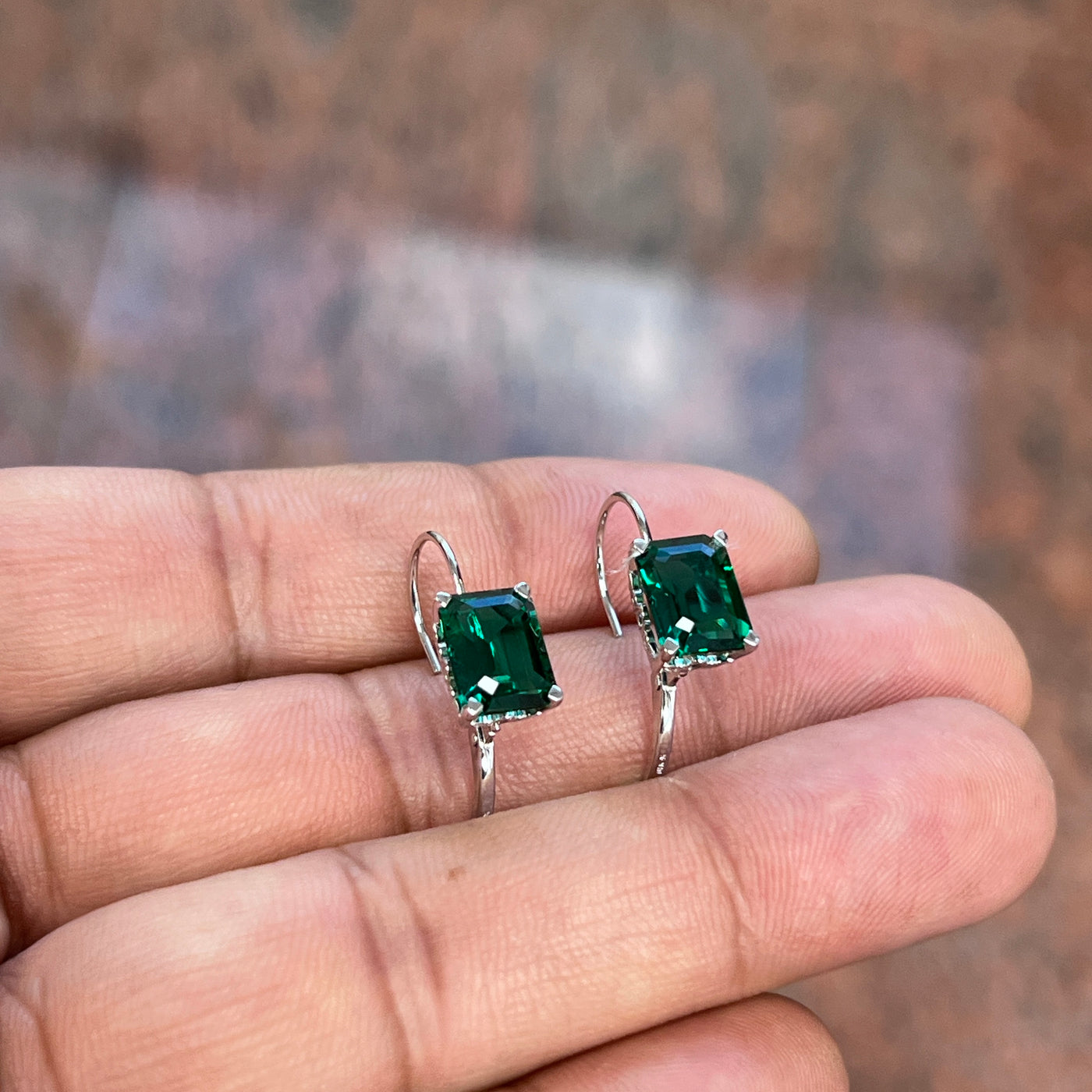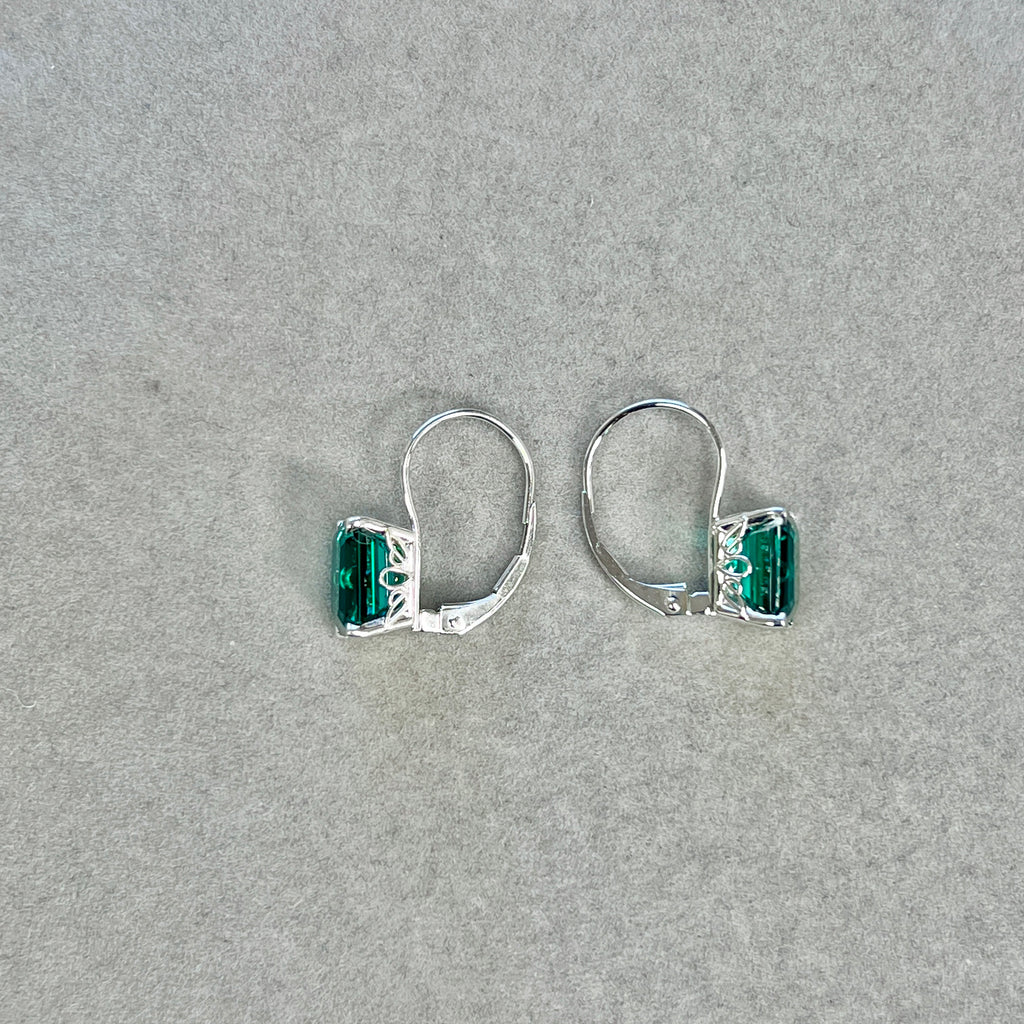 AAA 9x7mm Lab Created Emerald Stud Earrings with Scroll Lever Backs in 14K White Gold | 3.73–4.92 Ct Vintage Style