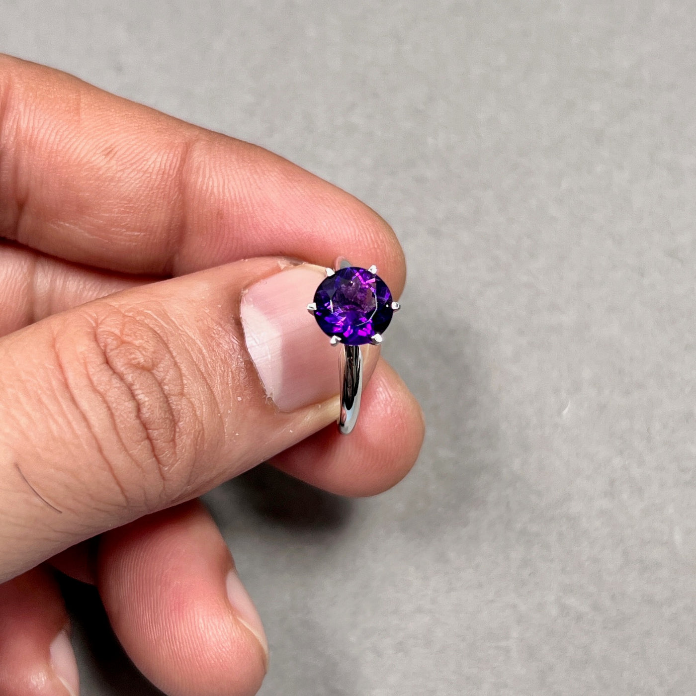 This elegant AAA Round Amethyst Solitaire Ring in 14K White Gold features a stunning 8mm amethyst weighing 1.27–1.97 carats, beautifully showcased in a secure six-prong solitaire setting. The deep violet brilliance of the amethyst captures light exquisitely, symbolizing peace, clarity, and feminine elegance. Crafted in solid 14K white gold, this timeless ring is perfect for everyday wear, special occasions, or as a cherished gift for someone who loves simple and refined luxury.