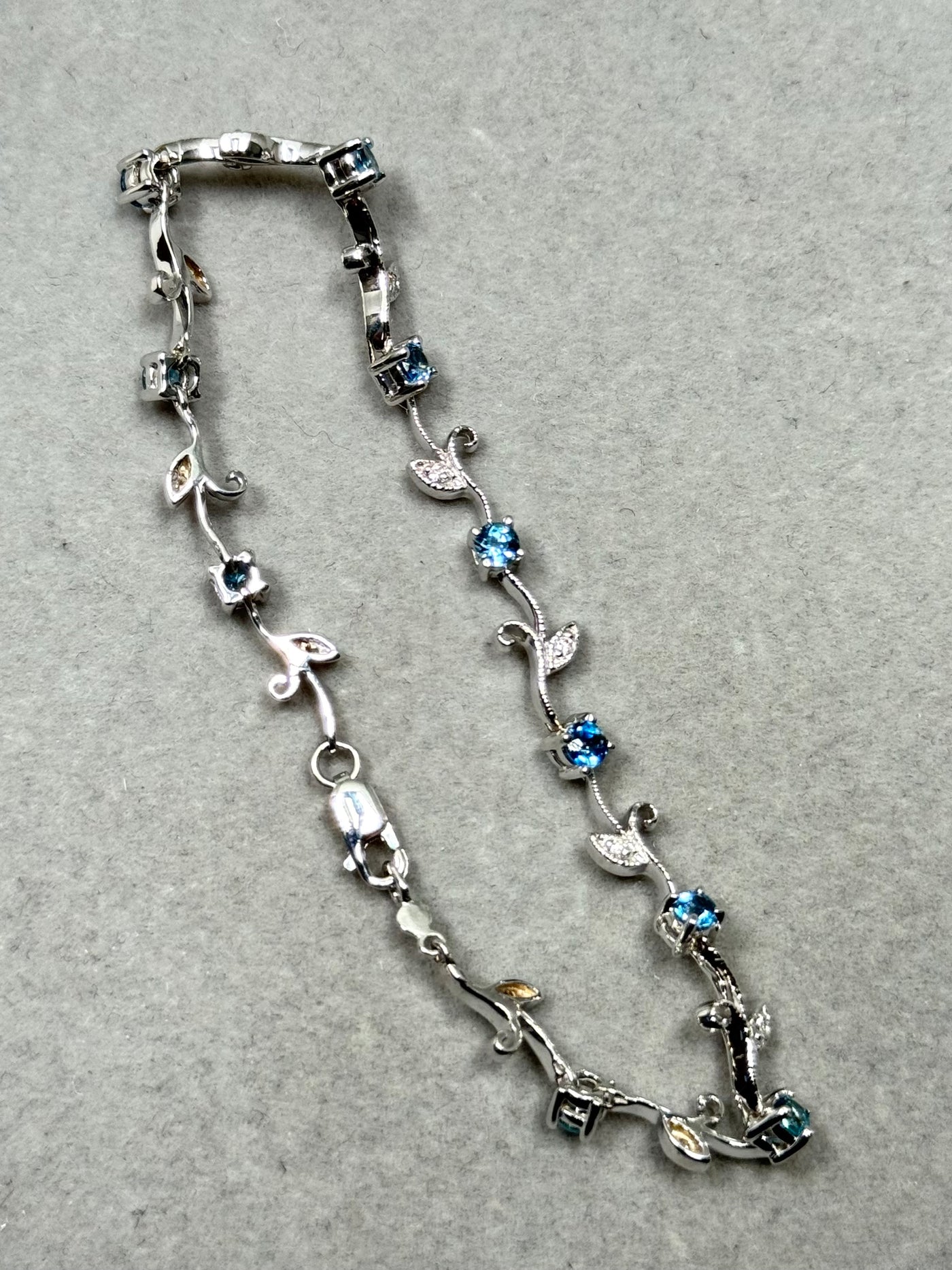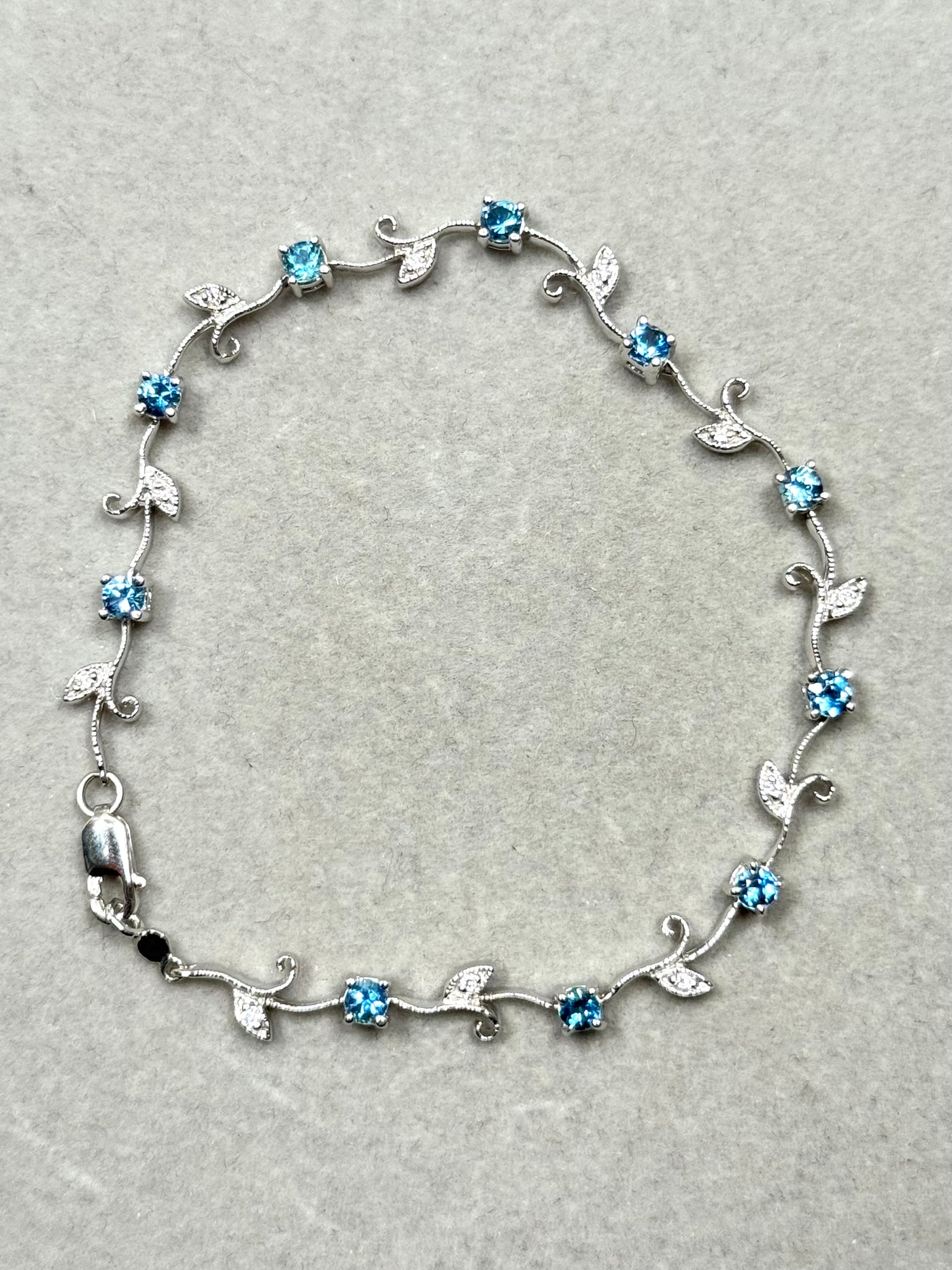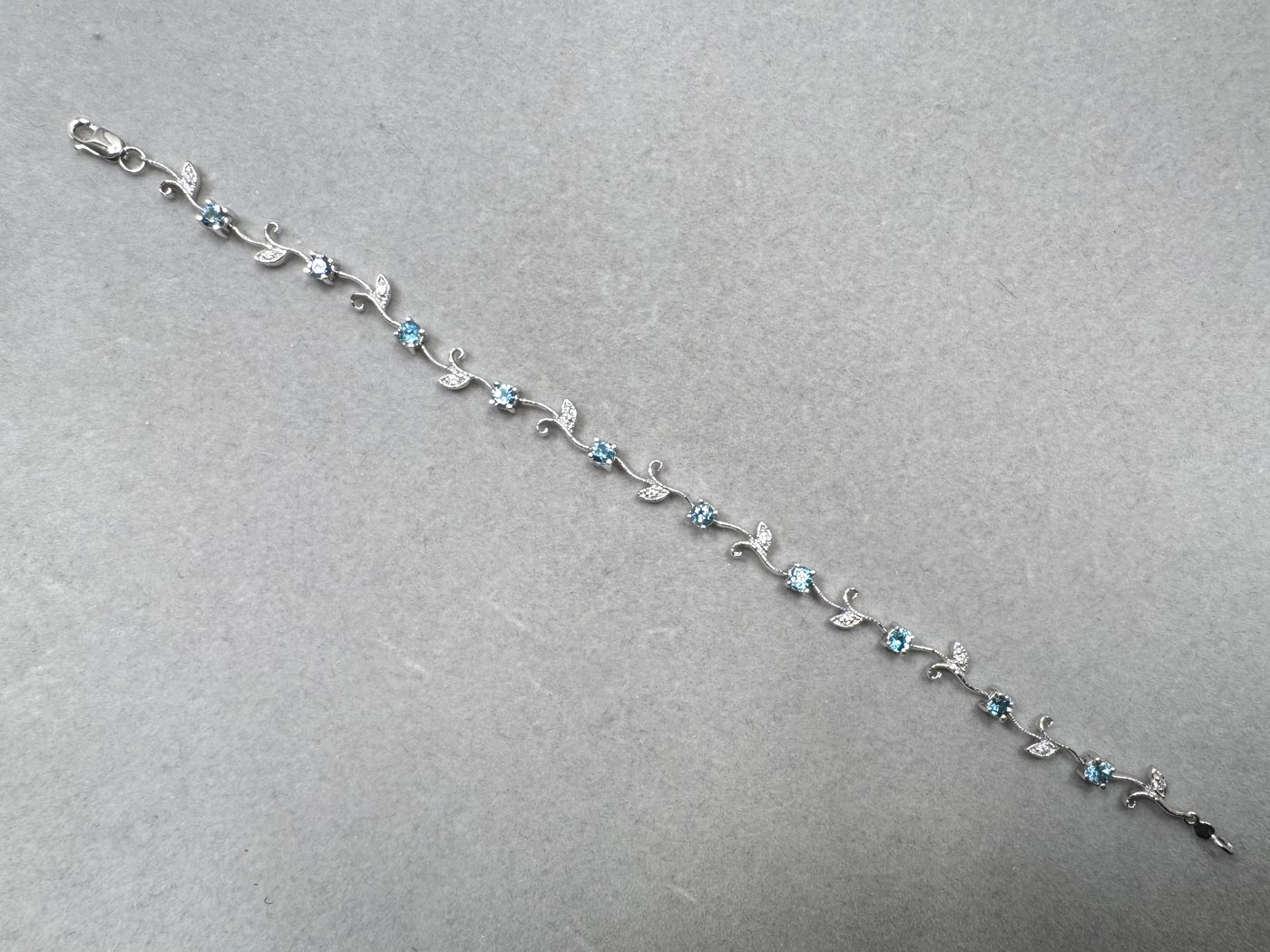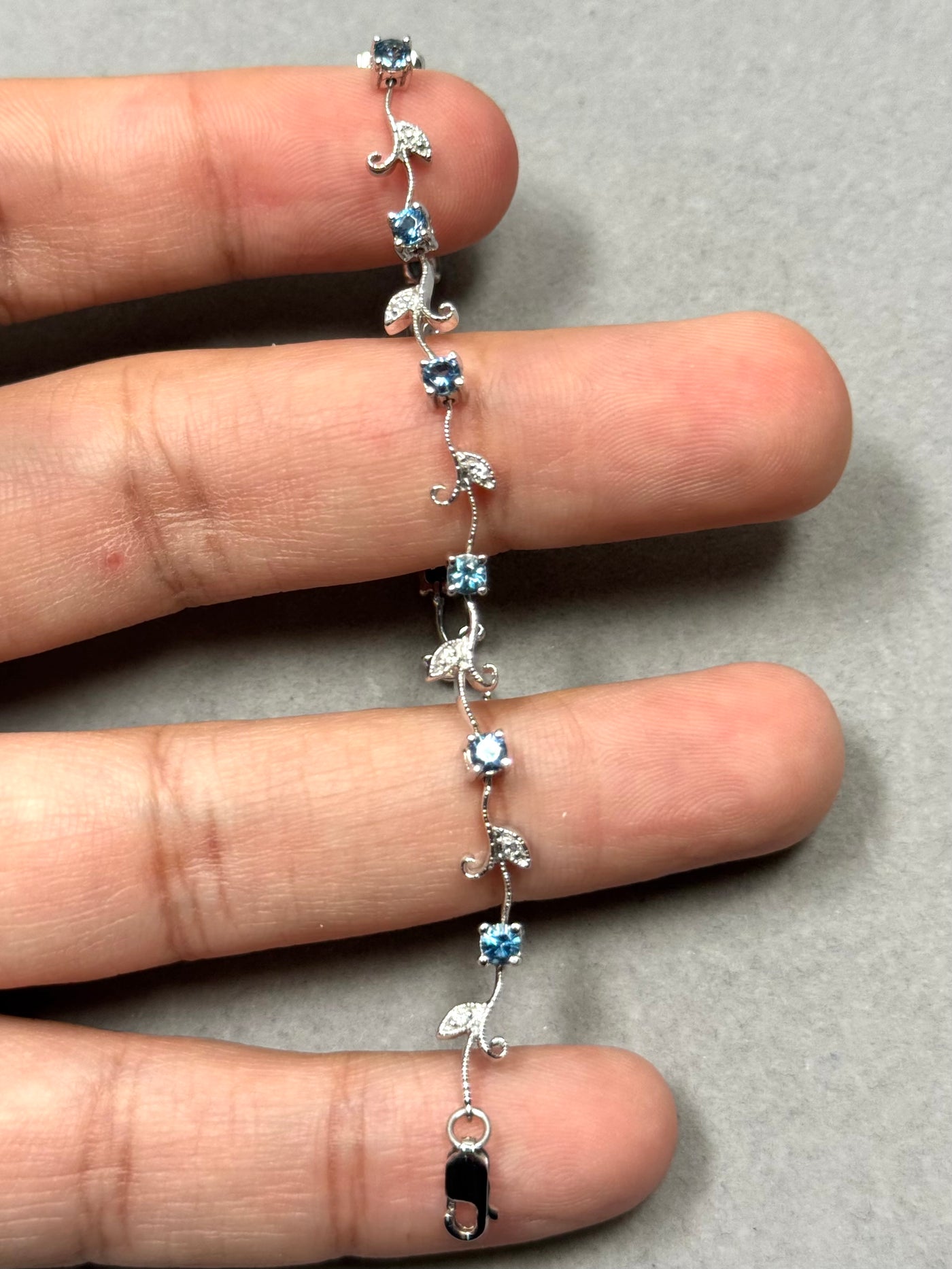 This refined 1.13 Ct Aquamarine and Diamond Bracelet features a graceful bud-and-leaf arrangement crafted in 14K White Gold. Ten natural aquamarines in soft light-blue tones pair with eleven round diamonds, each secured in precise prong settings for clarity, structure, and durability. The 7-inch length offers a comfortable, secure fit with a rhodium-enhanced finish and a lobster claw clasp.