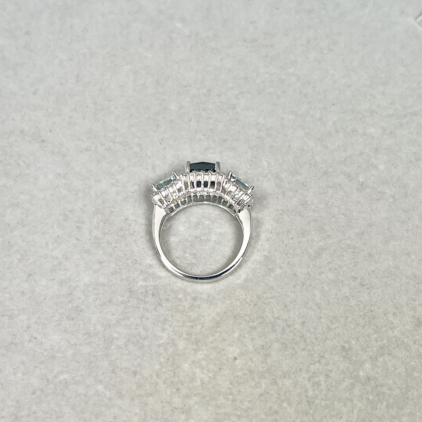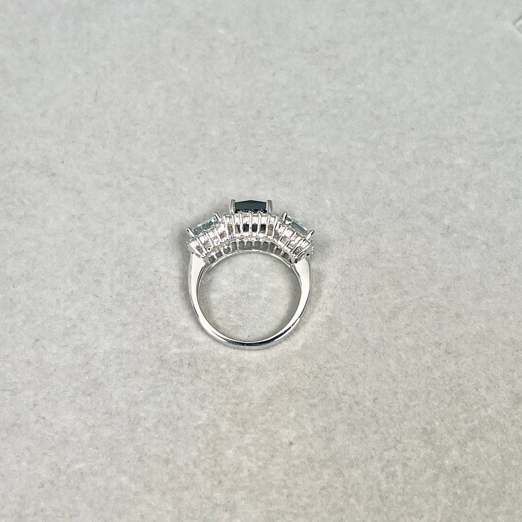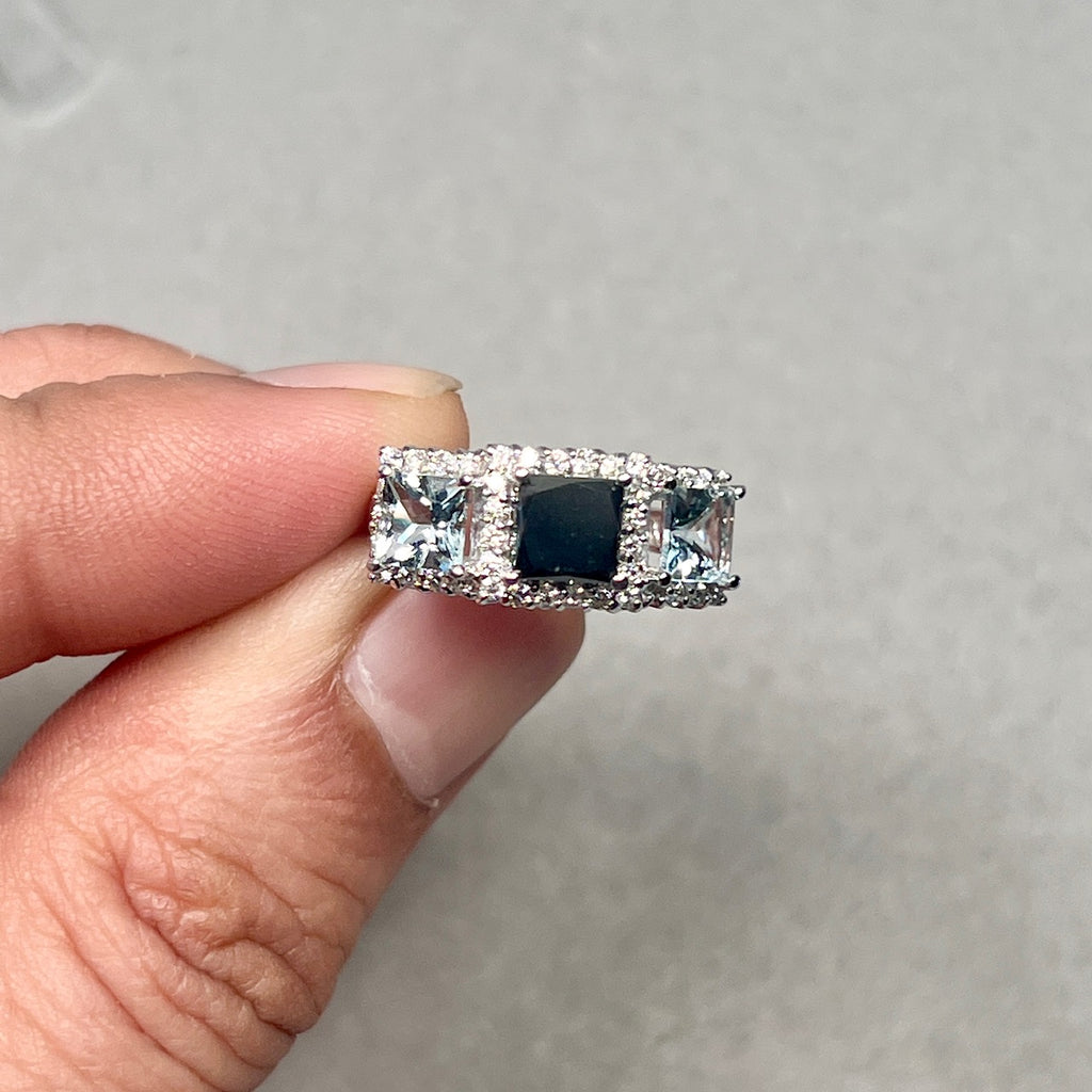 This statement ring features a princess-cut black diamond paired with soft blue aquamarines and sparkling white diamond accents.