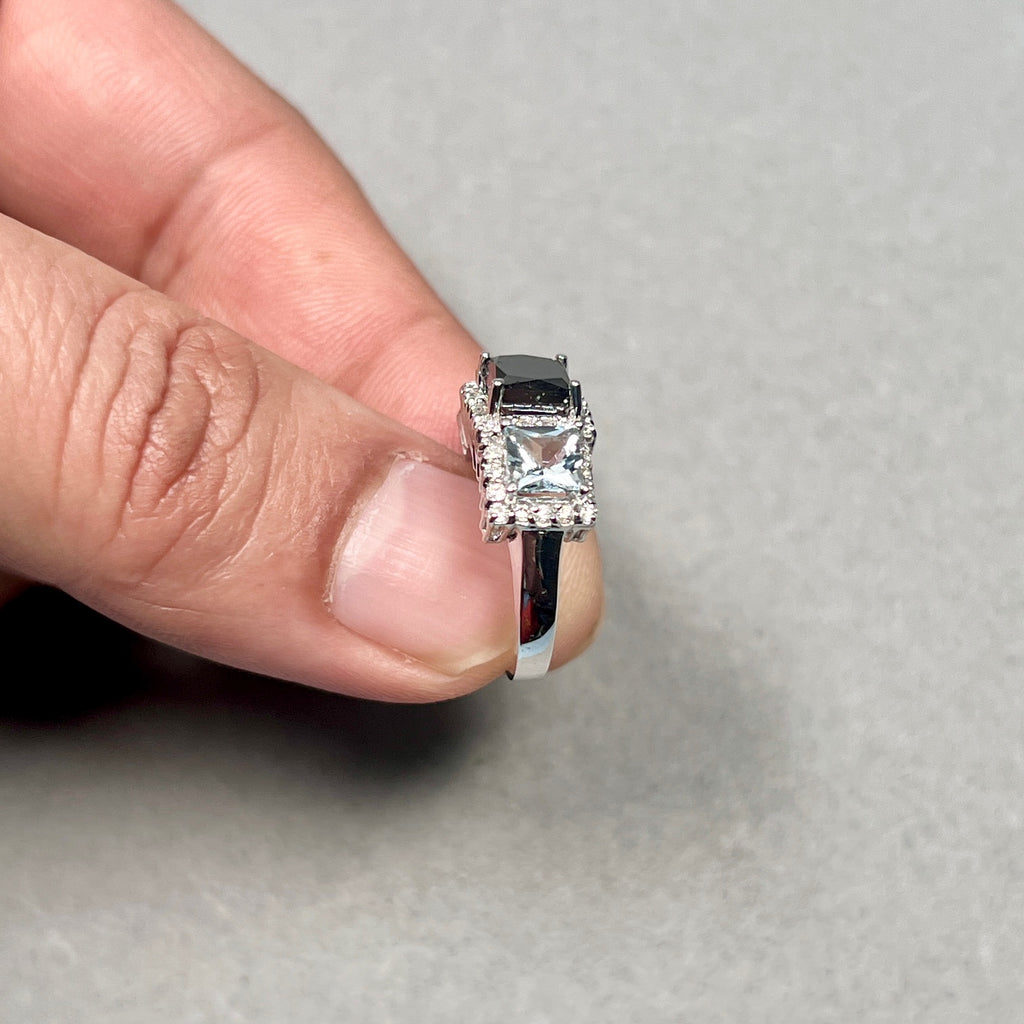 A black diamond and aquamarine ring in 14K white gold designed to combine bold contrast with refined elegance.
