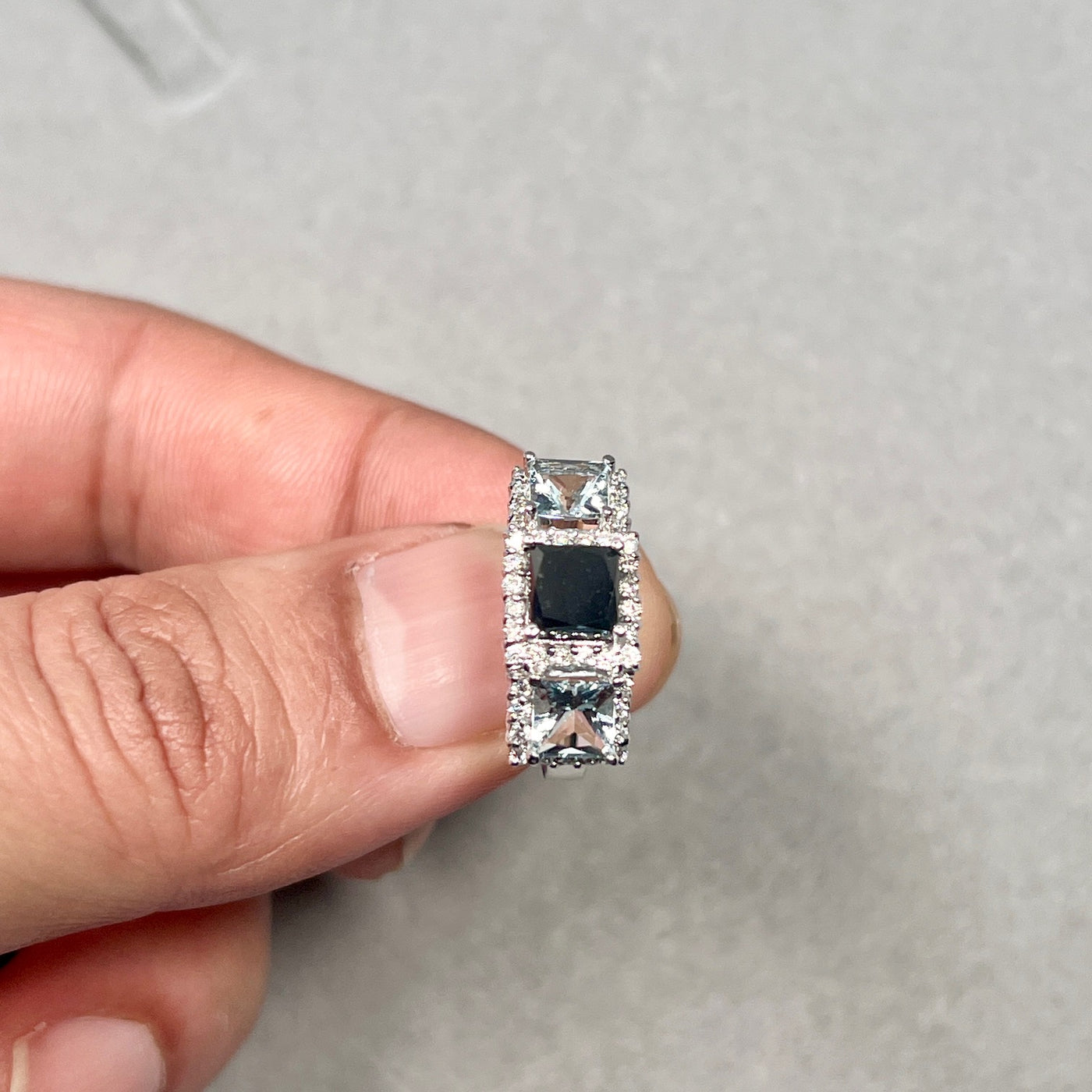 Bold contrast between black diamond and blue aquamarine