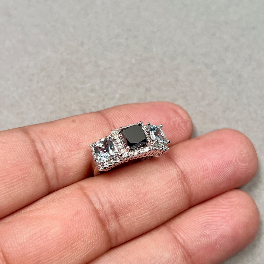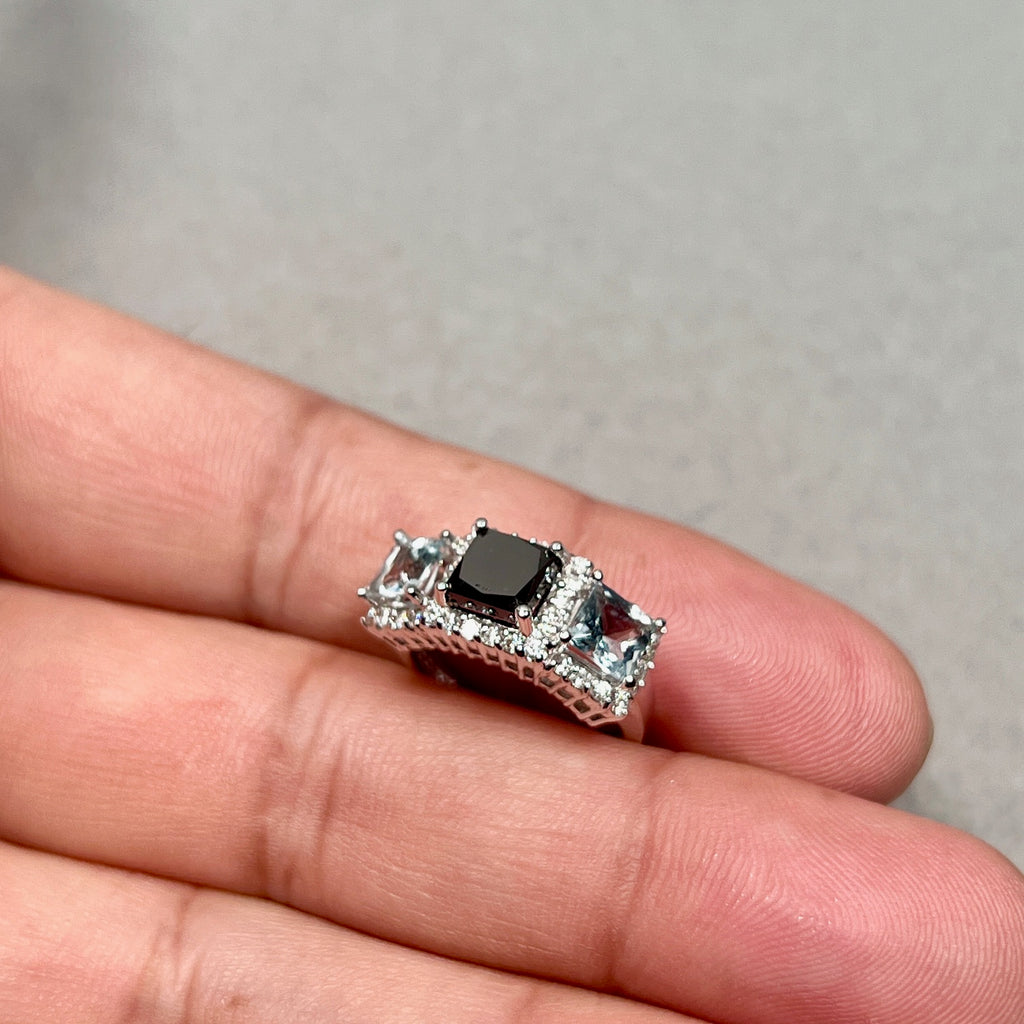 Black Diamond Aquamarine Ring 14K White Gold | 1.83 Ct Diamond Ring | Princess Cut Black Diamond | Blue Gemstone Statement Ring Size 5