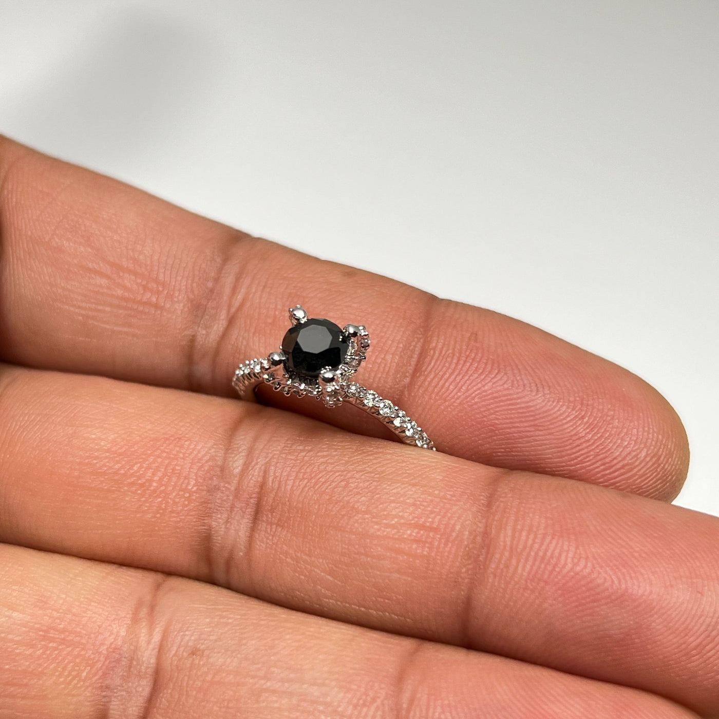 This elegant Black & White Diamond Ring in 14K White Gold features a striking contrast between a bold central 0.85 ct black diamond and surrounding 0.48 ct natural white diamonds. The stones are meticulously prong-set in polished rhodium-finished 14K white gold, delivering a refined and contemporary look.
