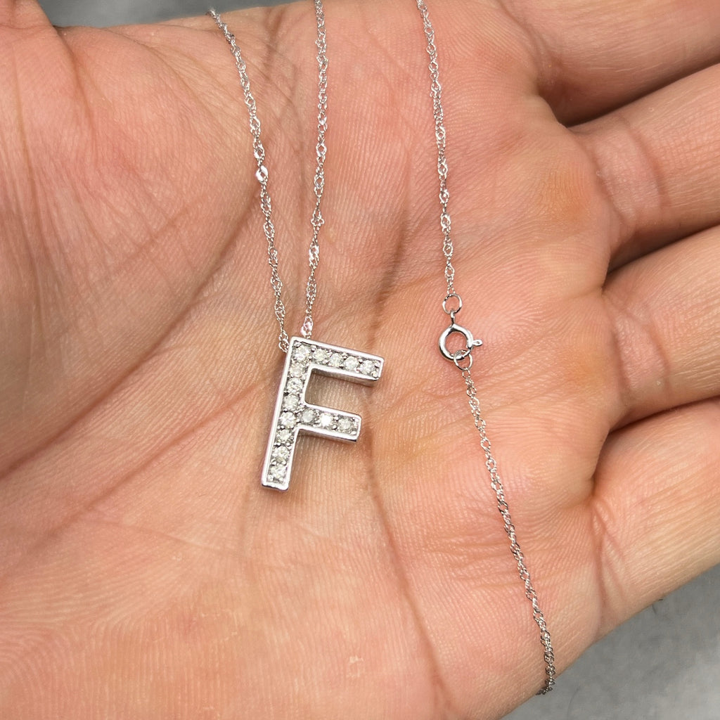 This elegant Diamond “F” Initial Pendant in 14K White Gold features 15 natural white diamonds, each prong-set to form a clean and modern letter design. With a total diamond weight of approximately 0.24–0.29 carats, the pendant offers classic sparkle with I–J color and SI2–I1 clarity diamonds.