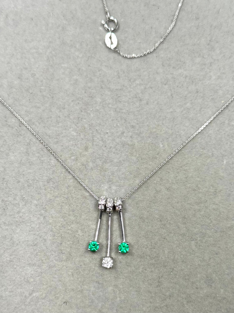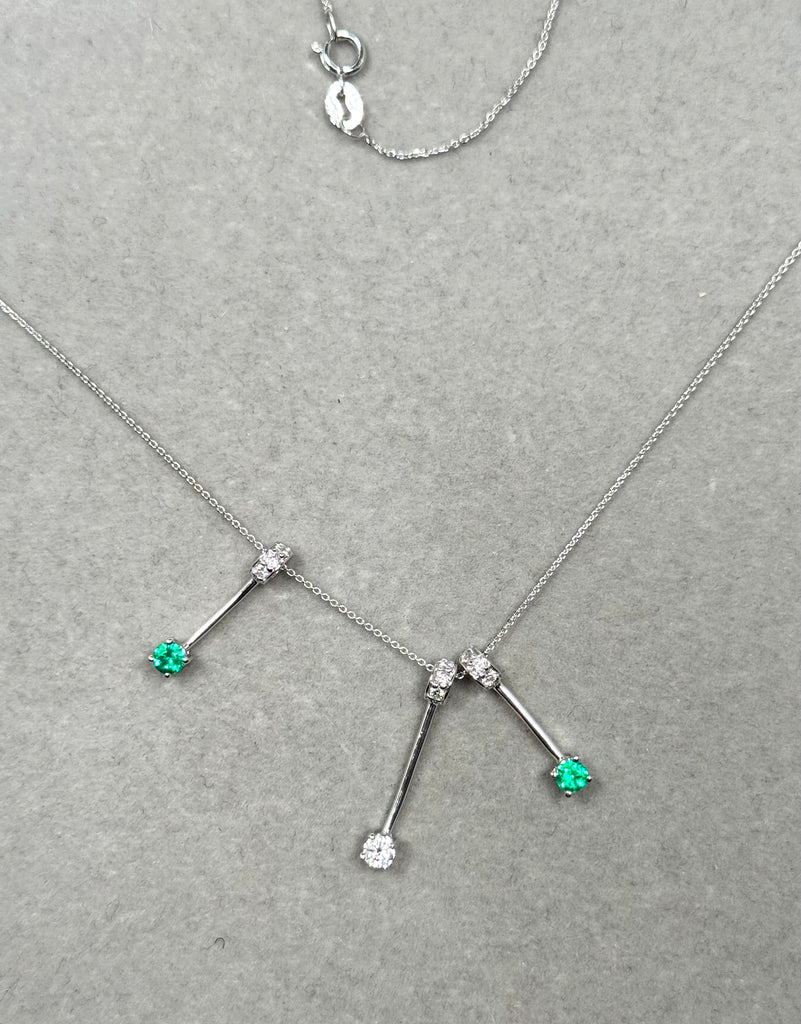 This elegant Emerald & Diamond Necklace in 14K White Gold features a delicate arrangement of natural 3 mm emeralds complemented by round natural diamonds. With approximately 0.18 ct of emeralds and 0.10 ct of diamonds, each stone is prong-set in polished rhodium-finished 14K white gold. The necklace is completed with an 18-inch Singapore chain and a spring-ring clasp.