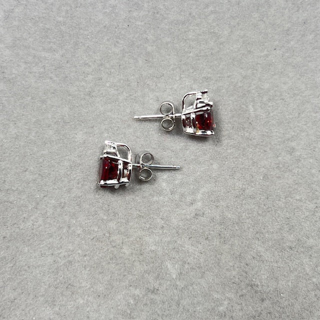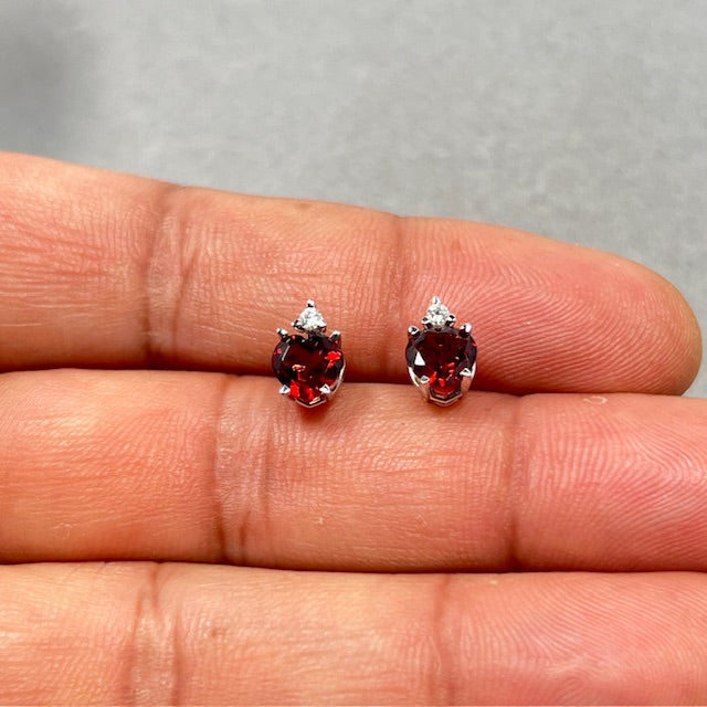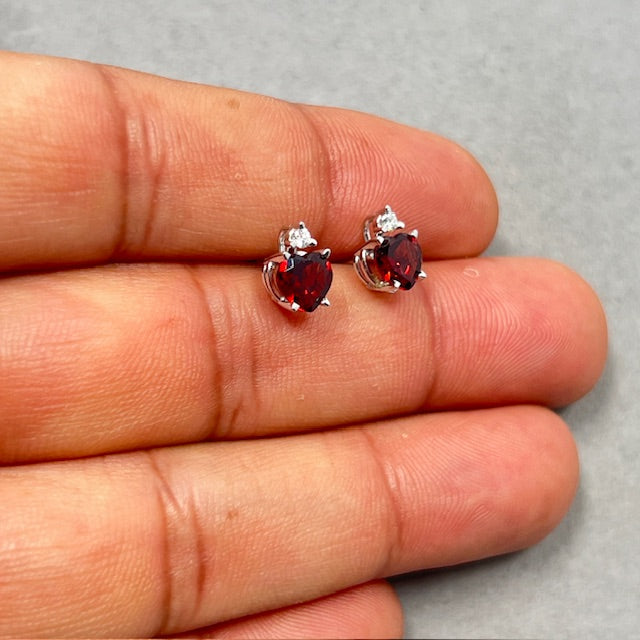 Heart Garnet Stud Earrings: 0.06 Ct Diamond, 14K White Gold