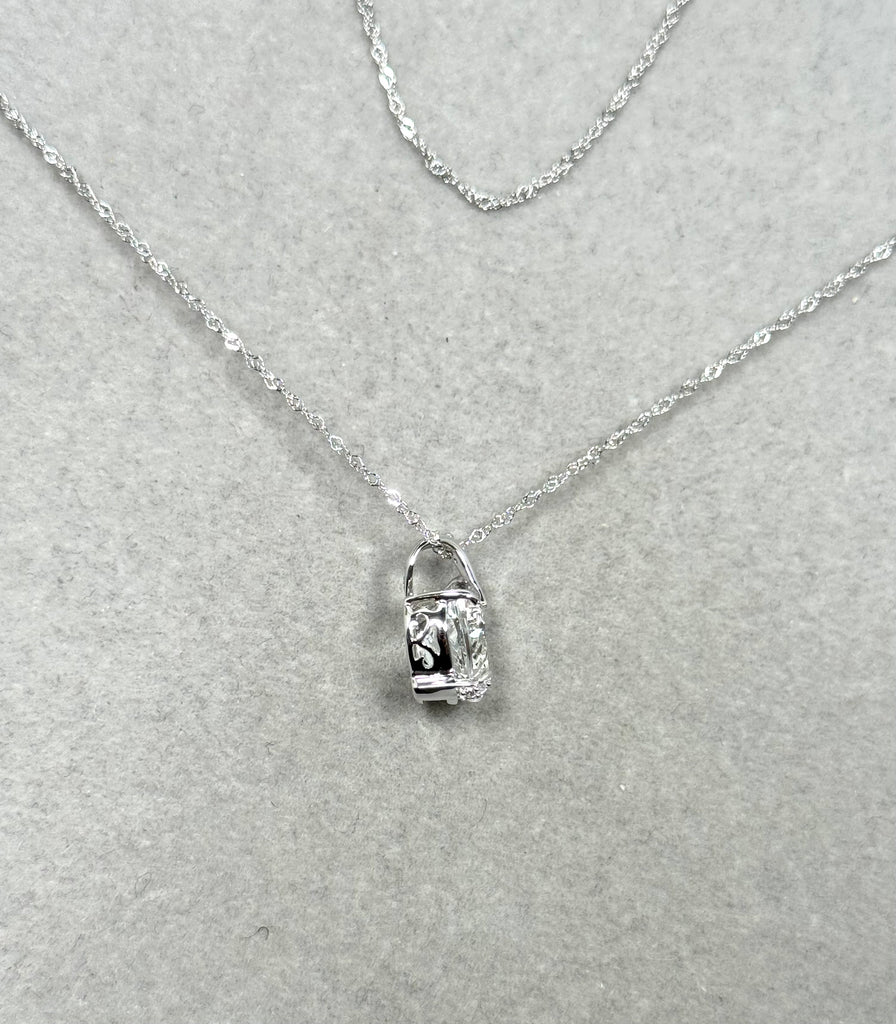 This elegant Heart-shape White Topaz Pendant in 14K White Gold features a natural transparent white topaz measuring 9 mm and weighing approximately 3.00 ct, accented with 0.03 ct of round natural diamonds. The gemstones are prong-set in polished rhodium-finished 14K white gold. The pendant includes an 18-inch Singapore chain secured with a spring-ring clasp.